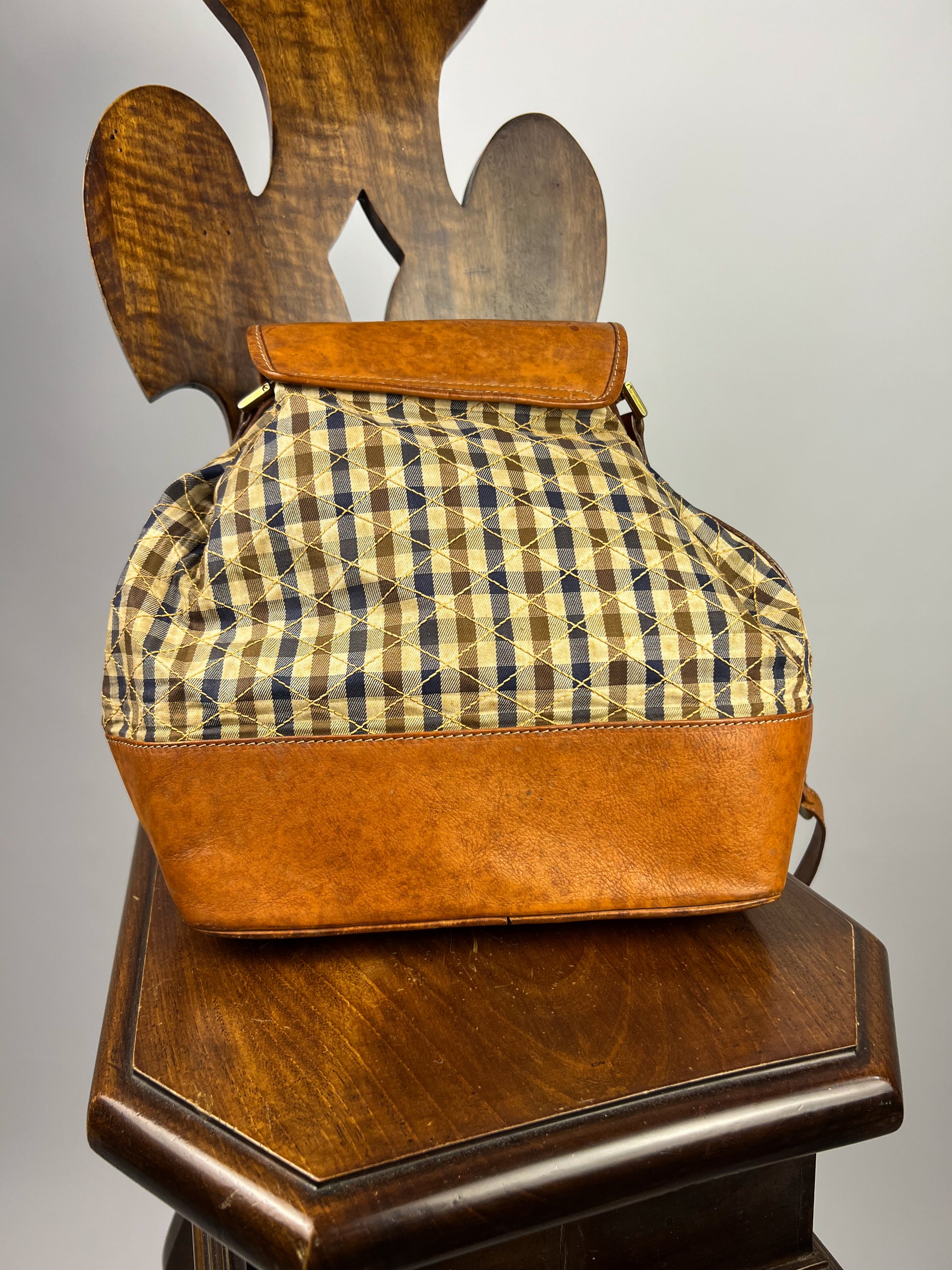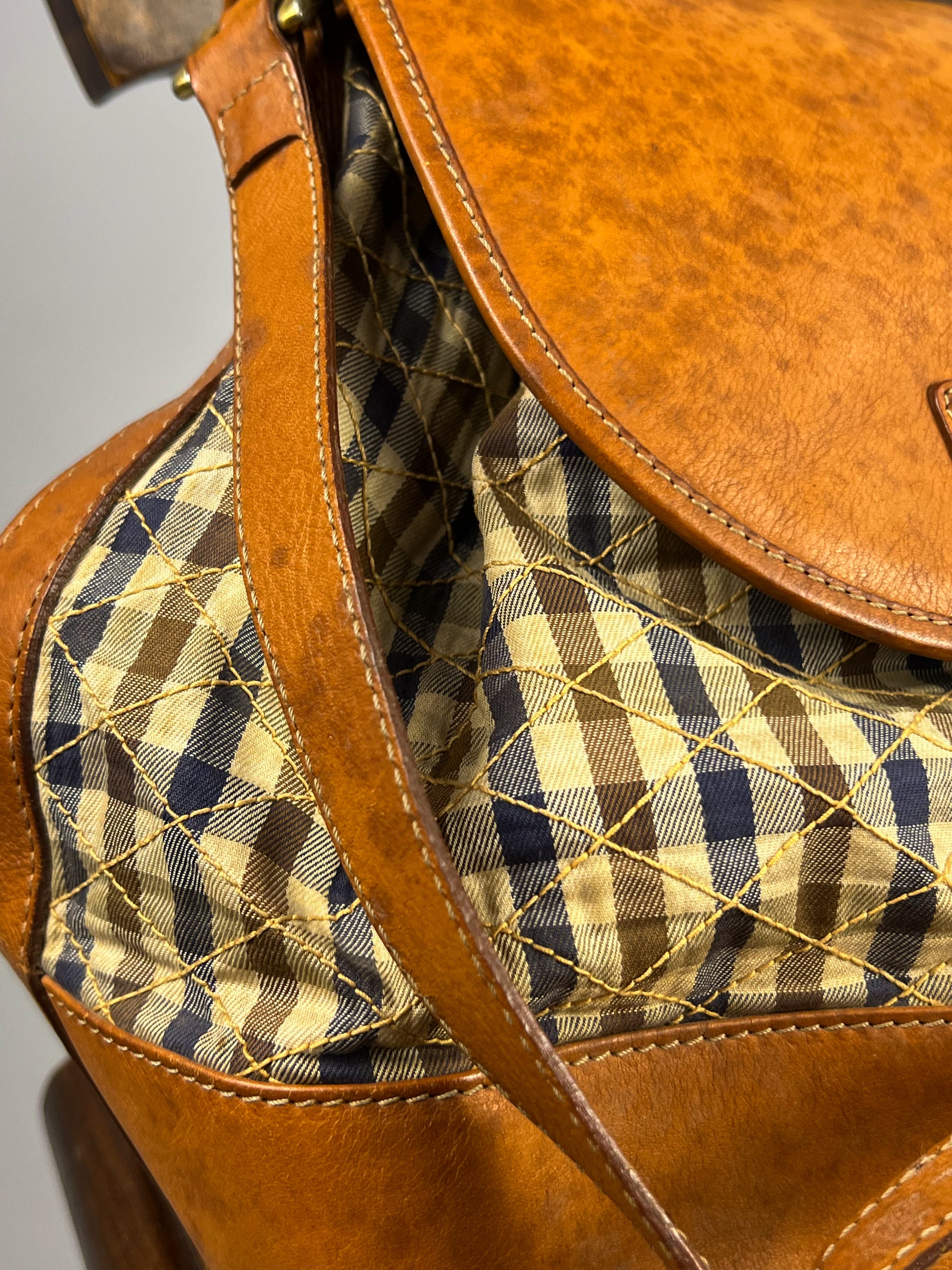 Aquascutum shoulder bag in brown leather and classic quilted tartan, soft cashmere lining, and adjustable shoulder strap. Includes dust bag .