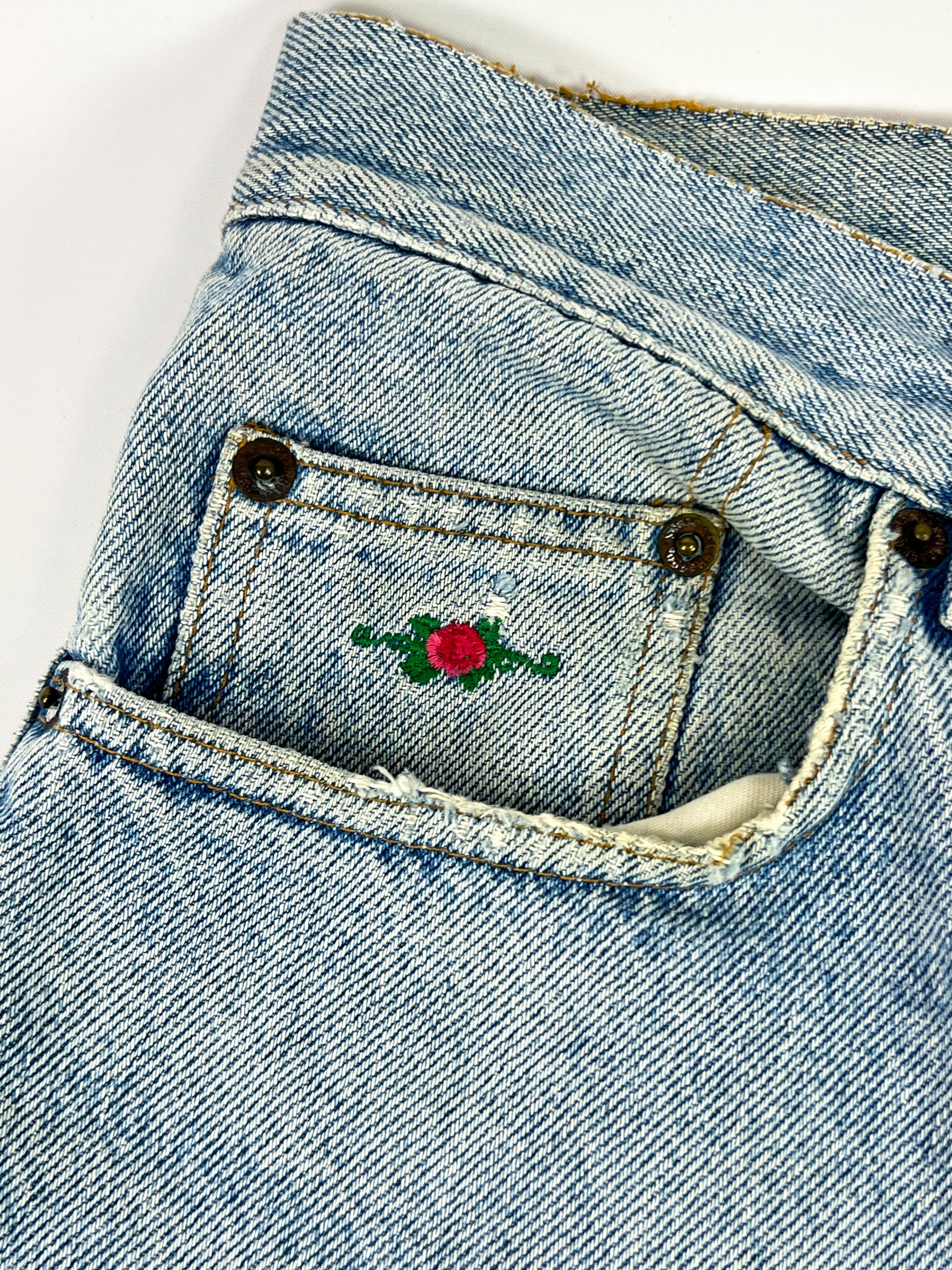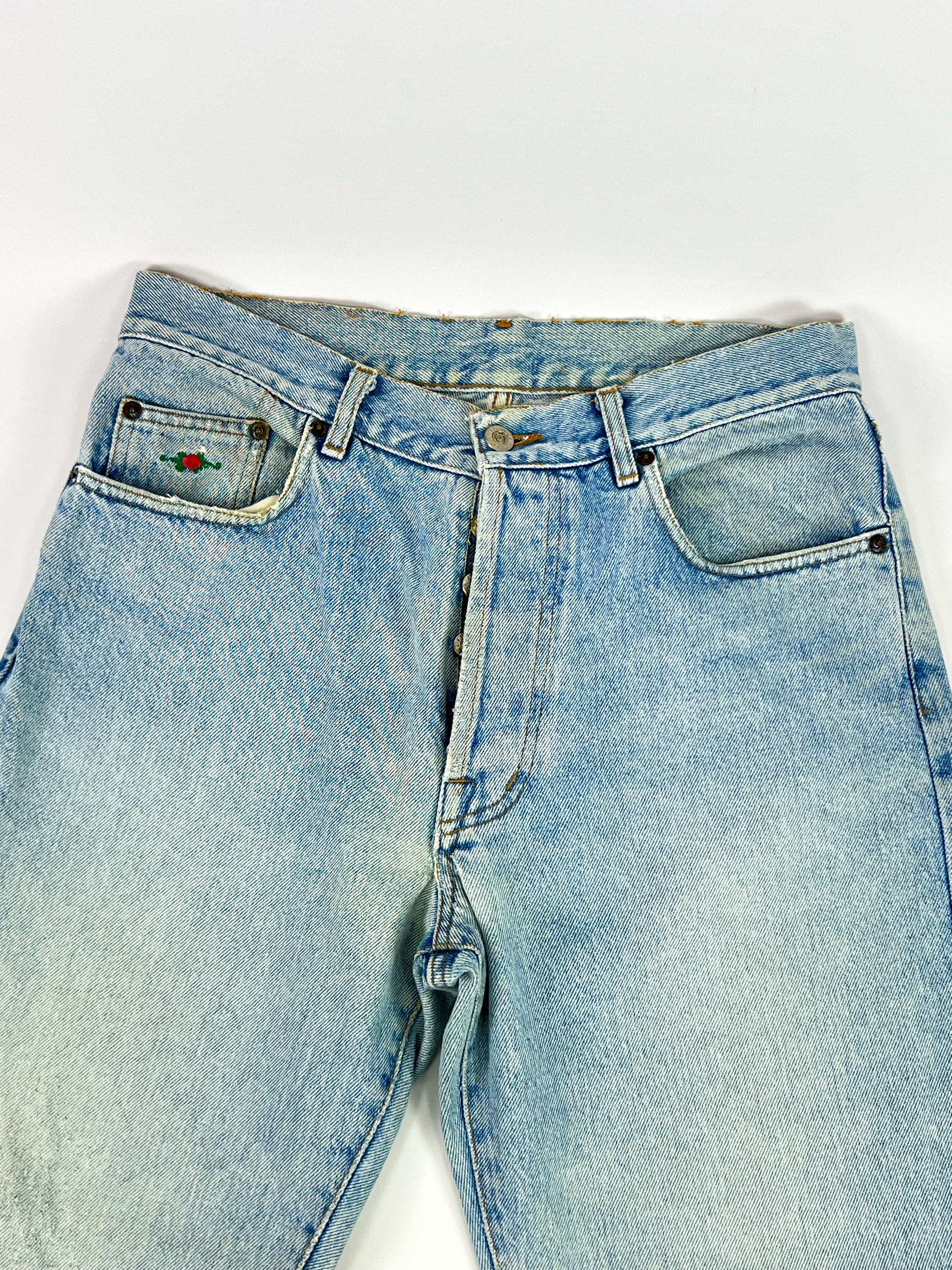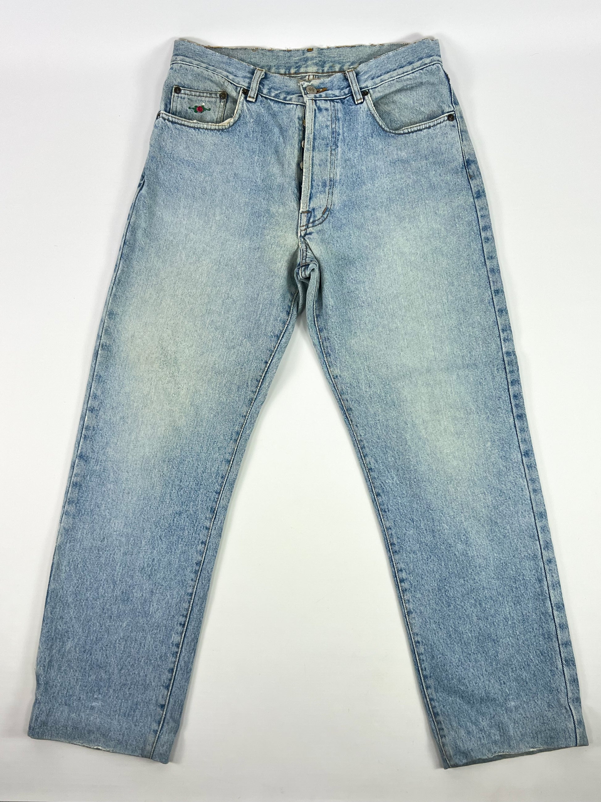 Regular-waisted, straight-leg style featuring the classic light blue wash typical of the era and iconic brand details, such as the decorated leather patch on the back and floral embroidery on the front pocket. The metal logo button closure and sturdy construction epitomize the quality of 1980s Italian denim.