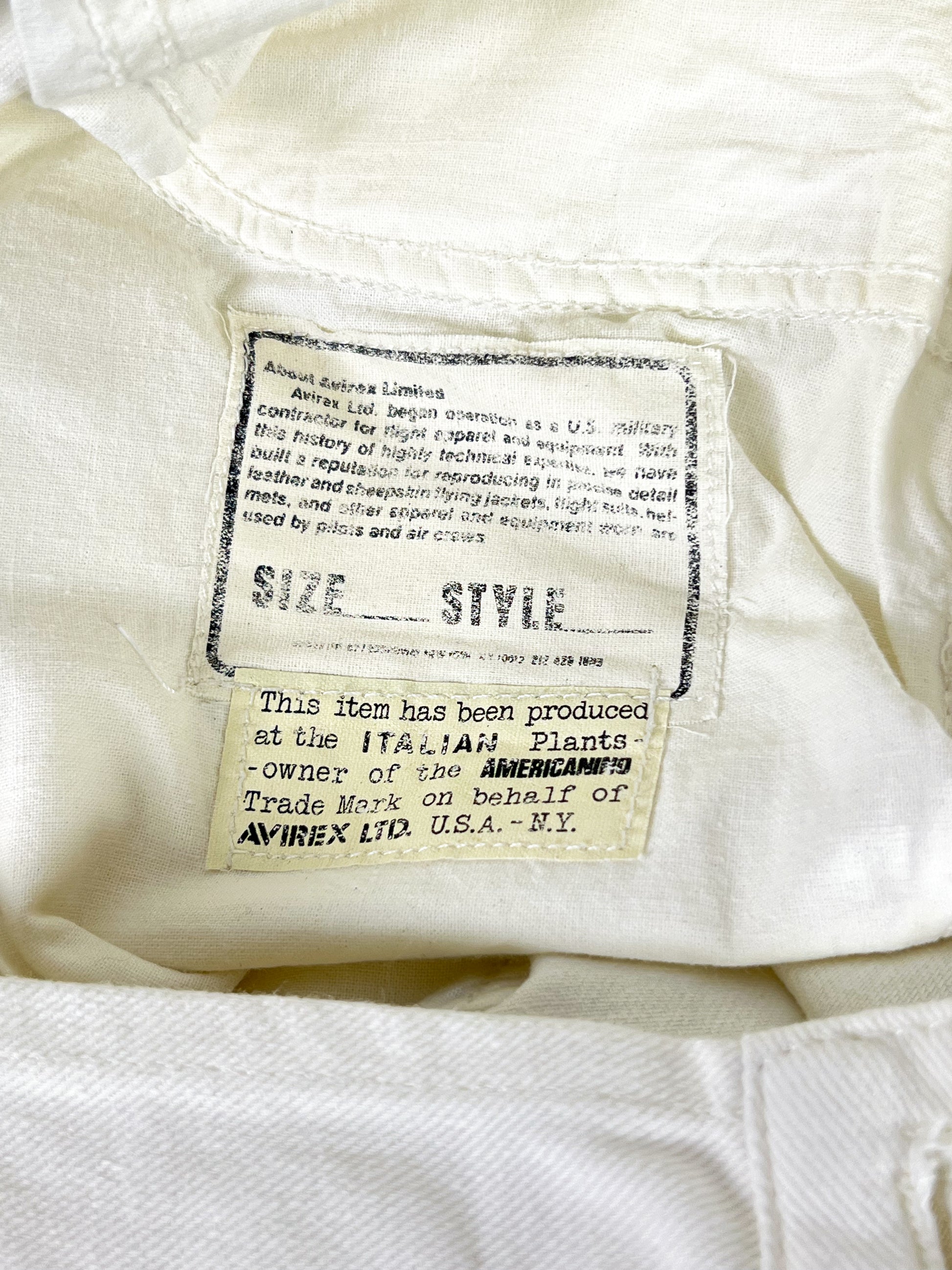 Colore bianco naturale, non ottico, chiusura frontale con bottoni marchiati Avirex, rivetti metallici e patch in cuoio Avirex U.S.A. sul retro.