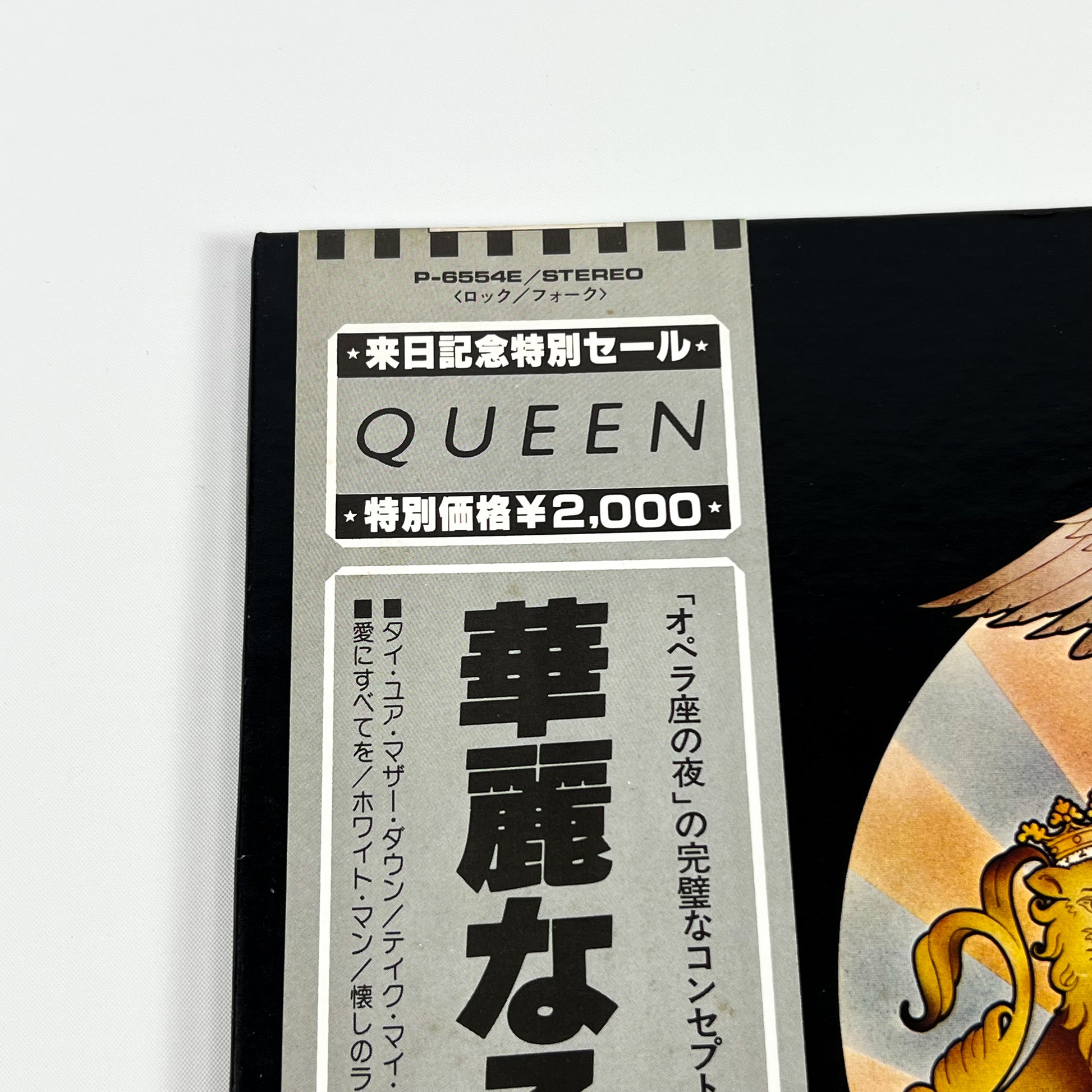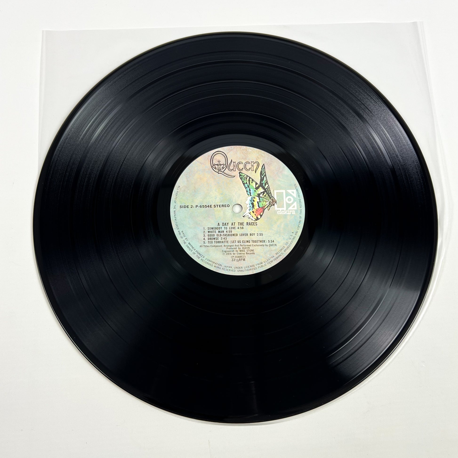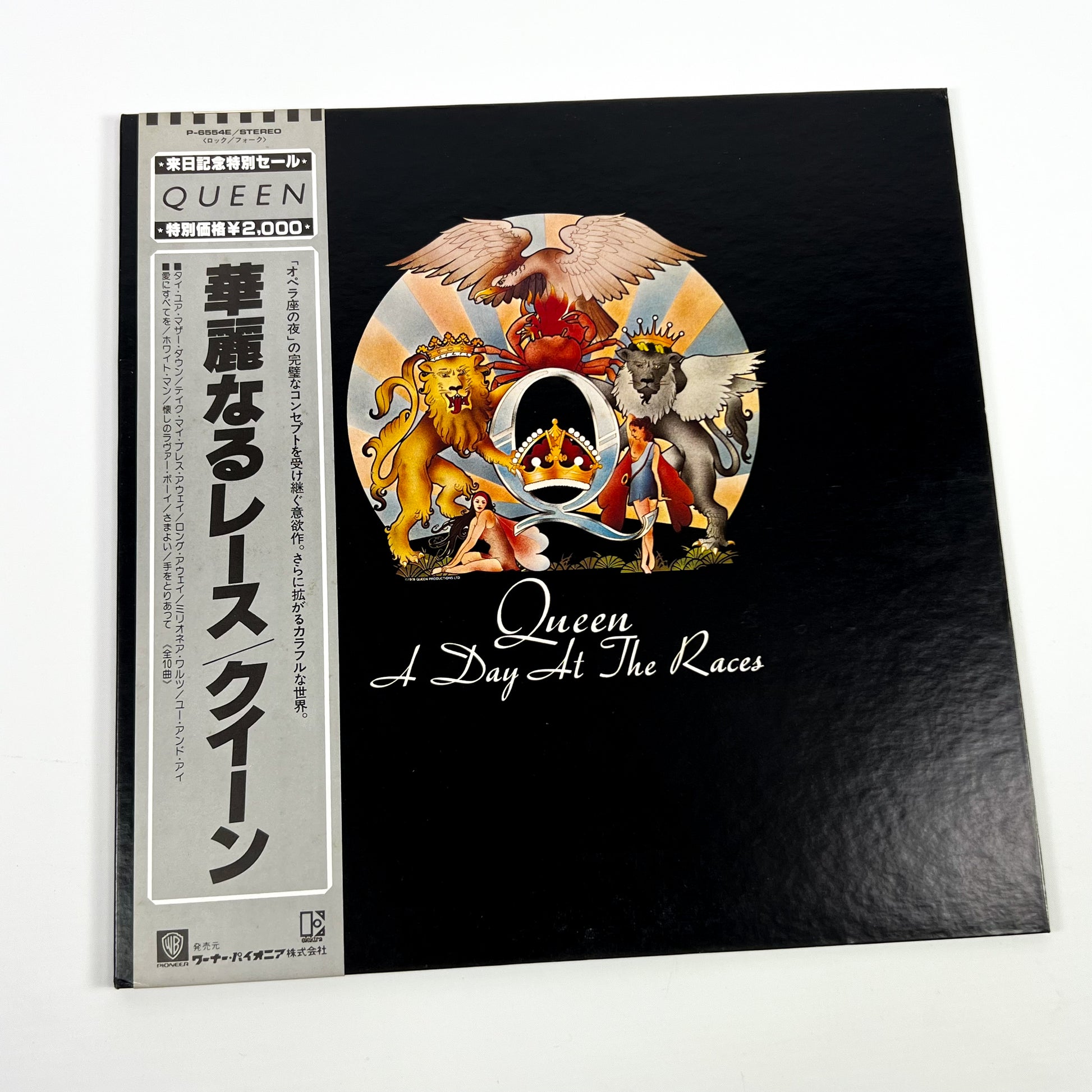 Pressage japonais de l'album « A Day At The Races » de Queen, sorti par Elektra/Warner-Pioneer Japan en 1981 sous le numéro de catalogue P-6554E, avec l'OBI gris original de 2 000 ¥.