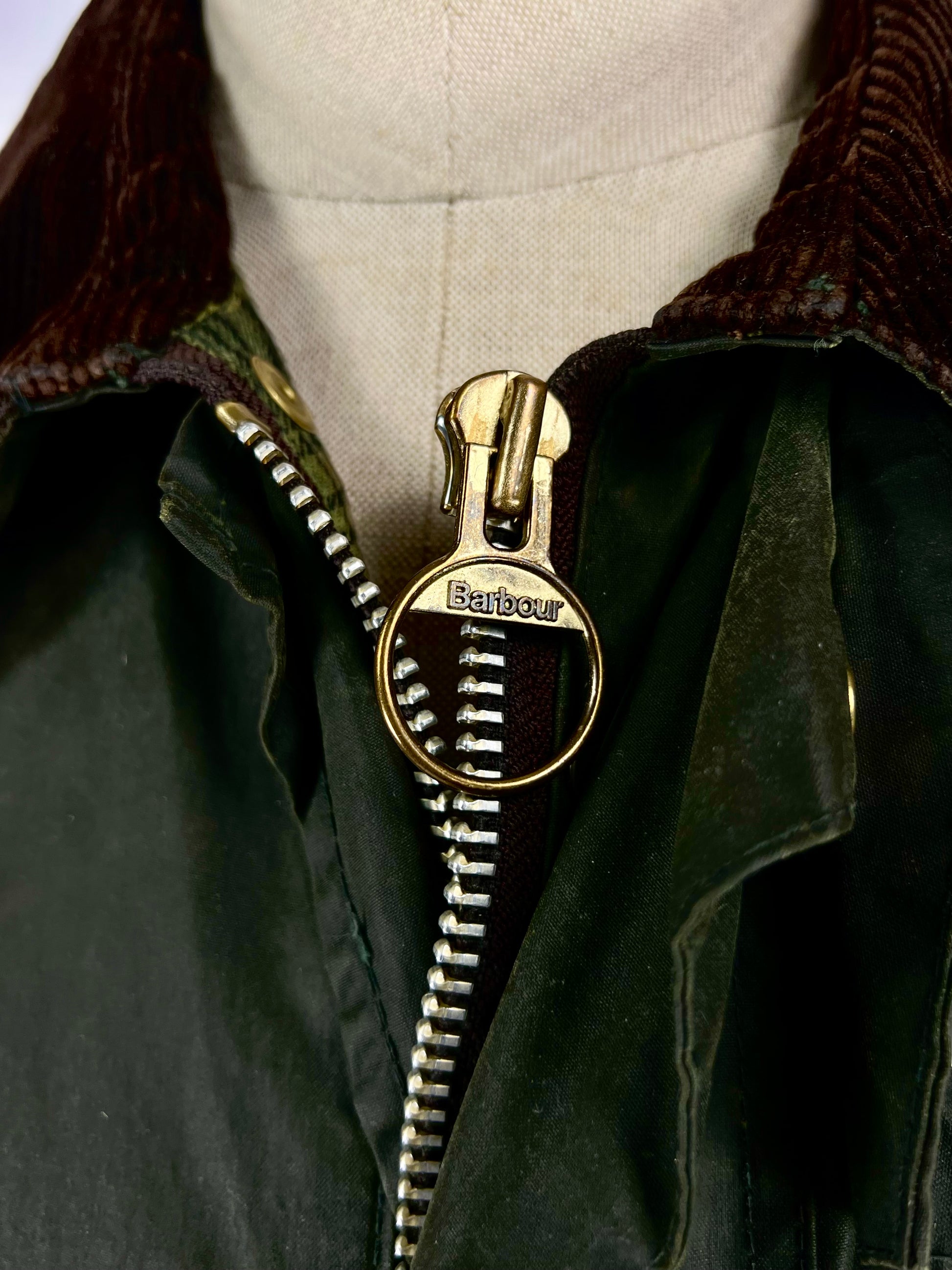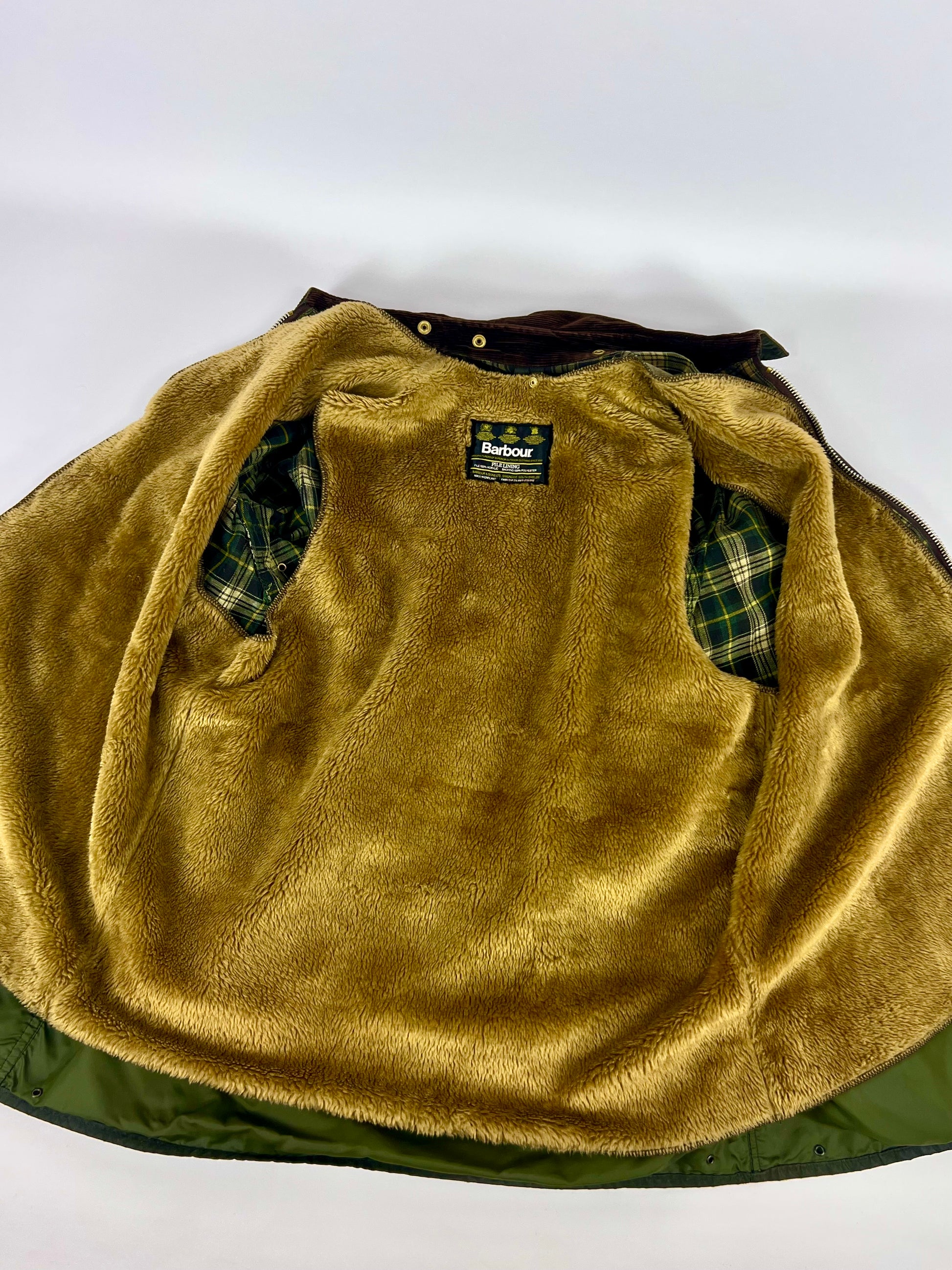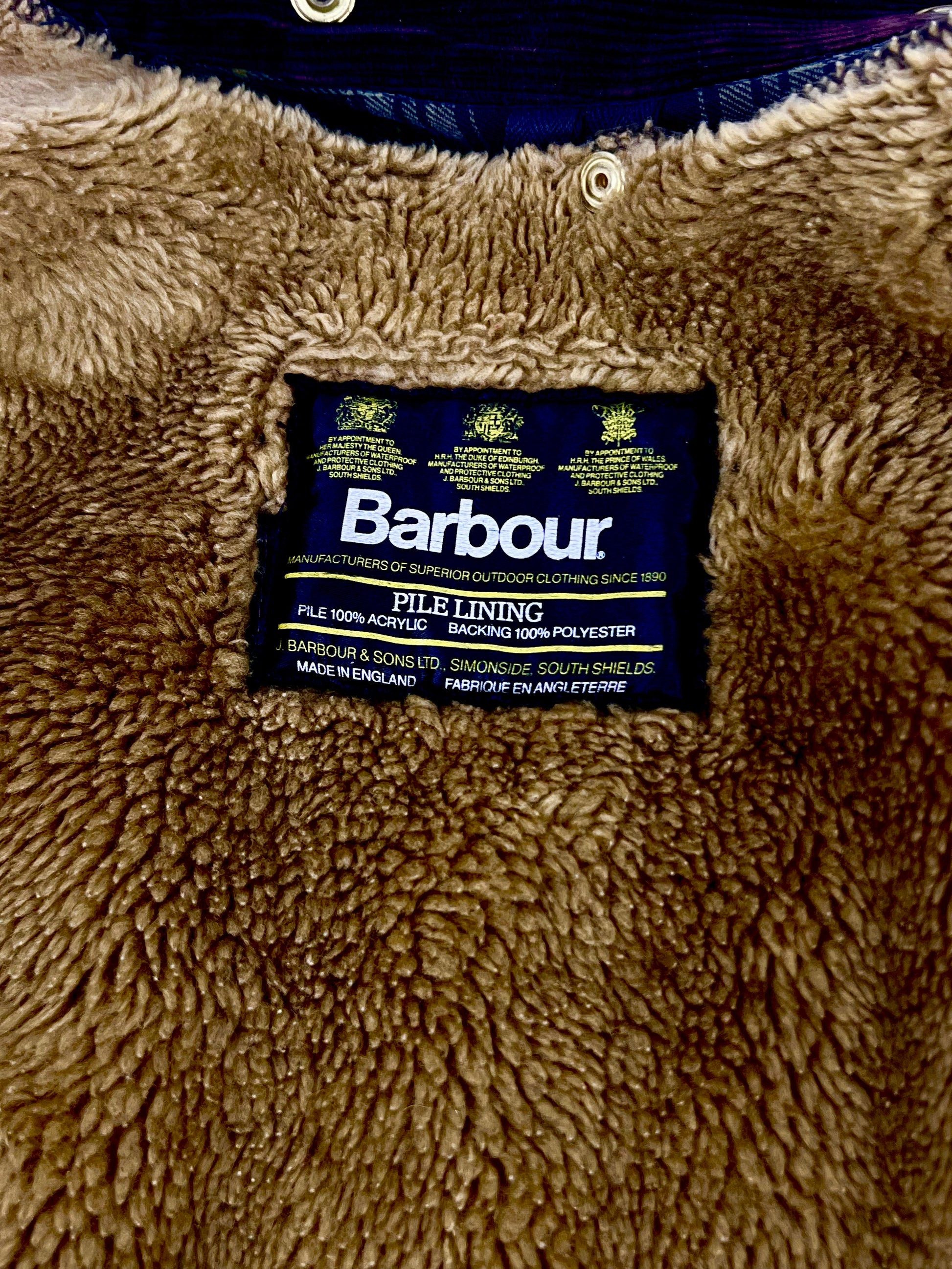 Modello con chiusura a zip e bottoni automatici, ampie tasche applicate, bottoni marchiati Barbour. Completo di spilla originale d’epoca e fodera in pelliccia sintetica removibile per l’uso invernale.
