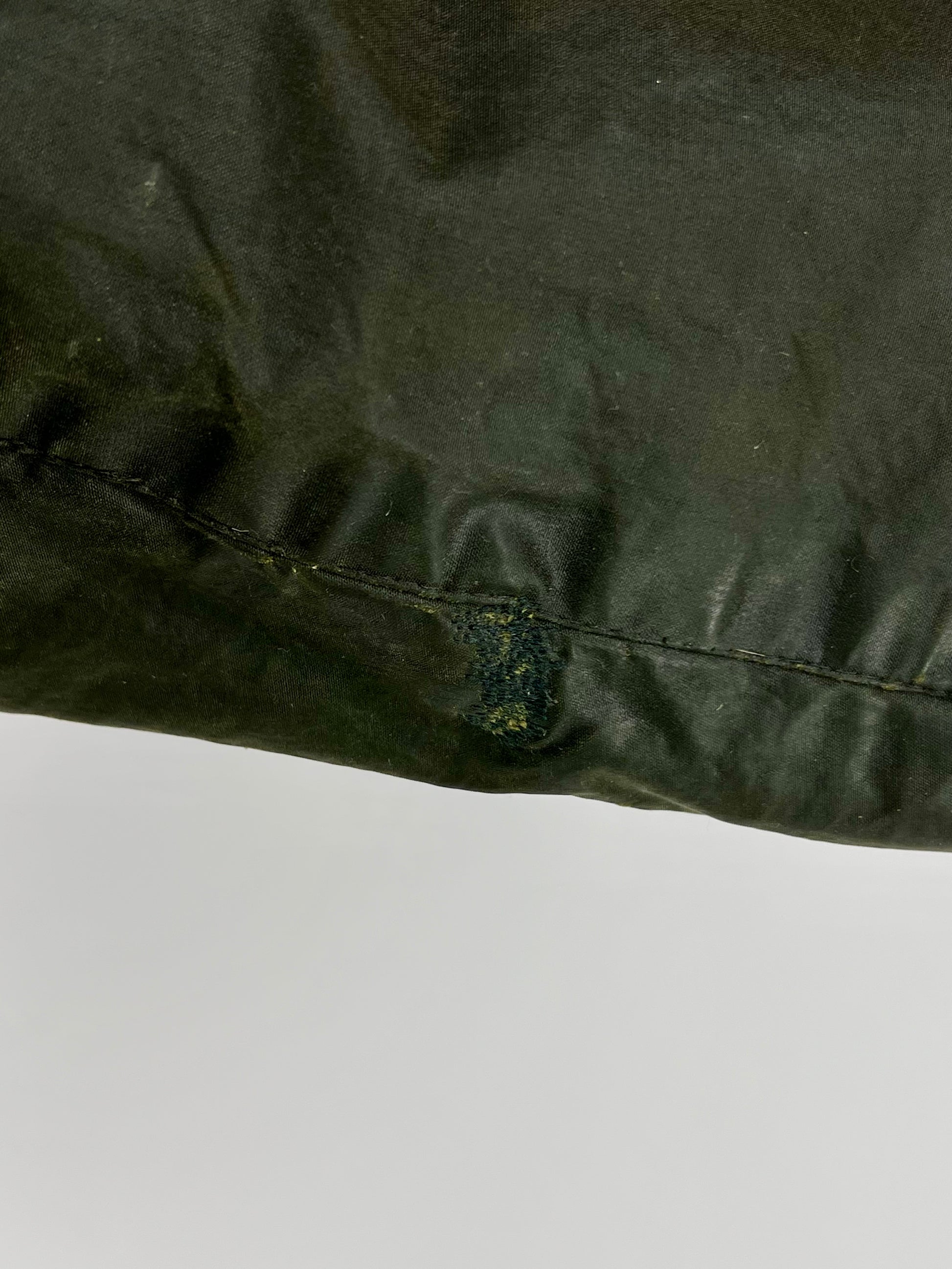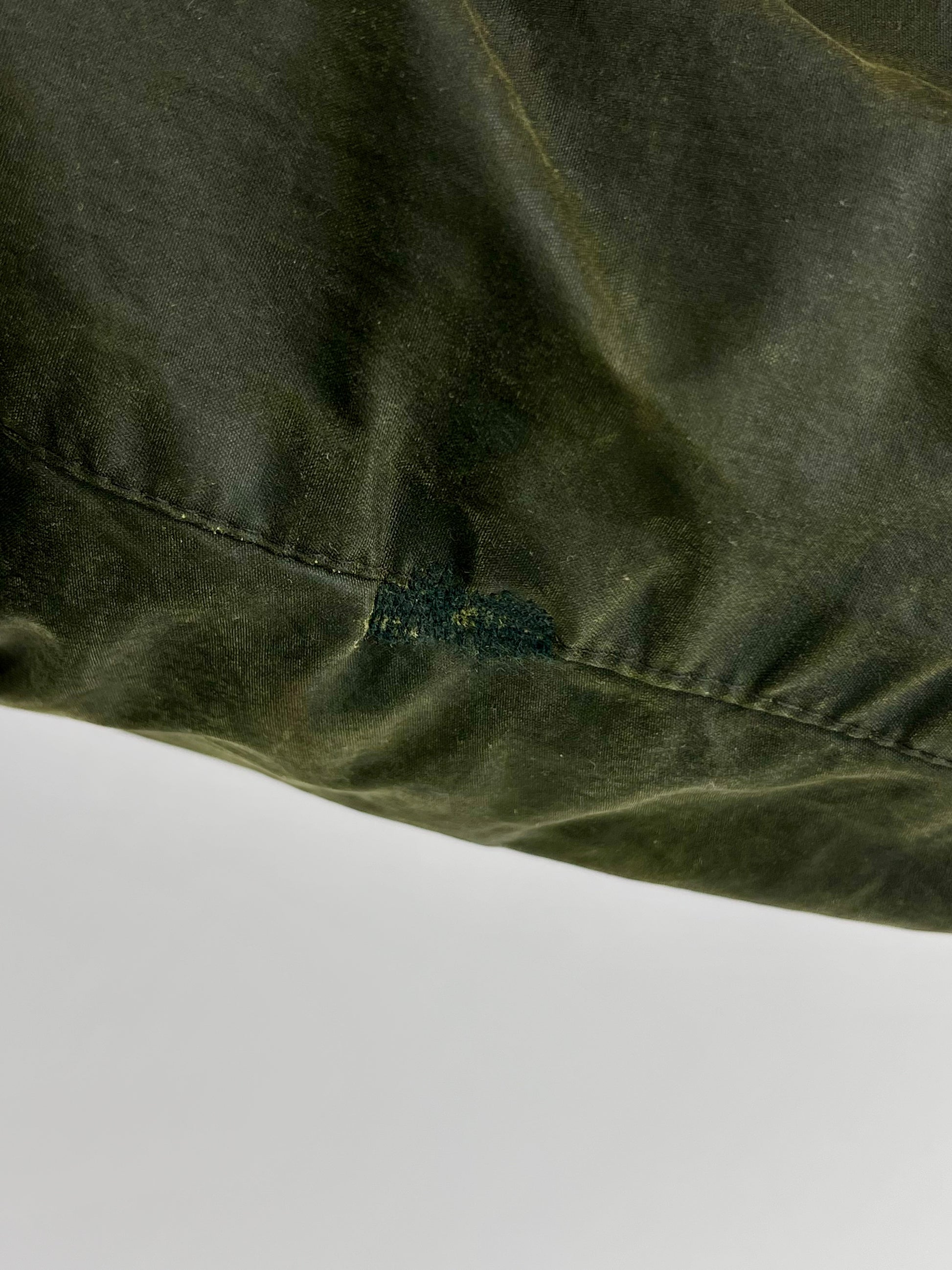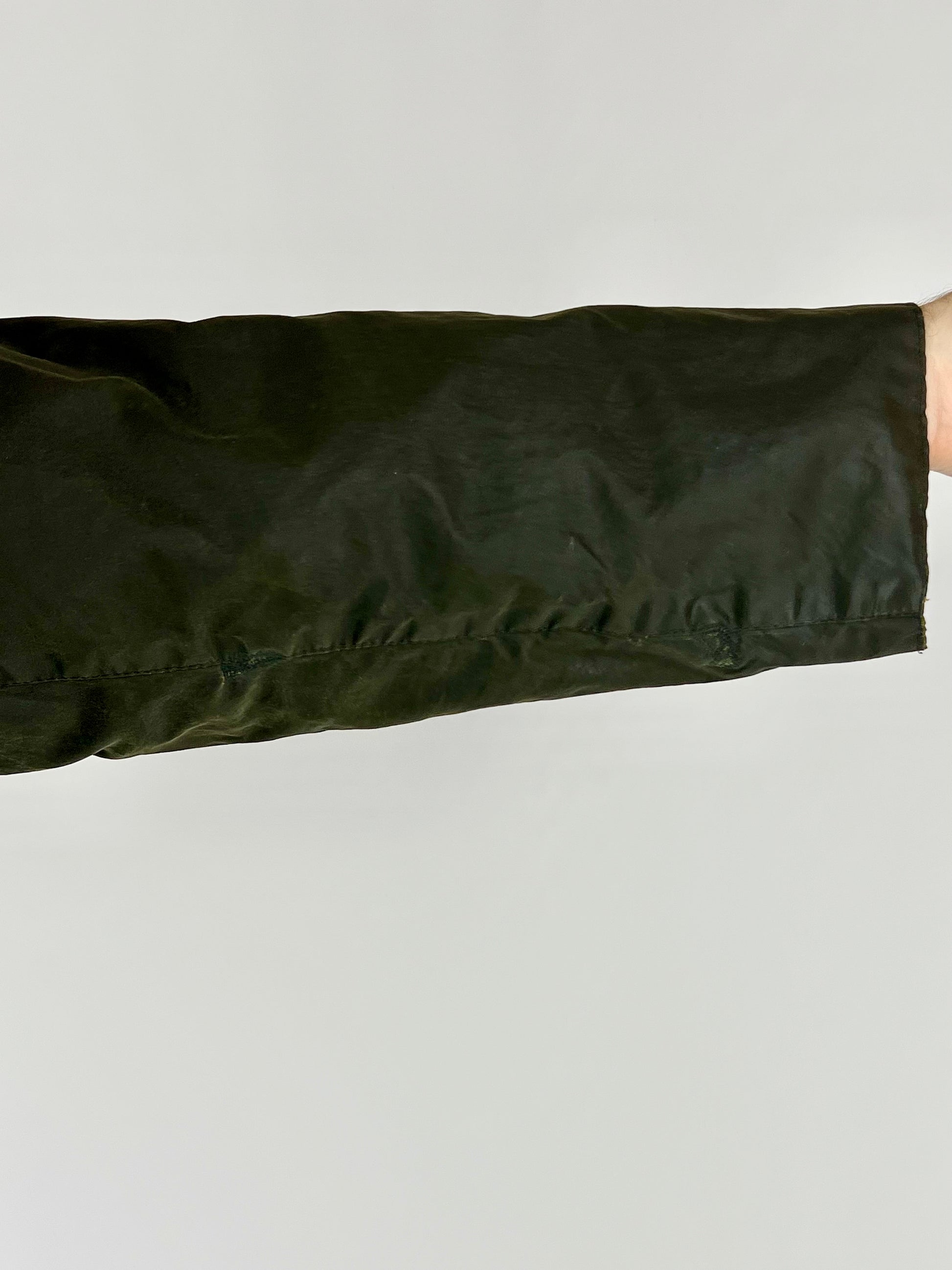 Modello con chiusura a zip e bottoni automatici, ampie tasche applicate, bottoni marchiati Barbour. Completo di spilla originale d’epoca e fodera in pelliccia sintetica removibile per l’uso invernale.