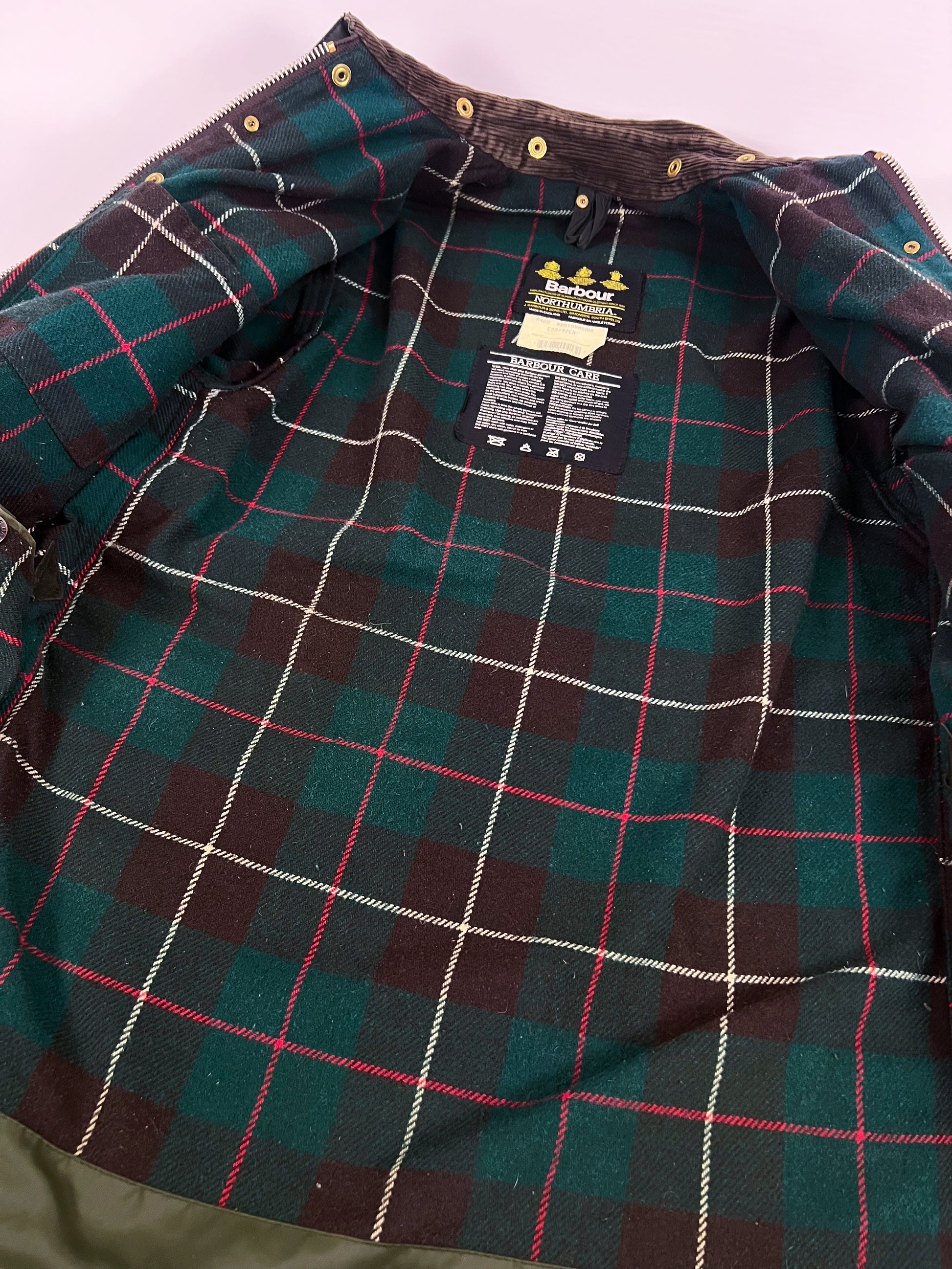 Raro Barbour Northumbria vintage, realizzato in cotone cerato pesante color verde oliva, colletto in velluto a coste marrone e fodera in tartan scozzese (realizzata in lana pesante) tipica del brand.