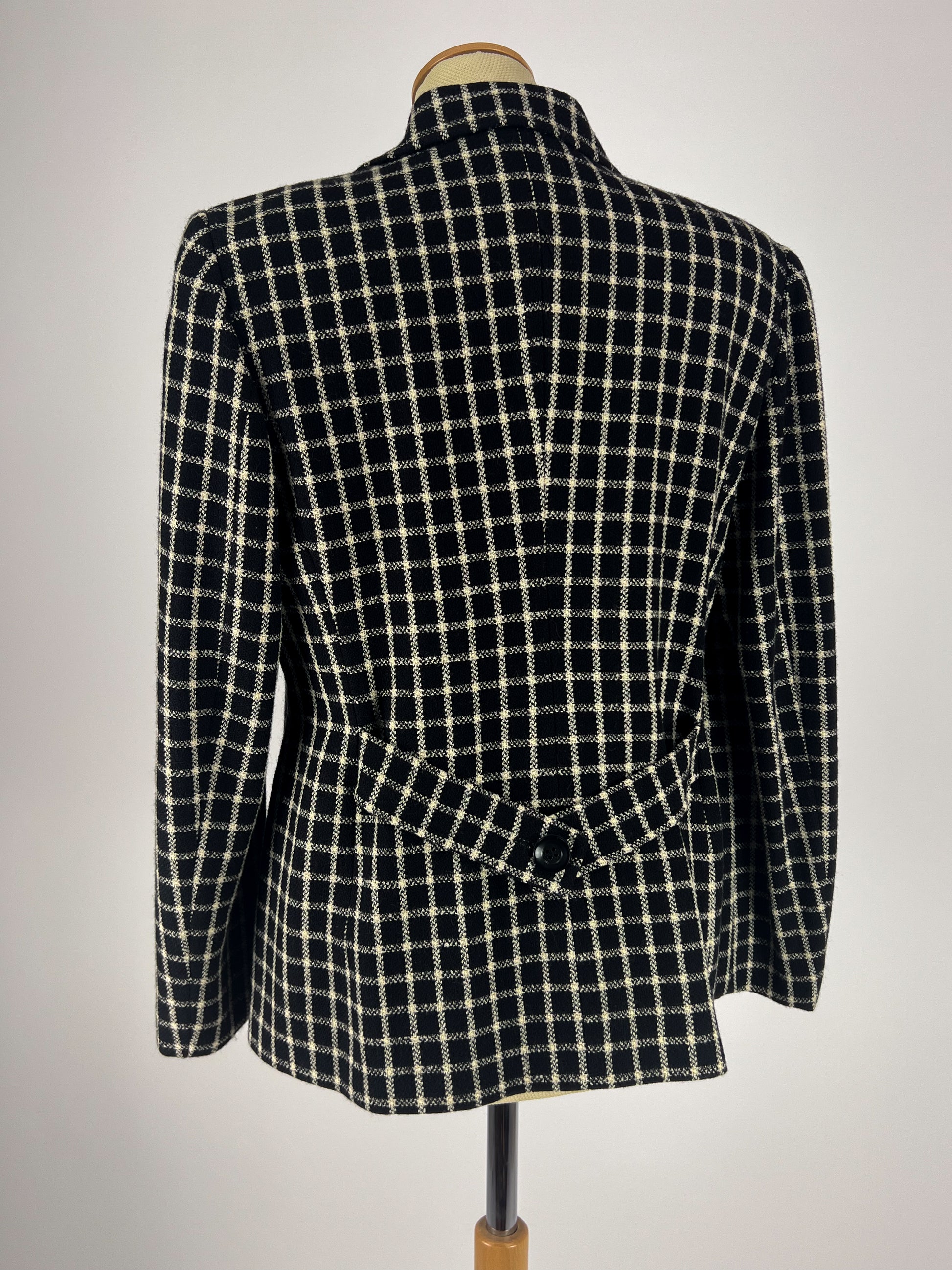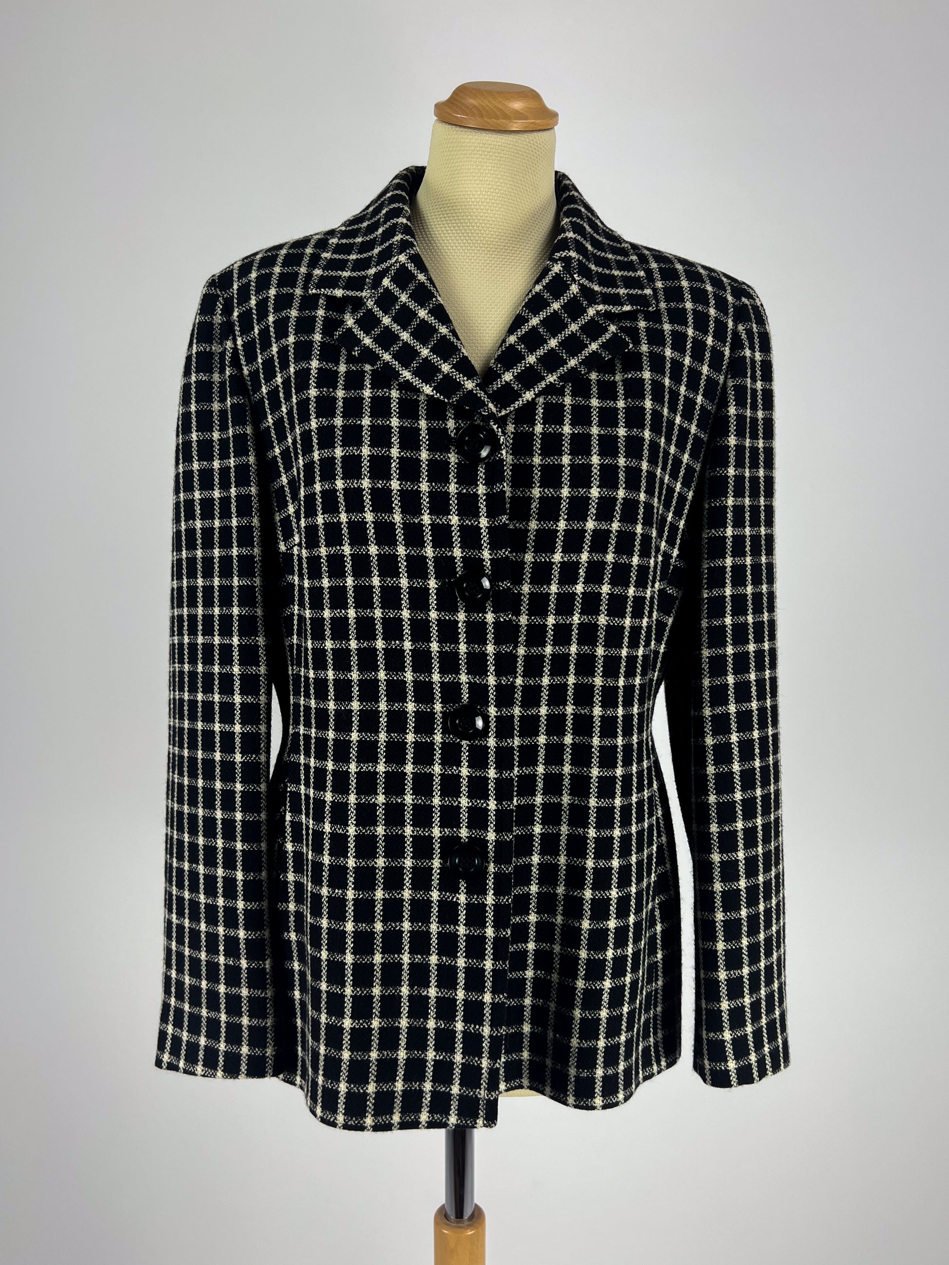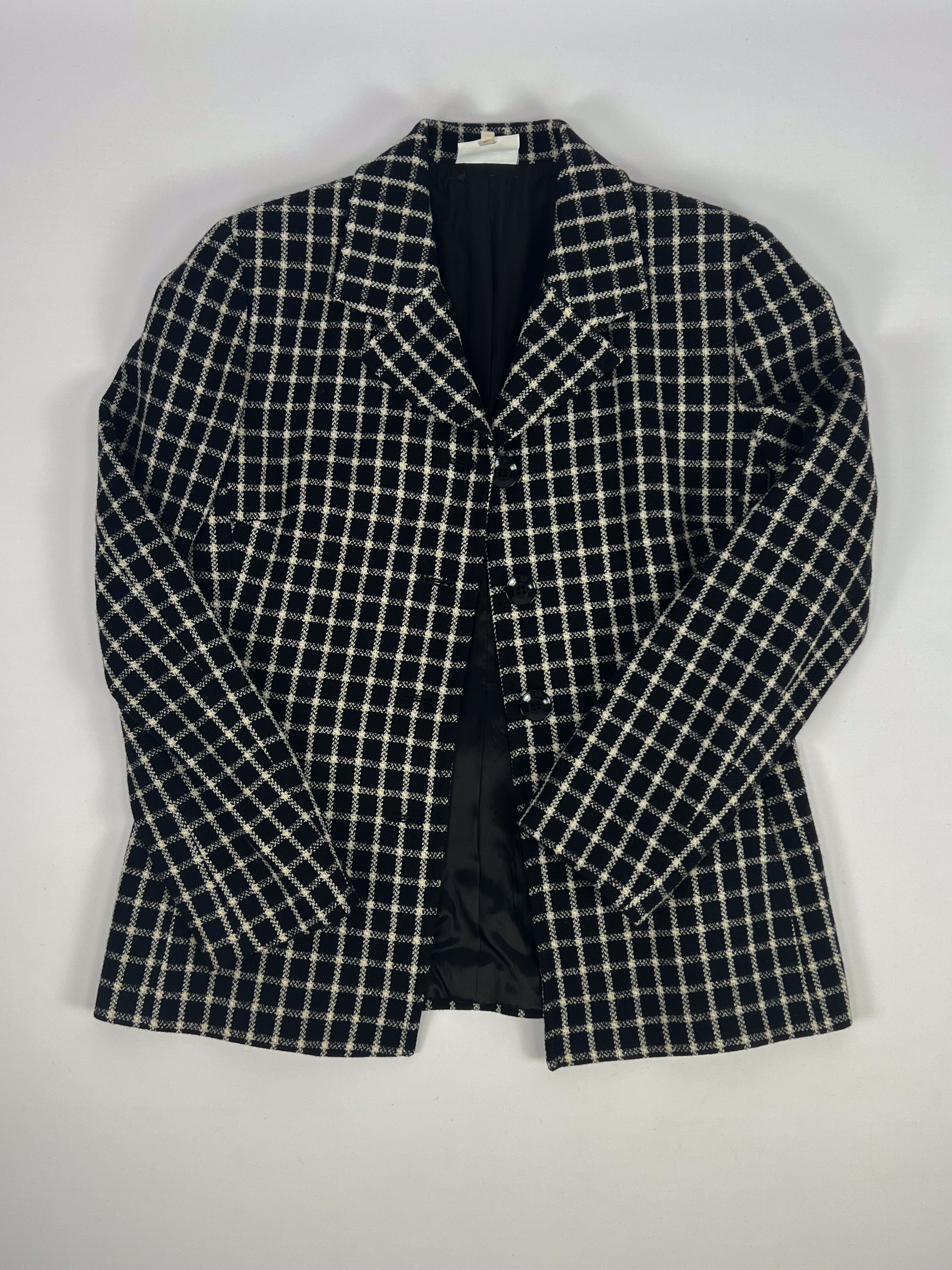 Blazer vintage anni ’70 realizzato in pura lana vergine con raffinata fantasia a quadri bianchi e neri. Presenta un taglio sartoriale classico con collo a revers, chiusura frontale a tre bottoni e tasche laterali. La linea dritta leggermente svasata e la spalla strutturata conferiscono eleganza e versatilità.
