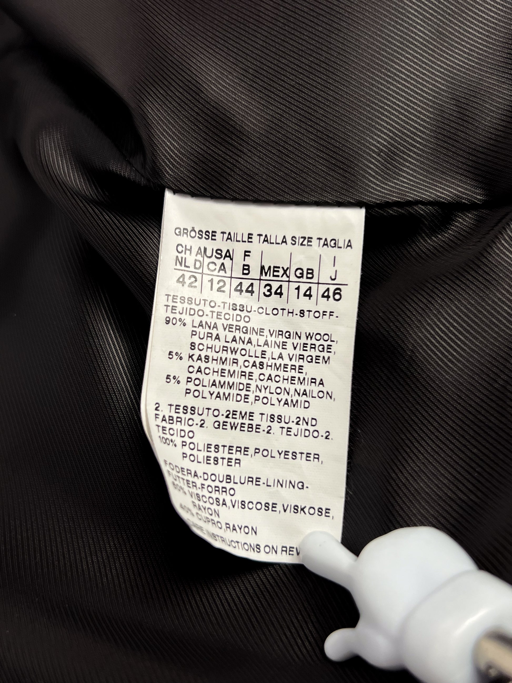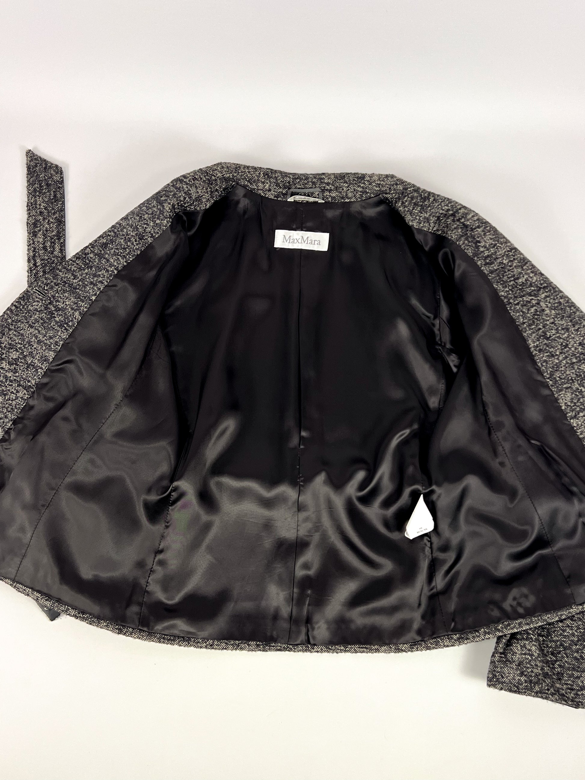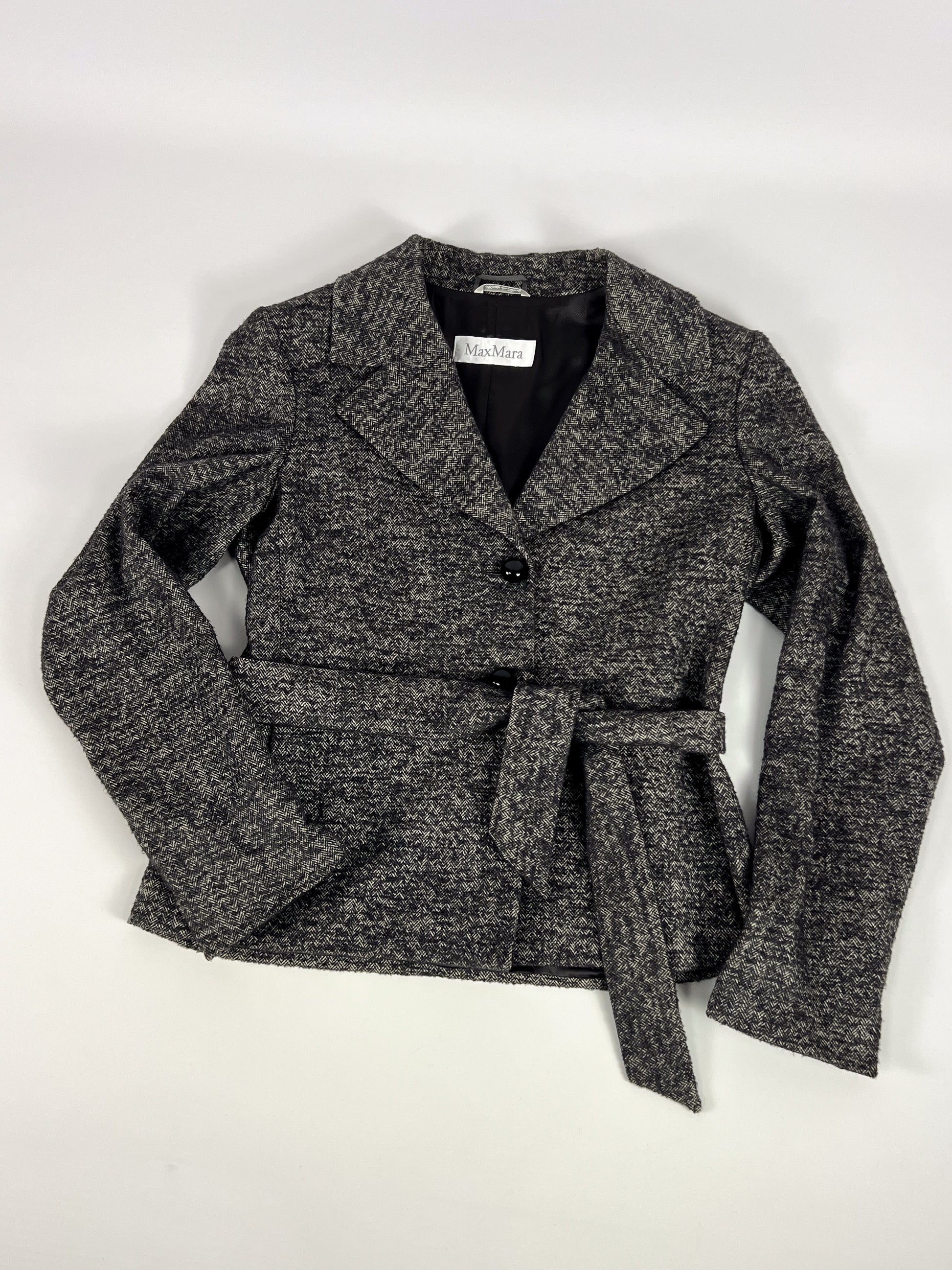 Blazer vintage Max Mara Y2K, realizzato in pregiata lana vergine e cashmere, caratterizzato da una texture Harringbone nei toni del grigio e nero che conferisce al capo un’eleganza senza tempo. Il modello presenta una linea femminile e strutturata, valorizzata dalla chiusura frontale con bottoni neri e dalla cintura coordinata in vita, che definisce la silhouette con raffinatezza.