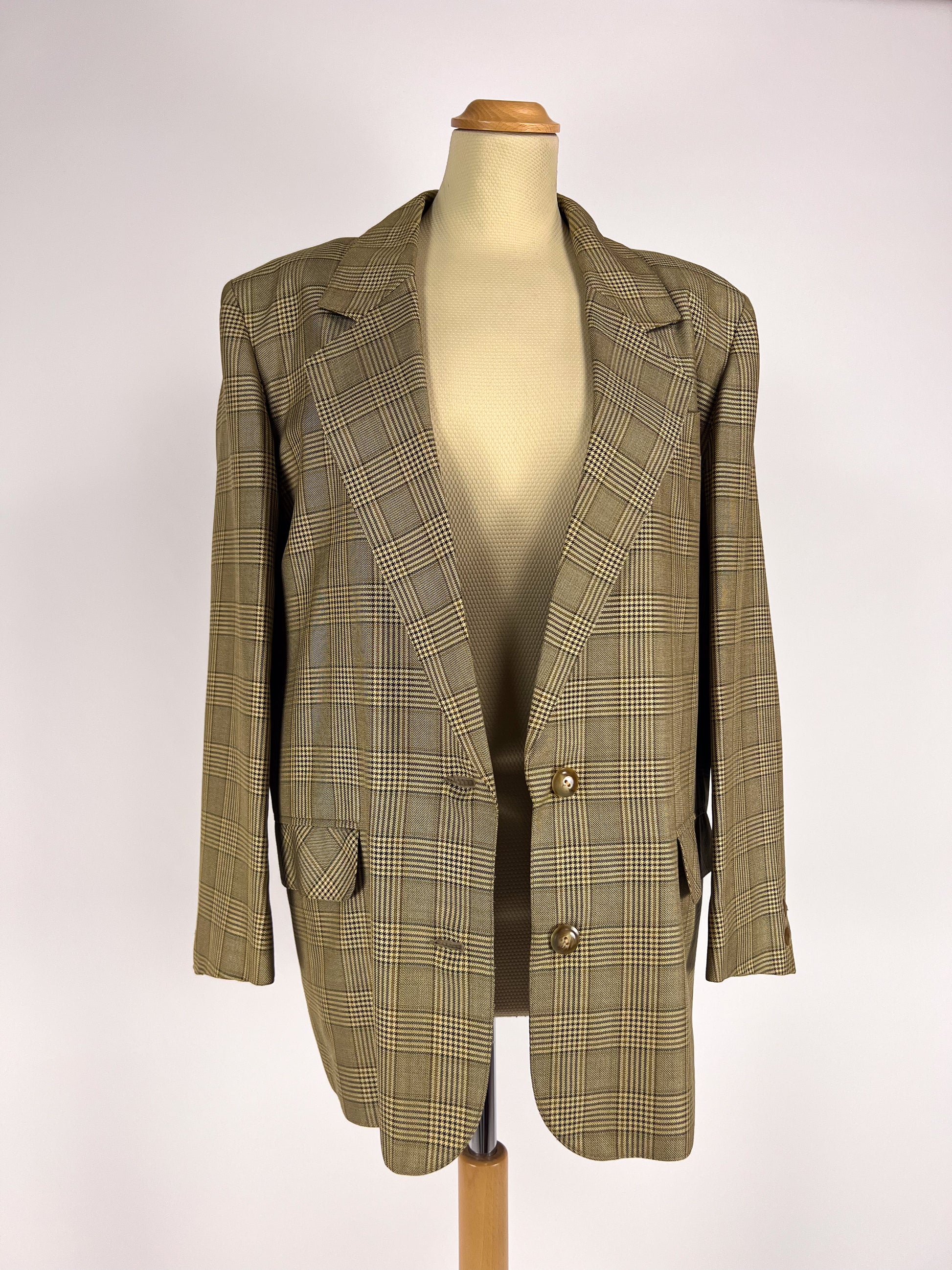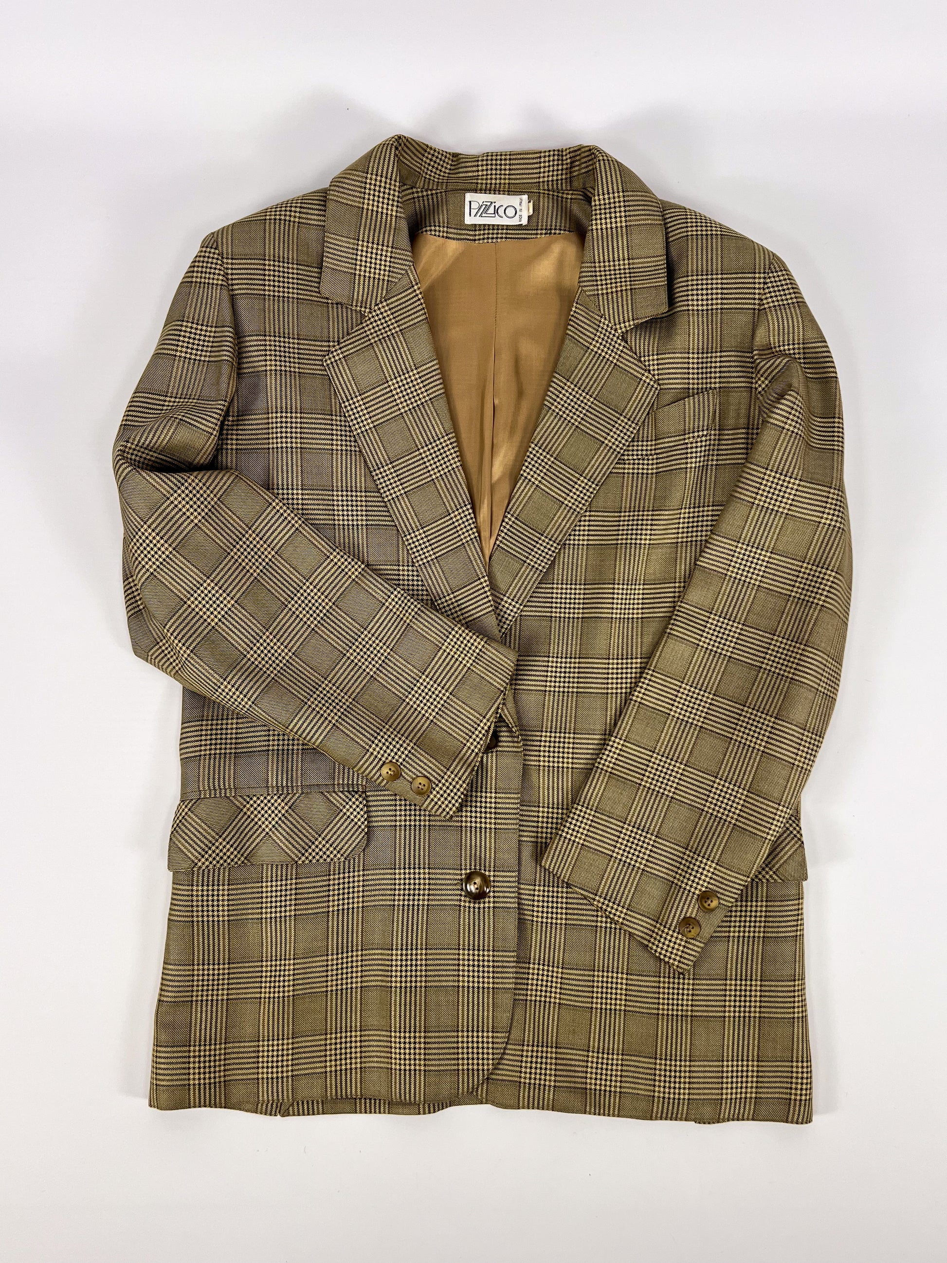 Iconico blazer sartoriale italiano anni ’70 firmato Pizico, realizzato in un elegante tessuto Principe di Galles nei toni del beige, marrone e nero.