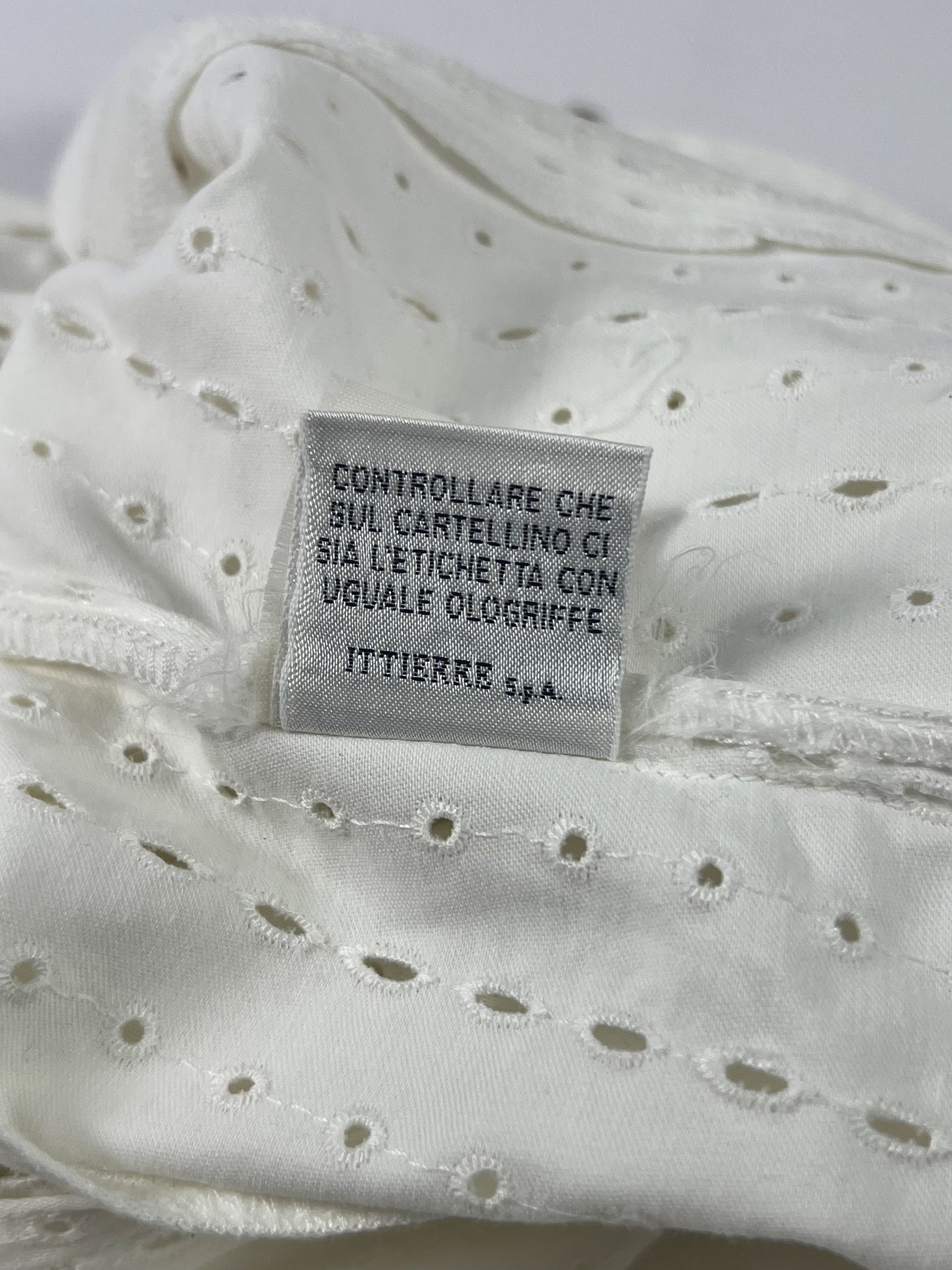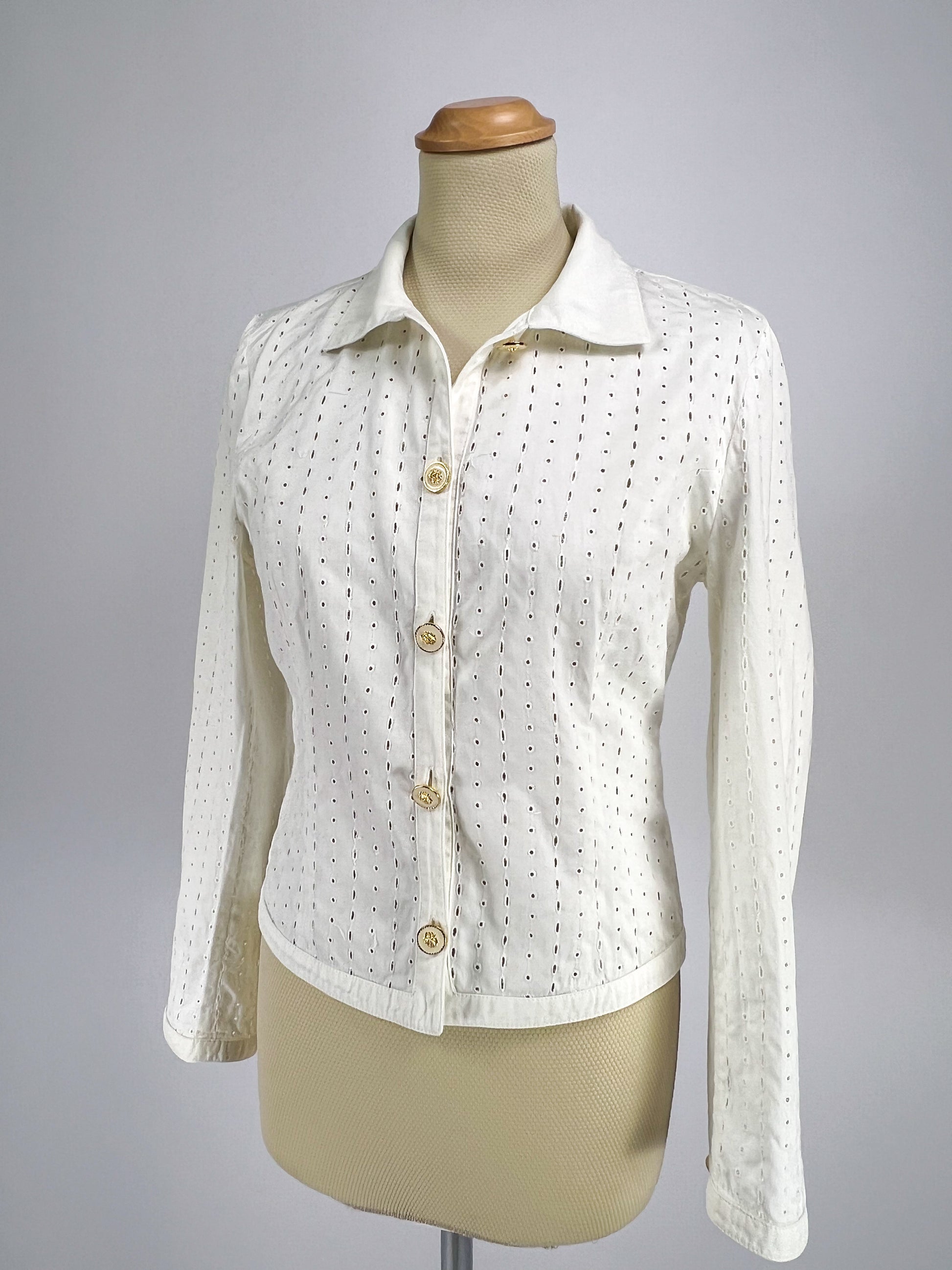 Unica nel design questa camicia firmata Gianni Versace, realizzata in puro cotone ed impreziosita da un particolare motivo in micro-fori e bottoni d’orati a tema floreale.