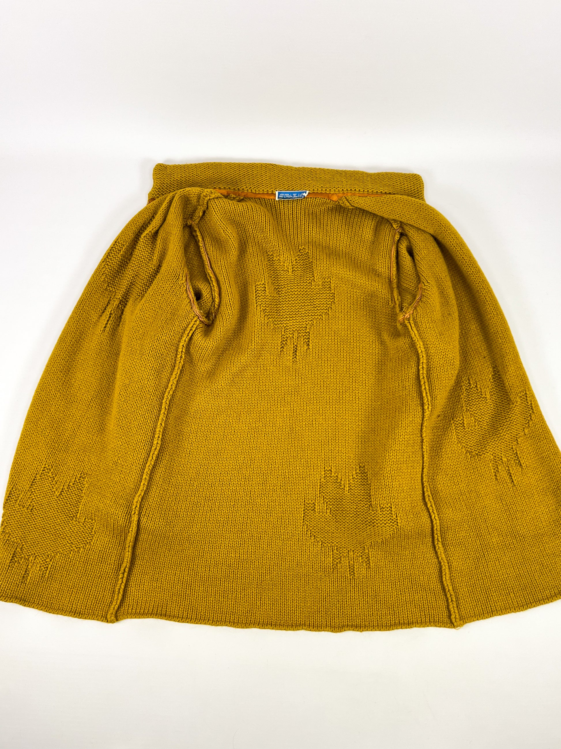 Cappotto in maglia firmato Spazio, realizzato negli anni ’70 in un filato morbido e corposo dal caratteristico colore senape, caldo e luminoso.