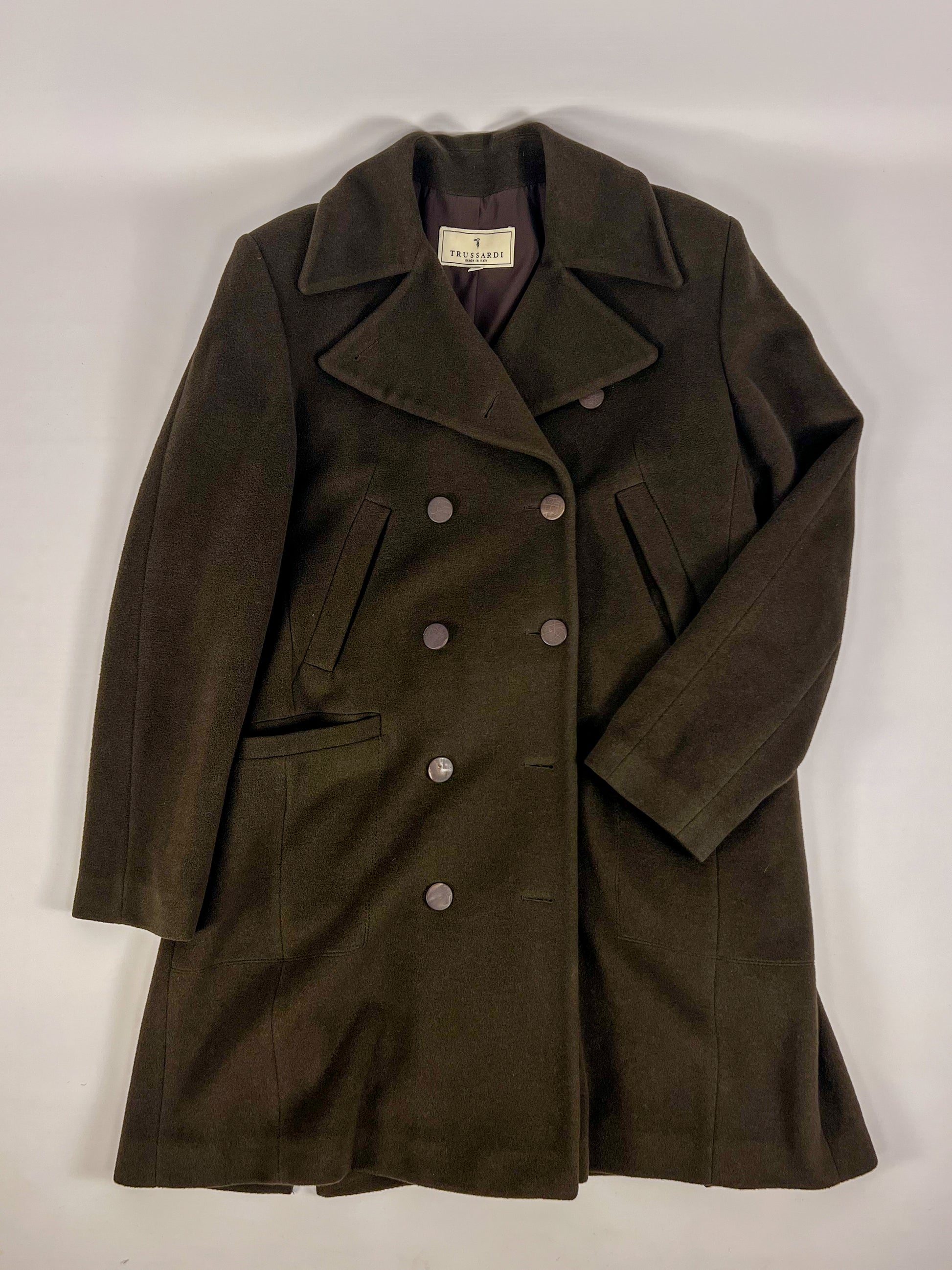 Elegante cappotto Trussardi realizzato in Italia in un pregiato mix di lana (60%), angora (30%) e cashmere (10%).