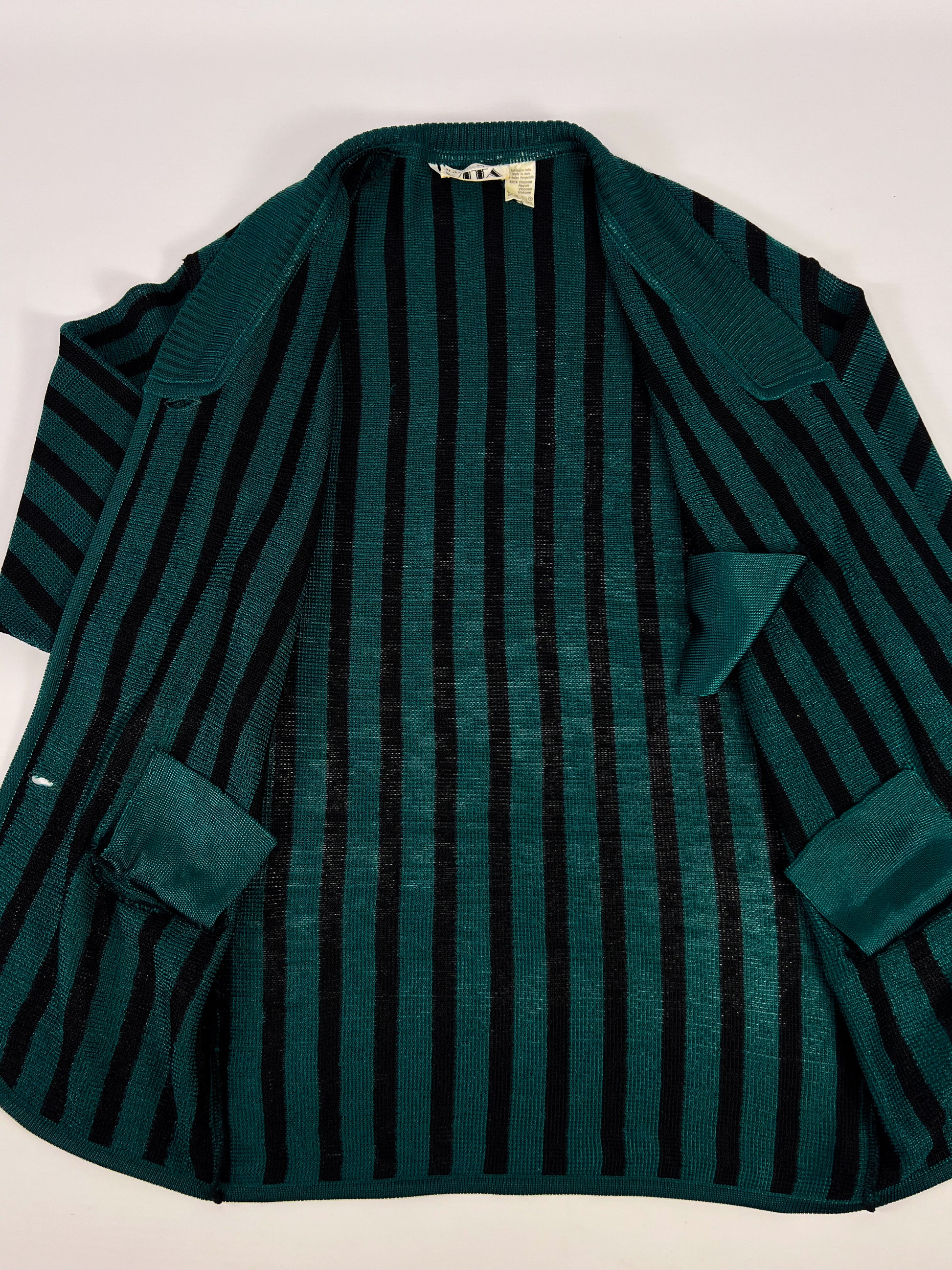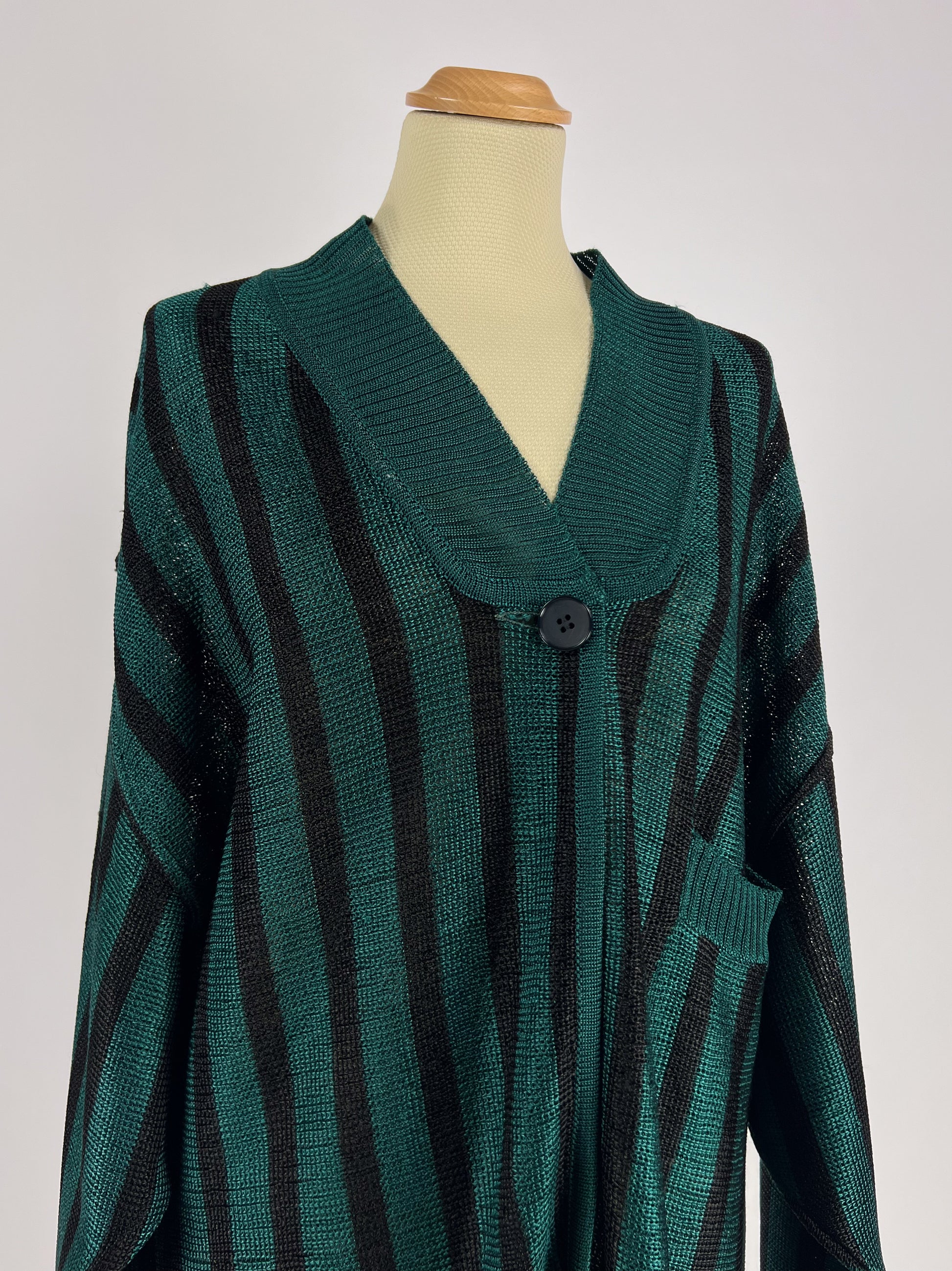 Il filato leggero e lucido, caratterizzato da righe verticali nei toni del verde petrolio e del nero, conferisce al capo un look elegante e distinto.