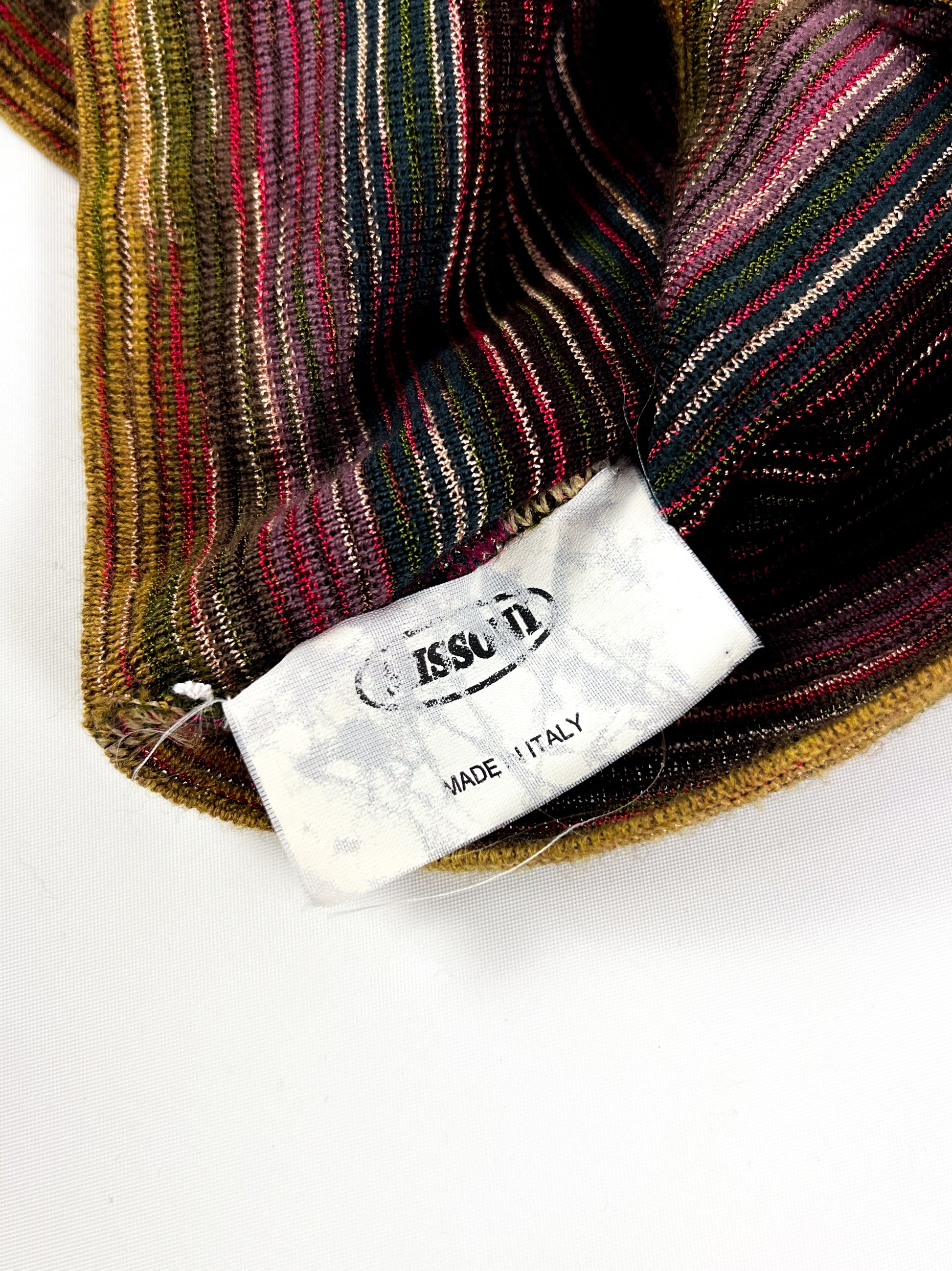 Capo iconico firmato Missoni Prima Linea, caratterizzato dall’inconfondibile lavorazione a righe multicolore tipica della maison. Il cardigan presenta una palette ricca e vibrante di tonalità calde e fredde – tra cui senape, bordeaux, verde oliva, viola e accenti scuri – intrecciate in una maglia sottile e dinamica che crea un effetto visivo unico e immediatamente riconoscibile.