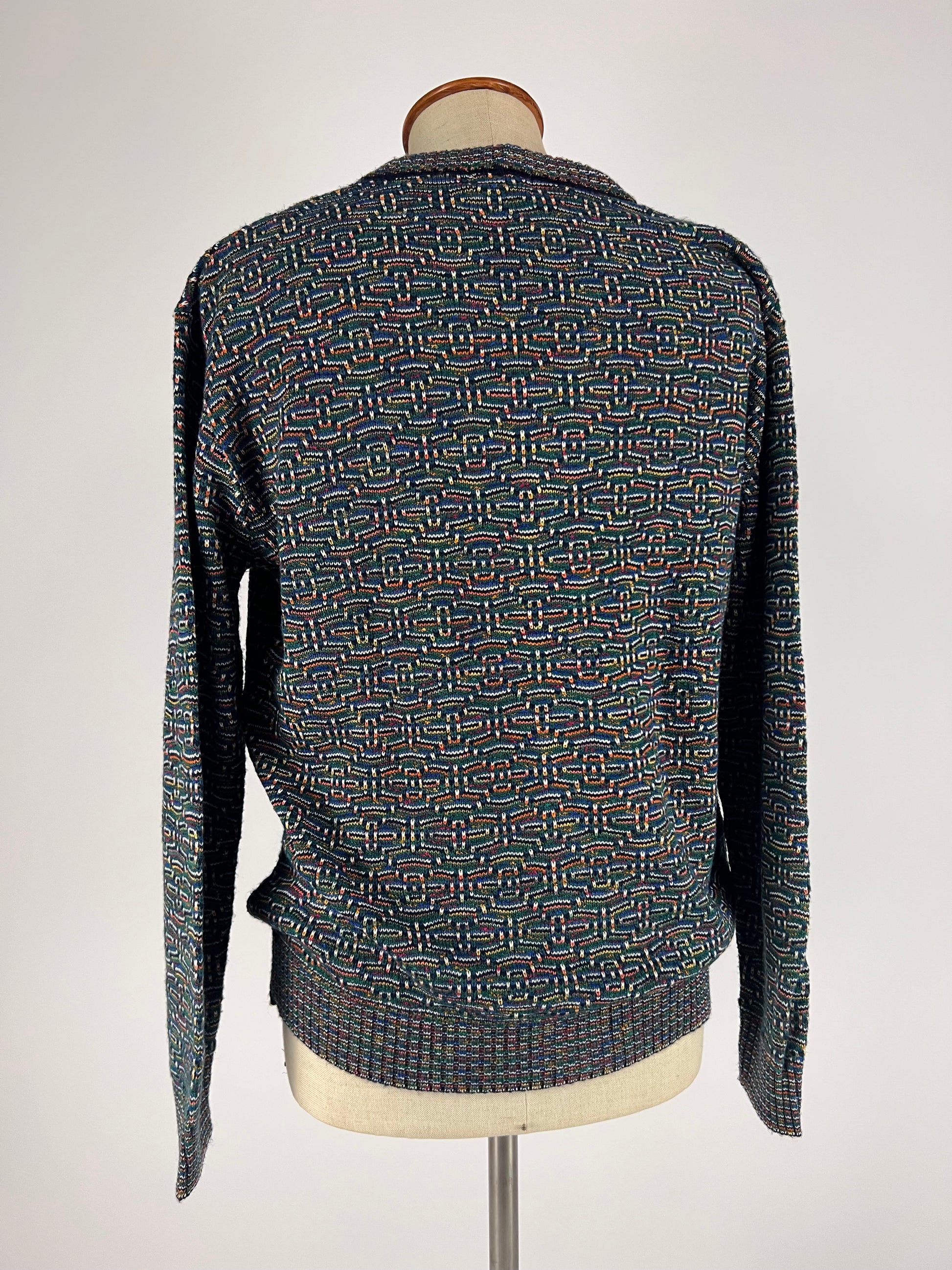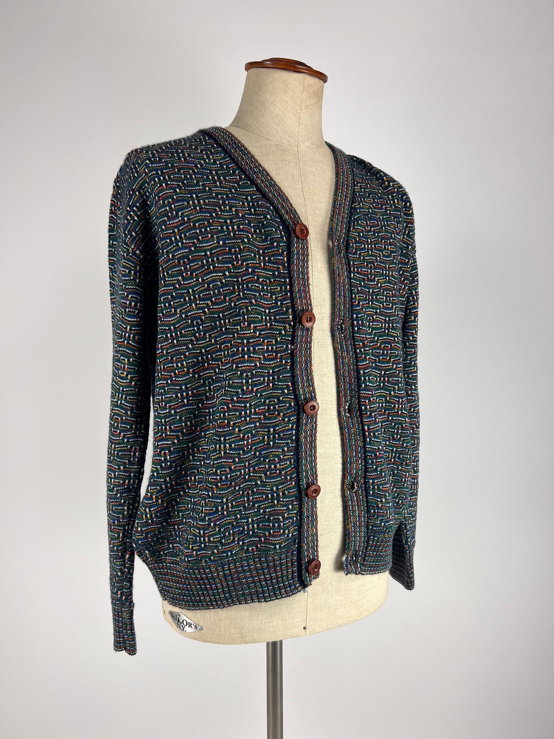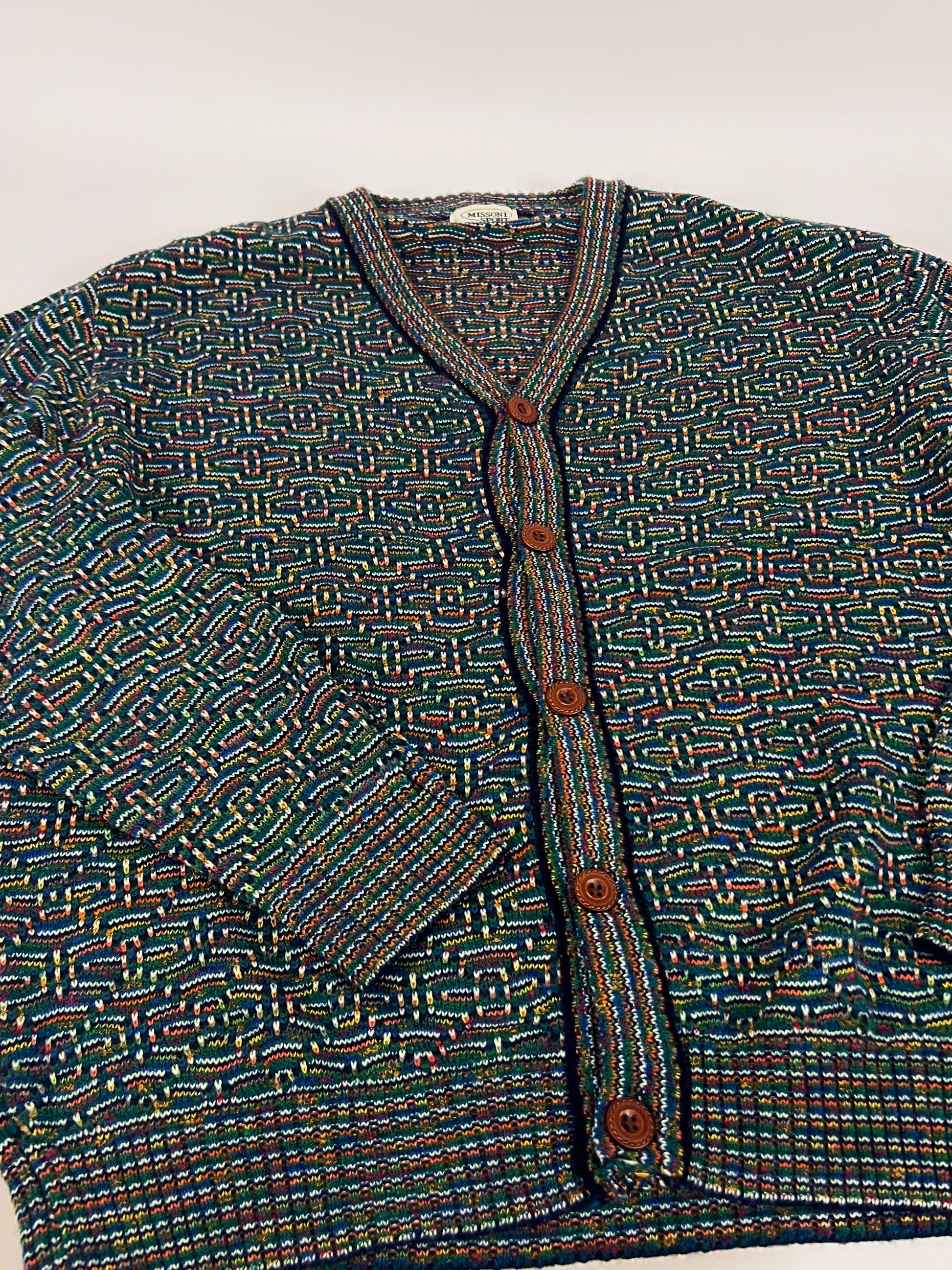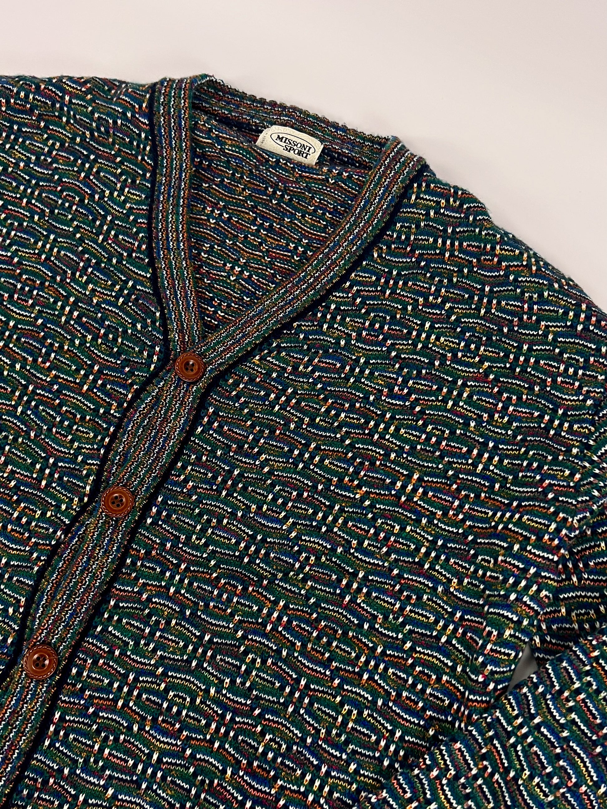 Realizzato in un pregiato filato misto lana e acrilico, offre una texture calda, morbida e elasticizzata, tipica della maglieria Missoni degli anni '80.