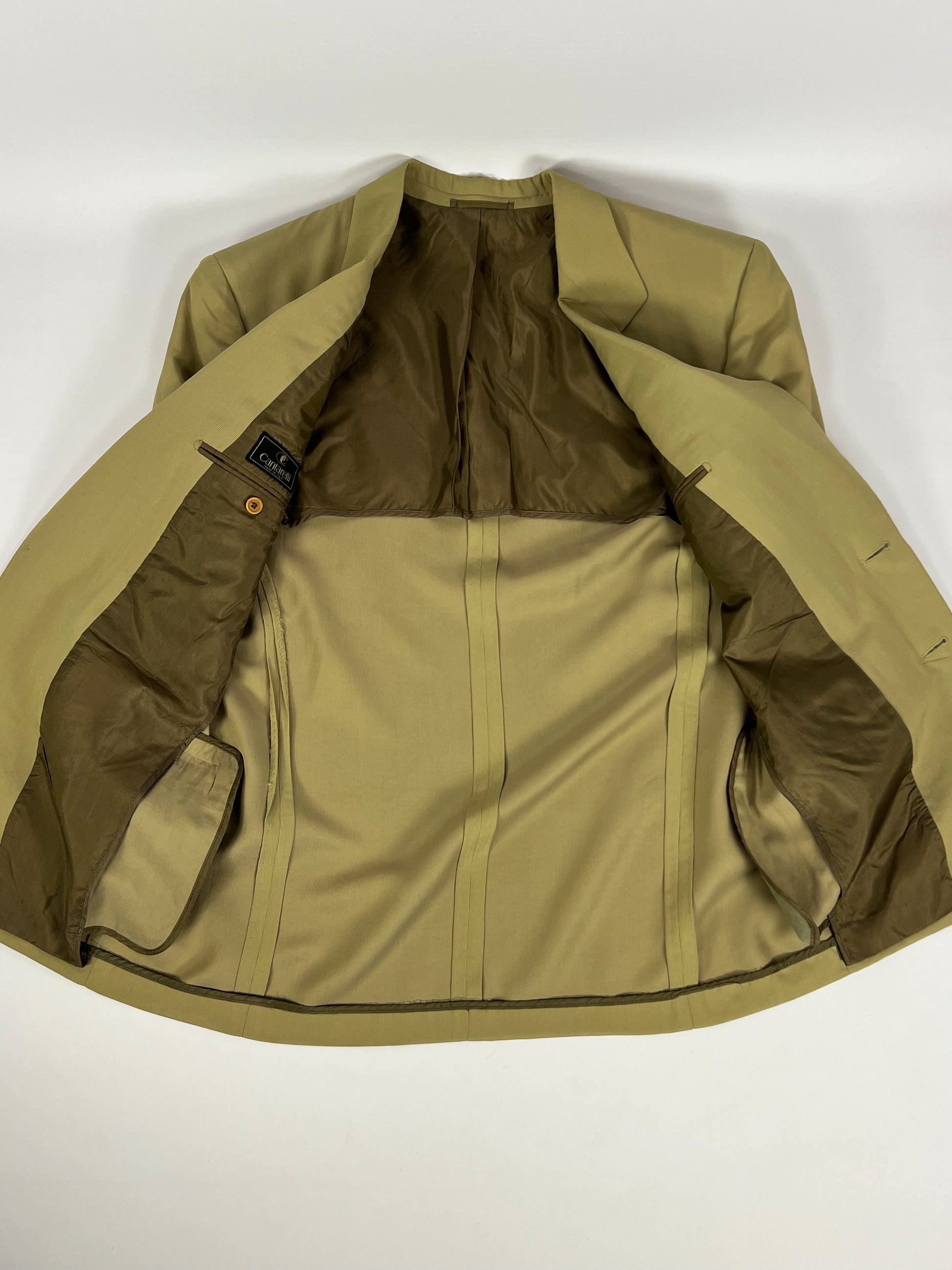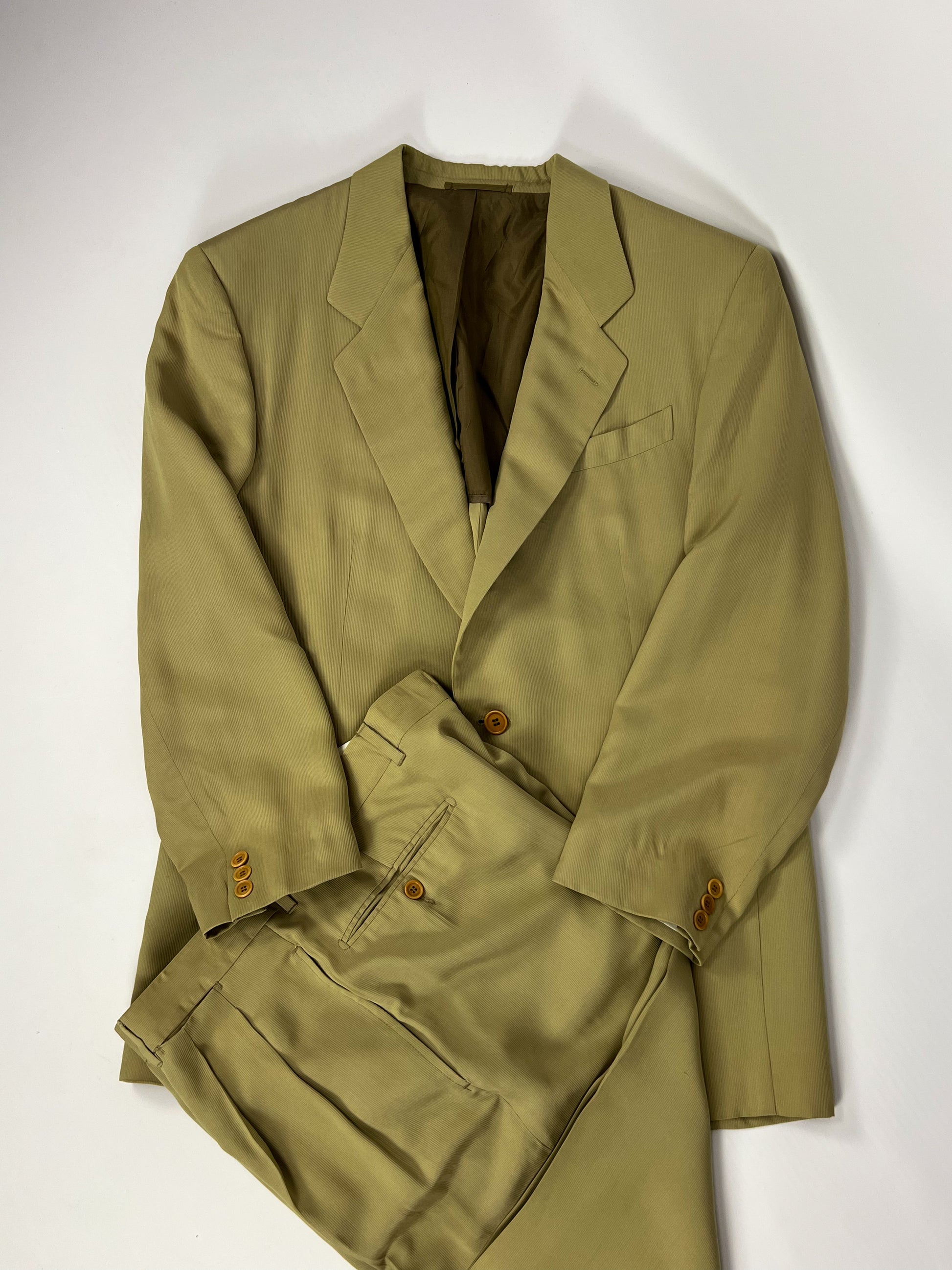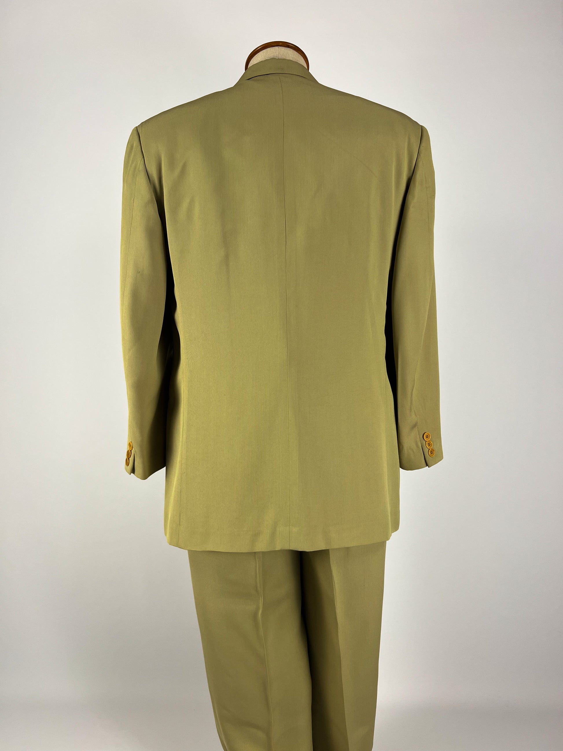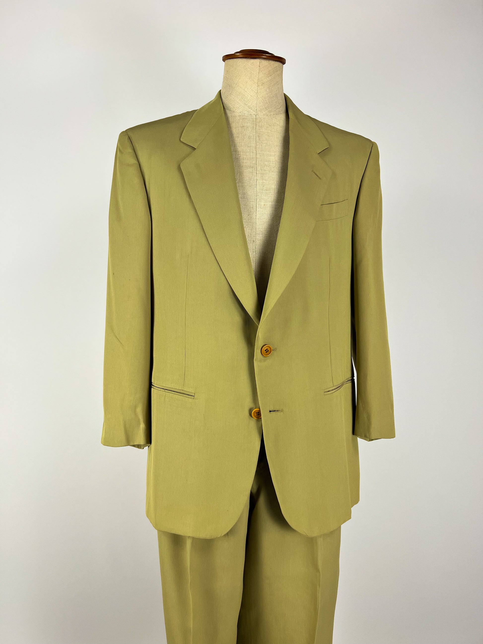 Completo vintage Cantarelli in misto seta, elegante e raffinato, caratterizzato da un colore verde oliva chiaro.