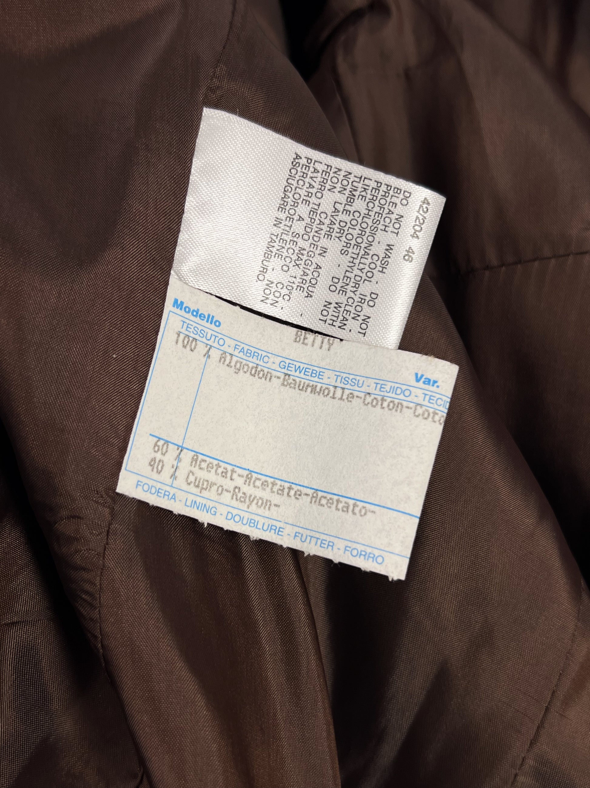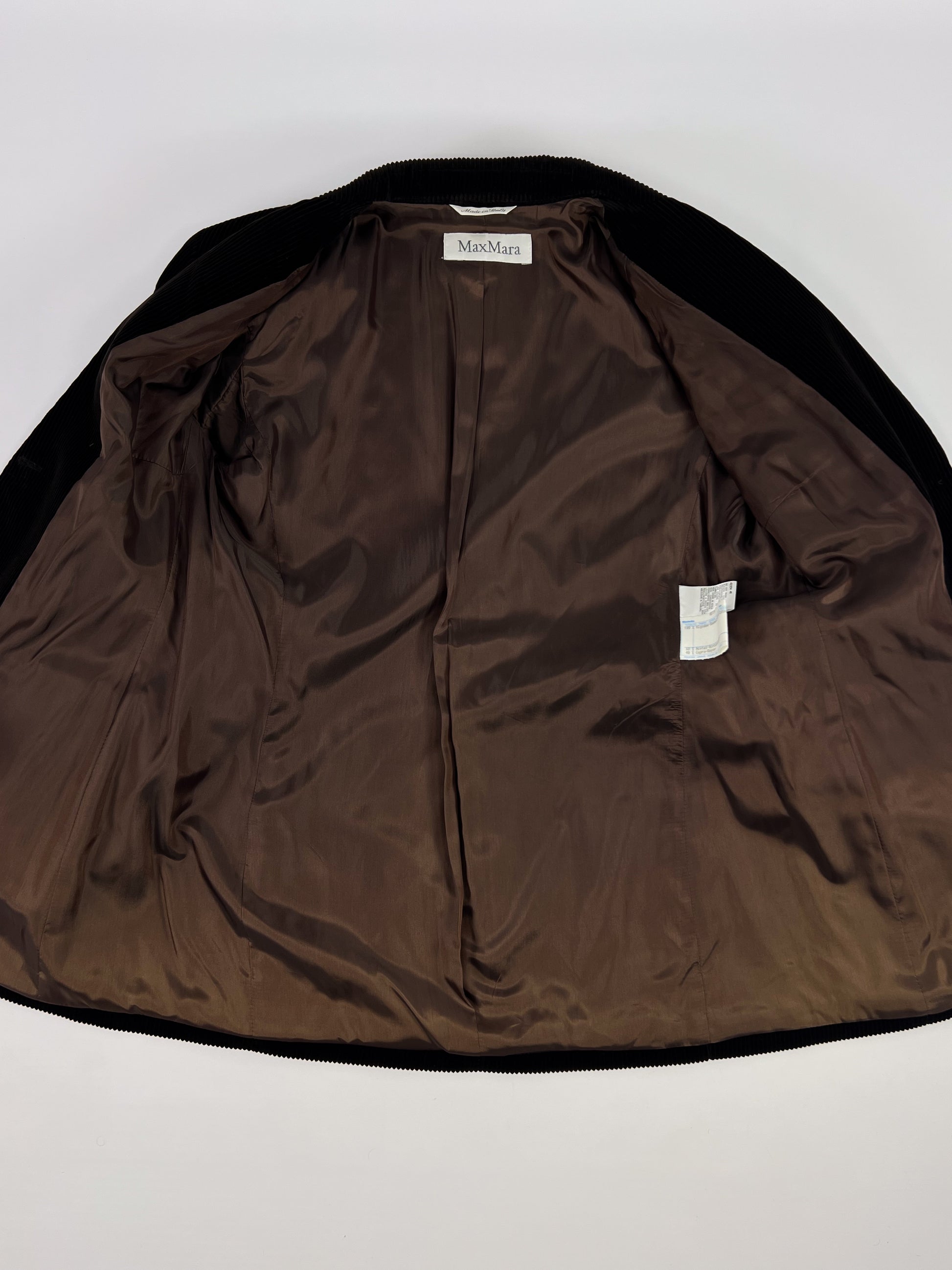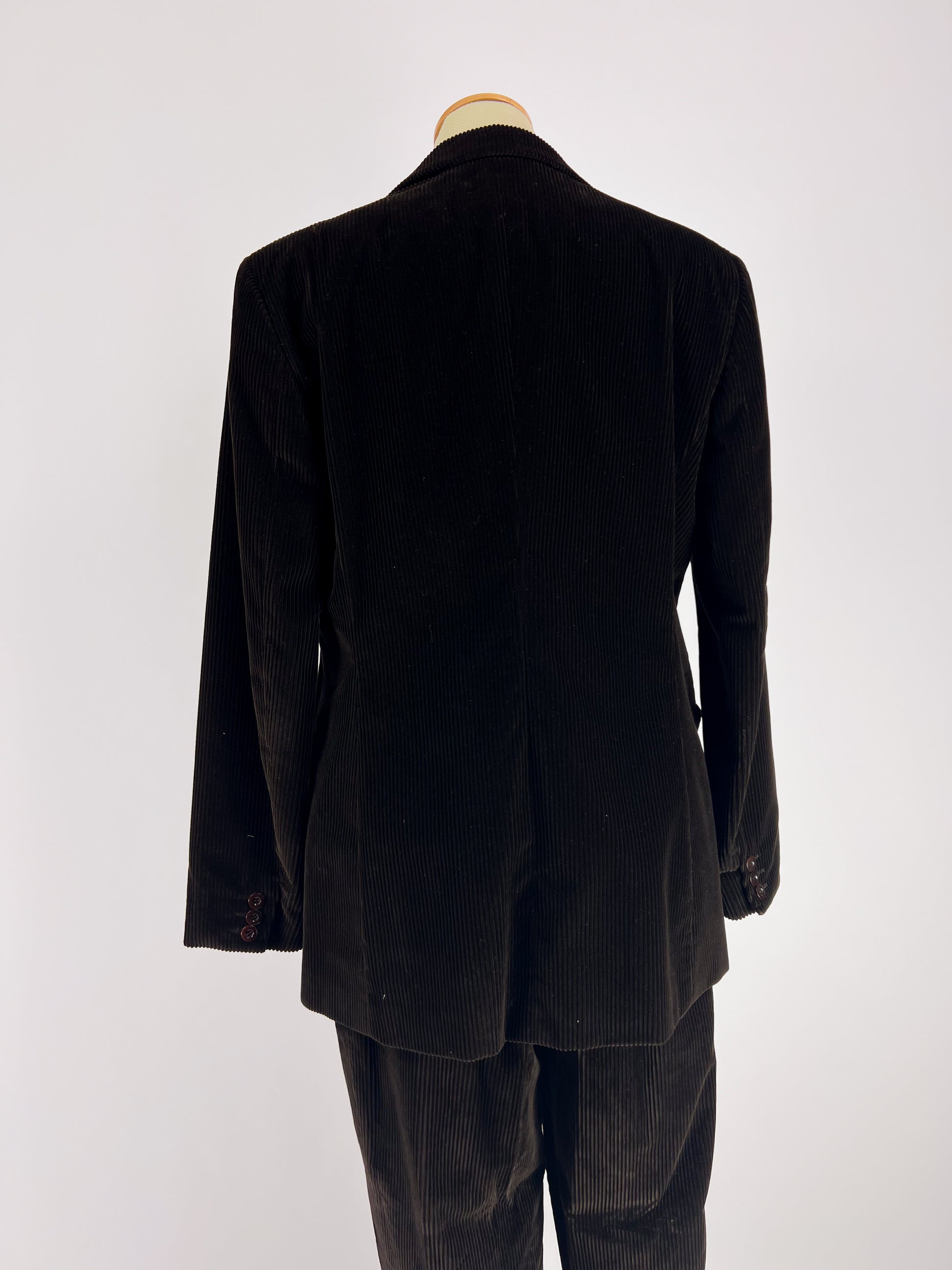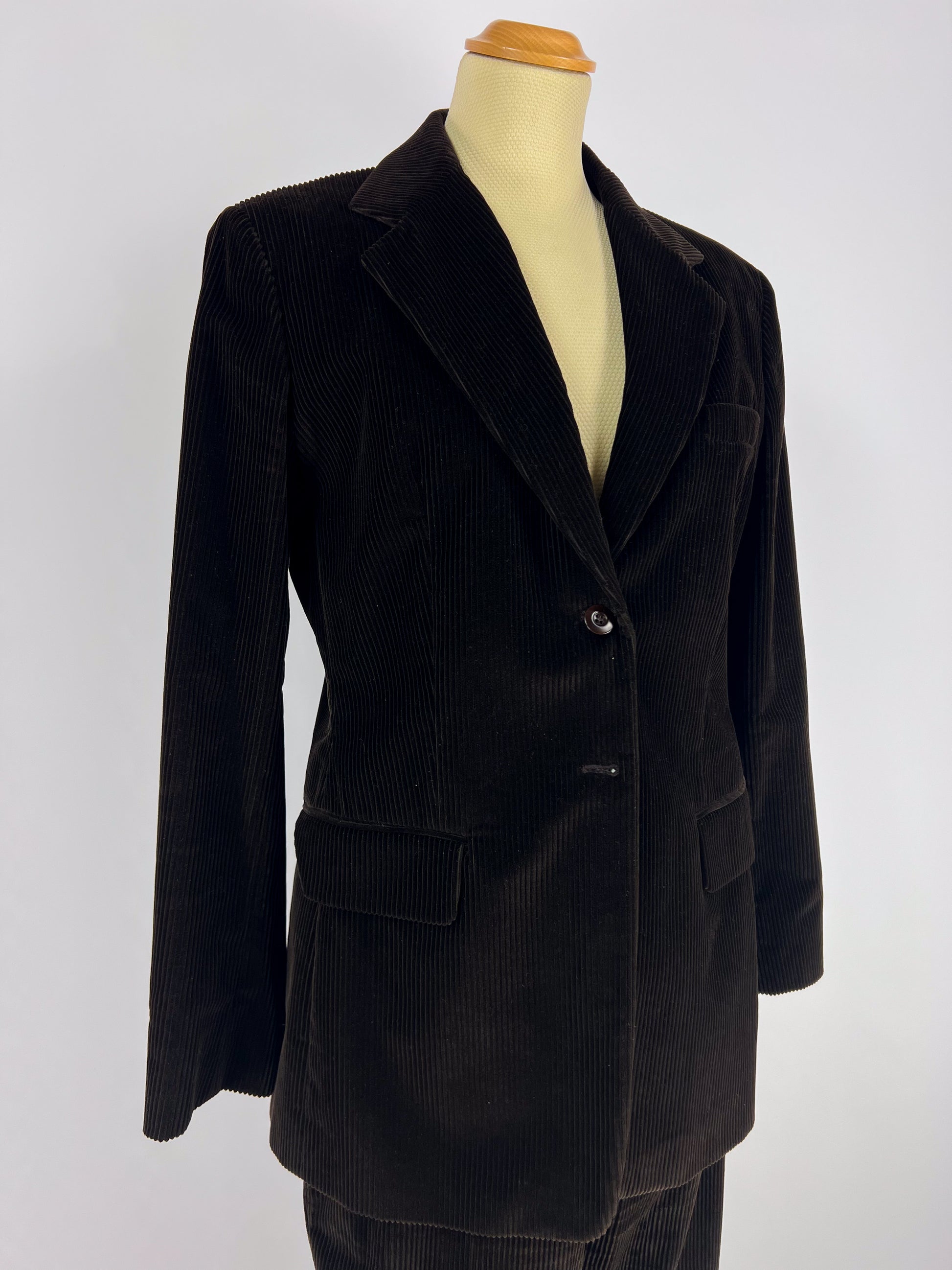 Elegante completo sartoriale Max Mara composto da giacca monopetto e pantalone coordinato in velluto a coste fine color marrone cioccolato scuro.