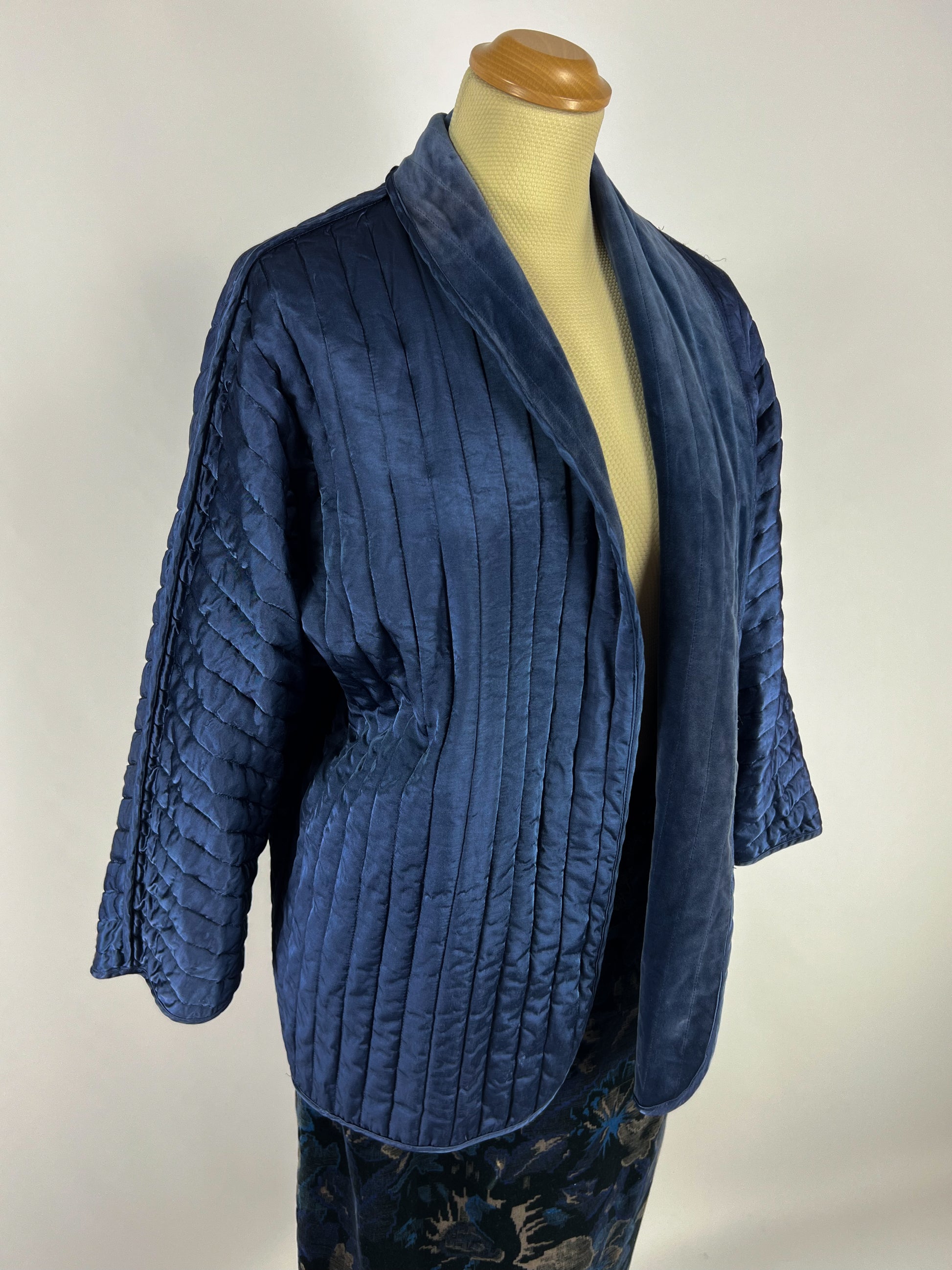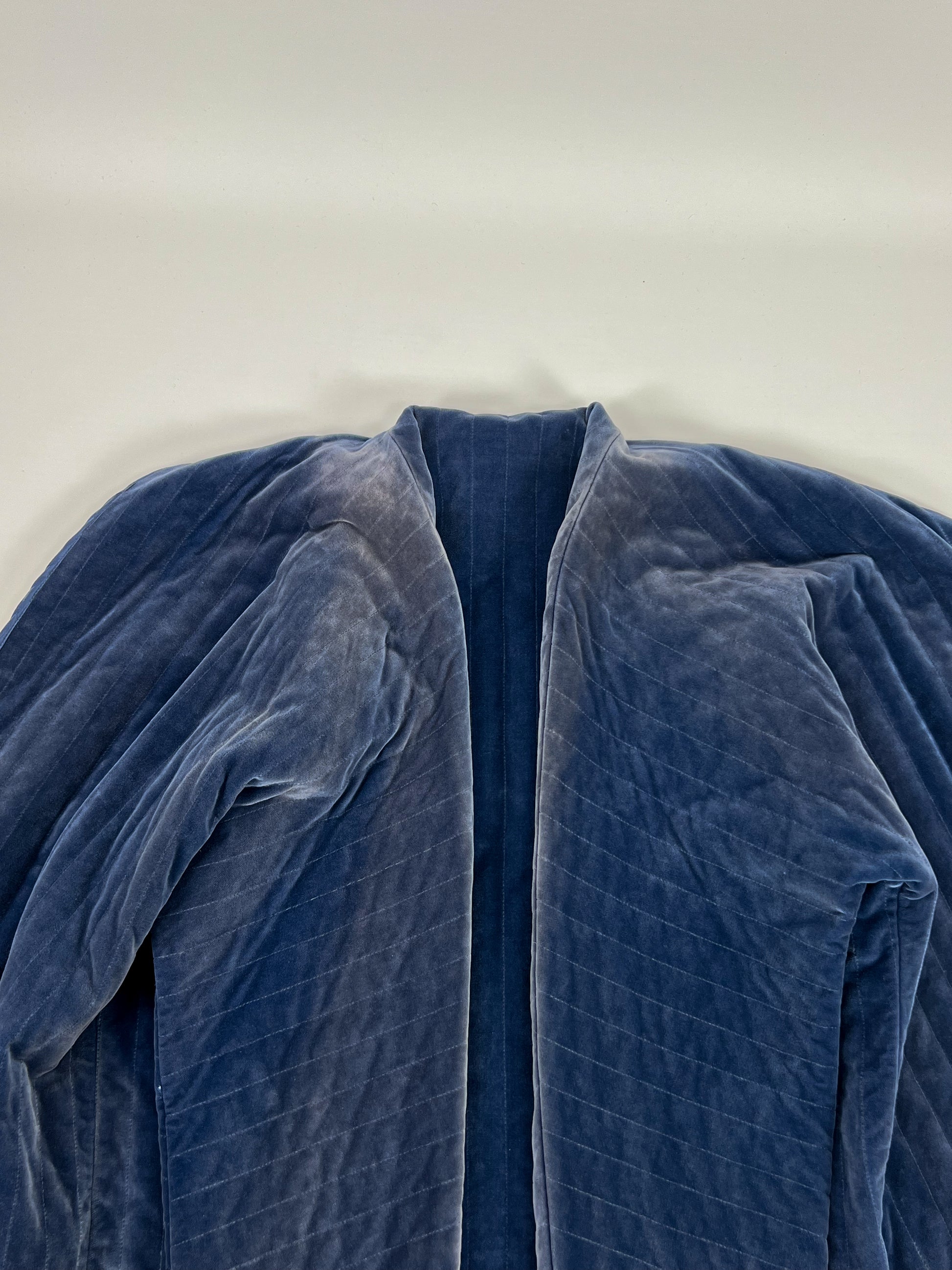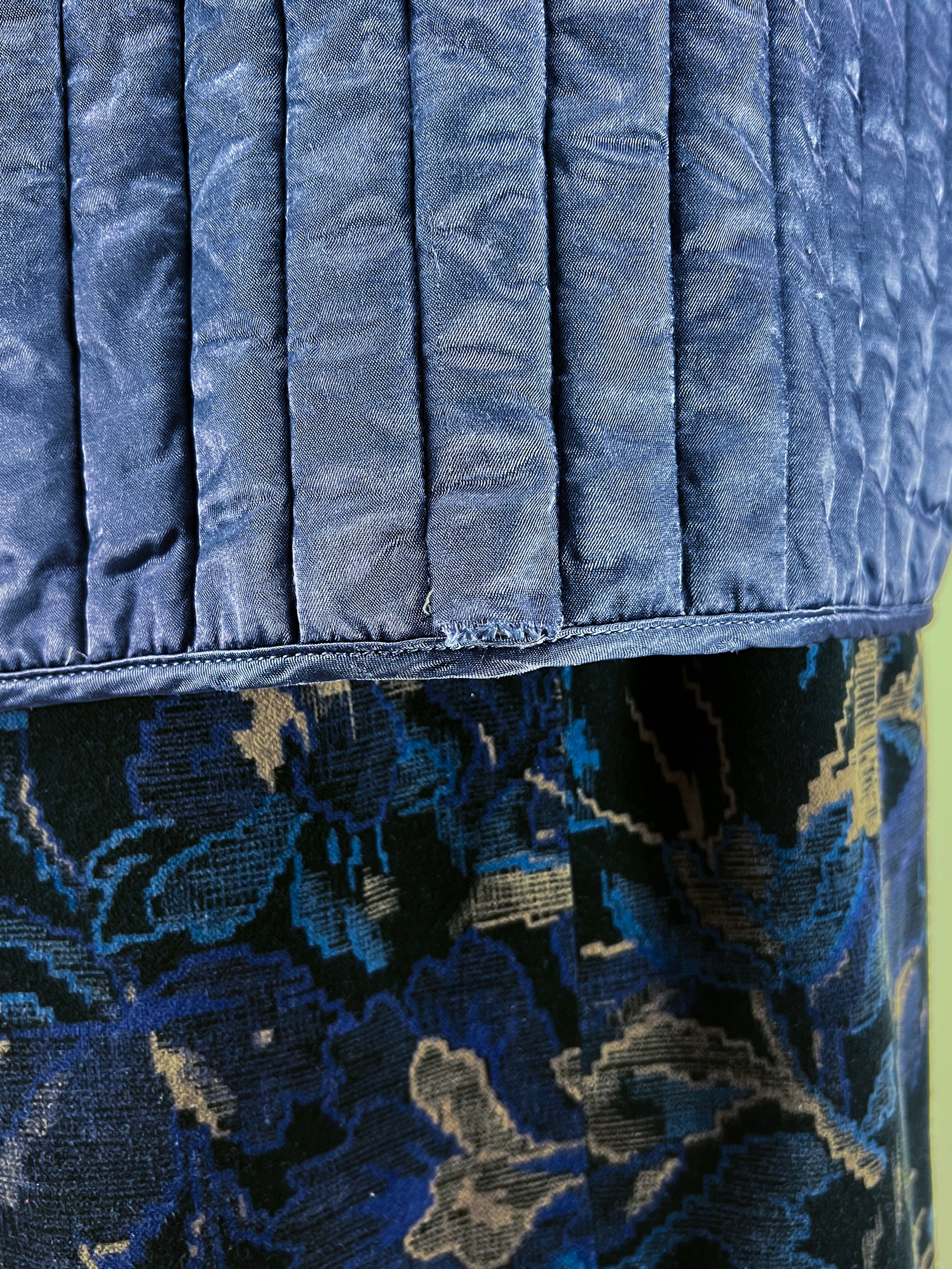 Realizzato in velluto e tessuto jacquard floreale nei toni del blu e del grigio, unisce la morbidezza del velluto trapuntato all’eleganza della lavorazione broccata.