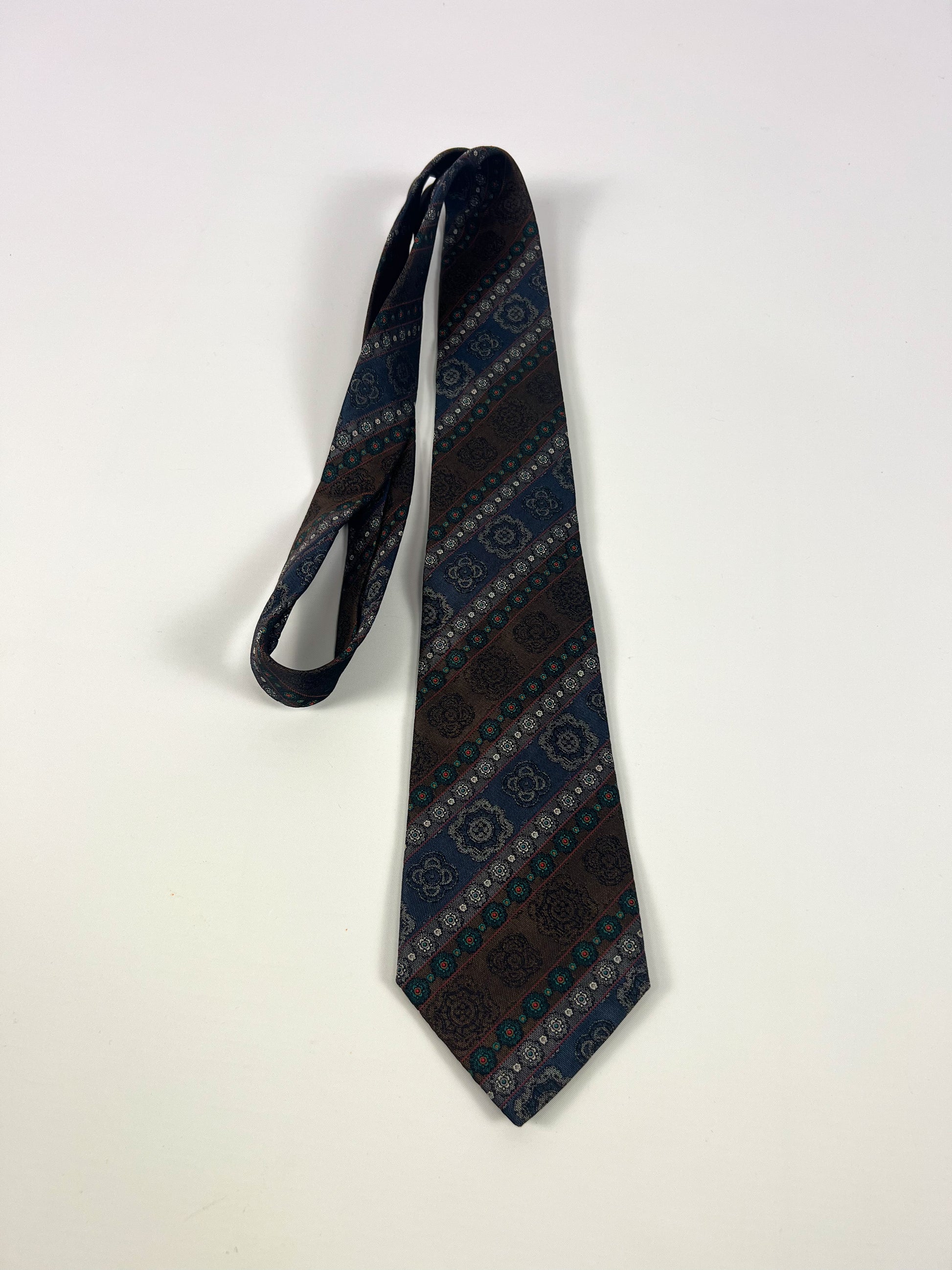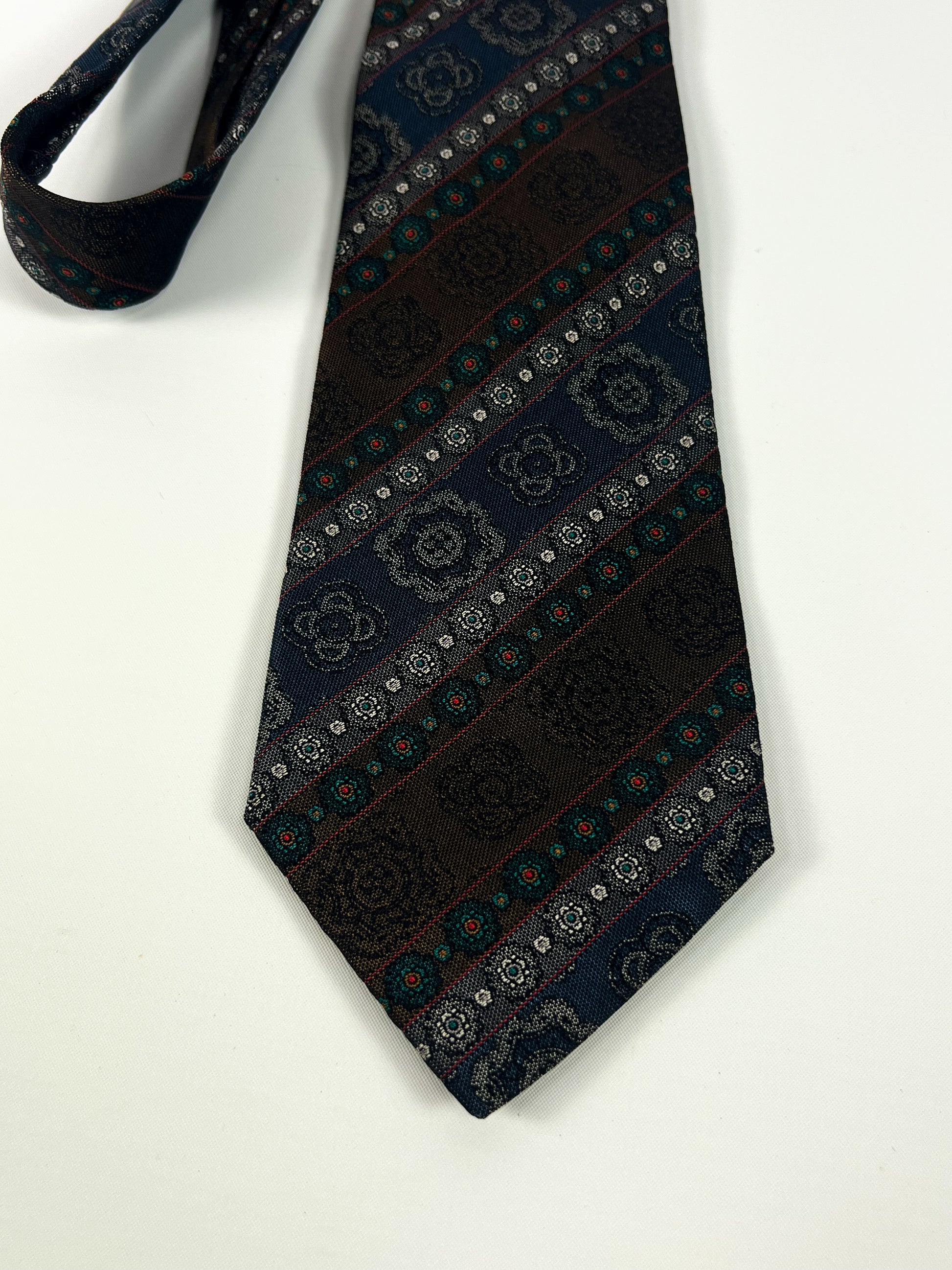 Il design presenta una raffinata fantasia diagonale ornamentale con motivi floreali e geometrici, nei toni del blu notte, marrone e verde, arricchiti da piccoli dettagli rossi e argento che donano profondità e movimento al tessuto.