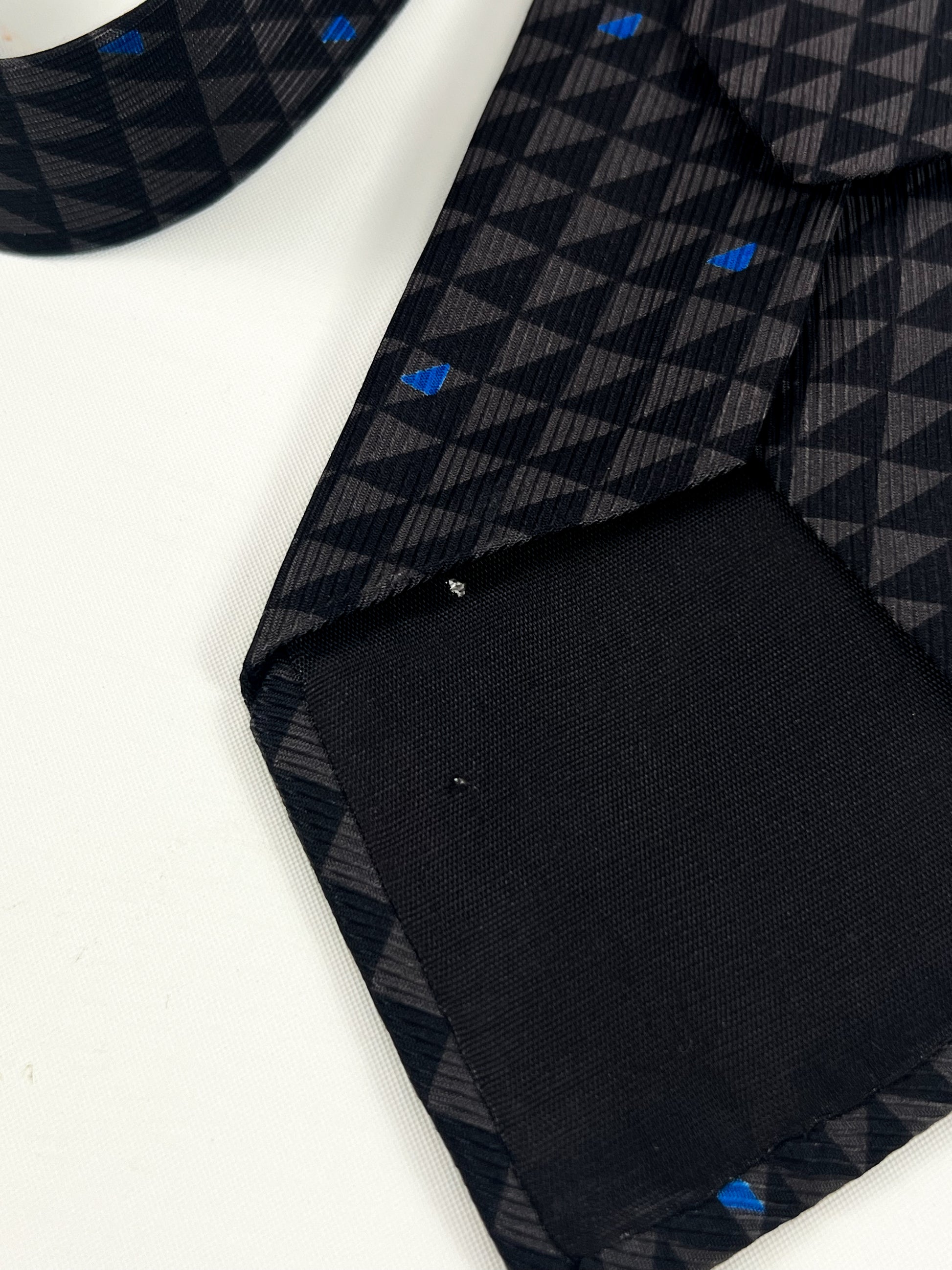 Cravatta vintage Gianni Versace in 100% seta, realizzata in Italia. Il modello presenta un raffinato motivo geometrico a piccoli triangoli nei toni del nero e grigio antracite, impreziosito da discreti dettagli blu elettrico.