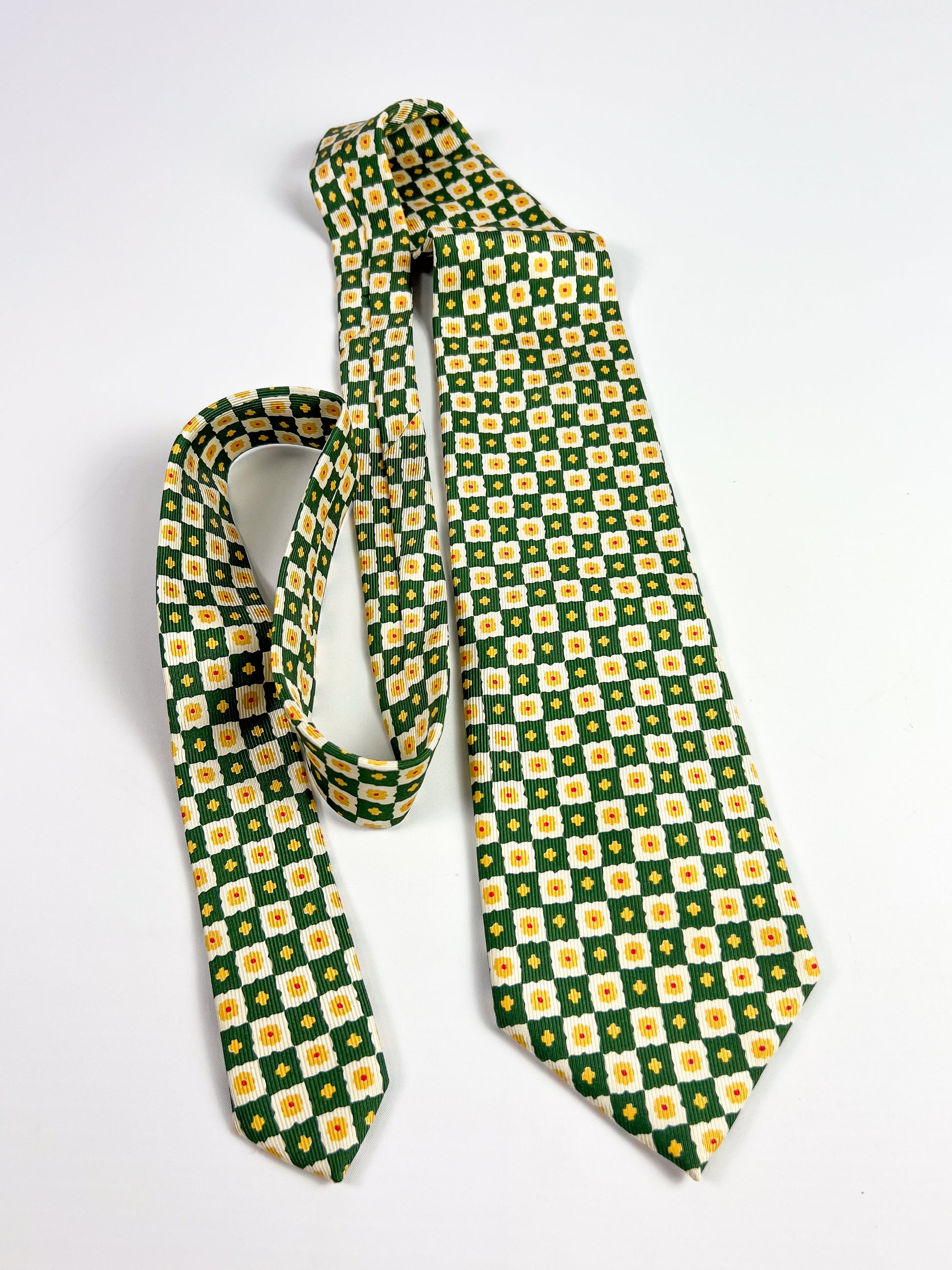 Elegante cravatta vintage Boss Hugo Boss in pura seta, caratterizzata da una distintiva fantasia geometrica nei toni del verde, bianco e giallo con piccoli dettagli a contrasto.