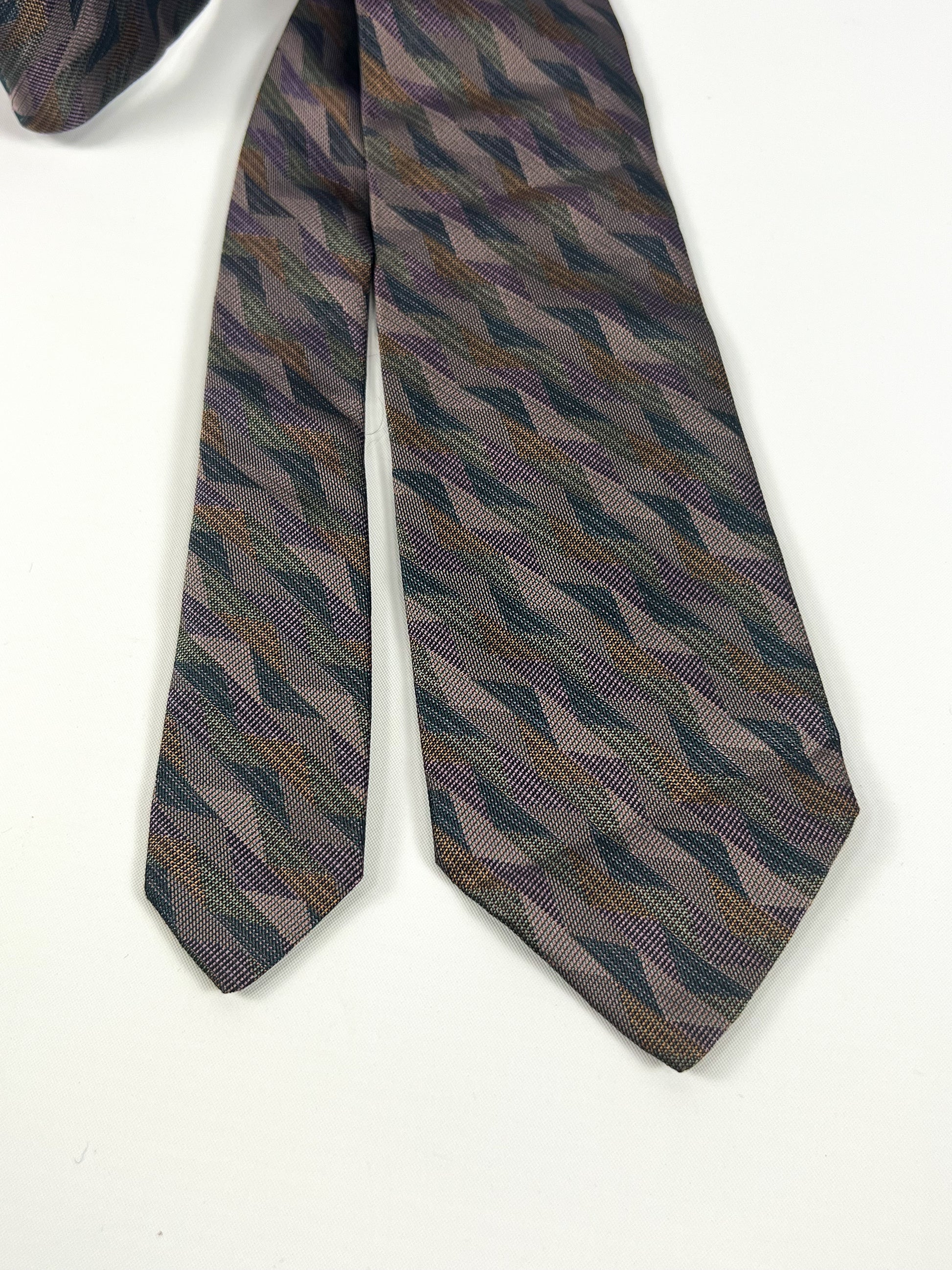 Elegante cravatta Ted Lapidus Paris realizzata in 100% seta, caratterizzata da una raffinata fantasia geometrica multicolore nei toni del grigio, verde, viola e bronzo. Design sofisticato e tipico dell’estetica anni ’80-’90, con lavorazione jacquard e qualità sartoriale.