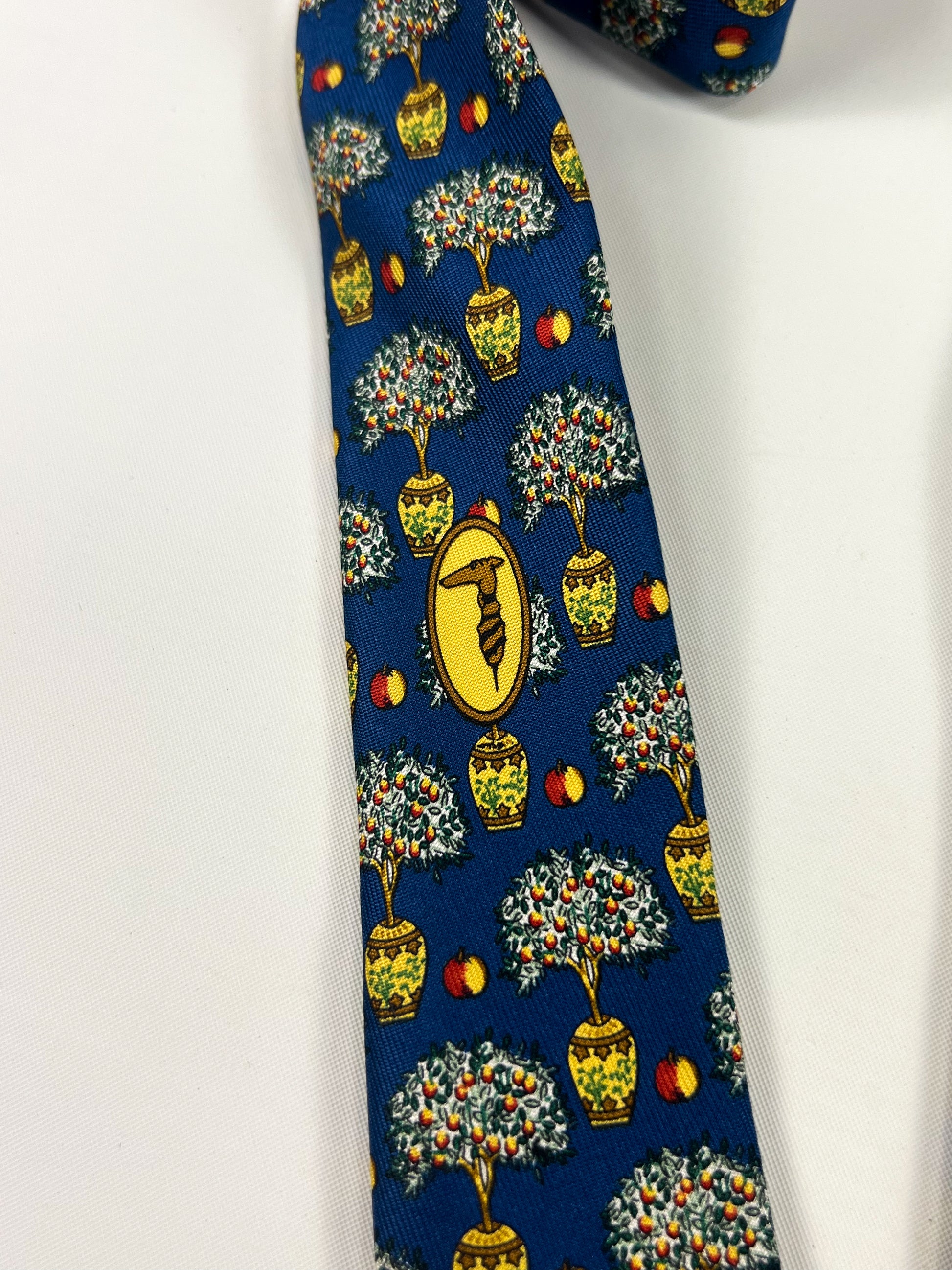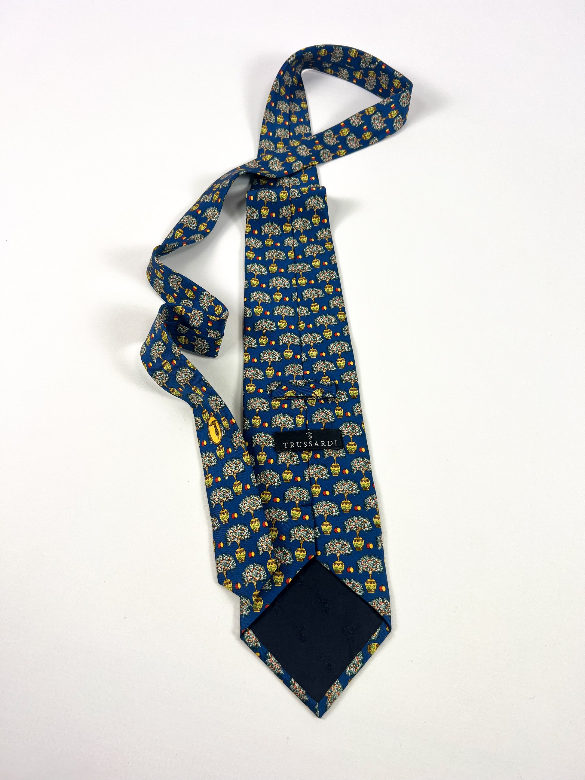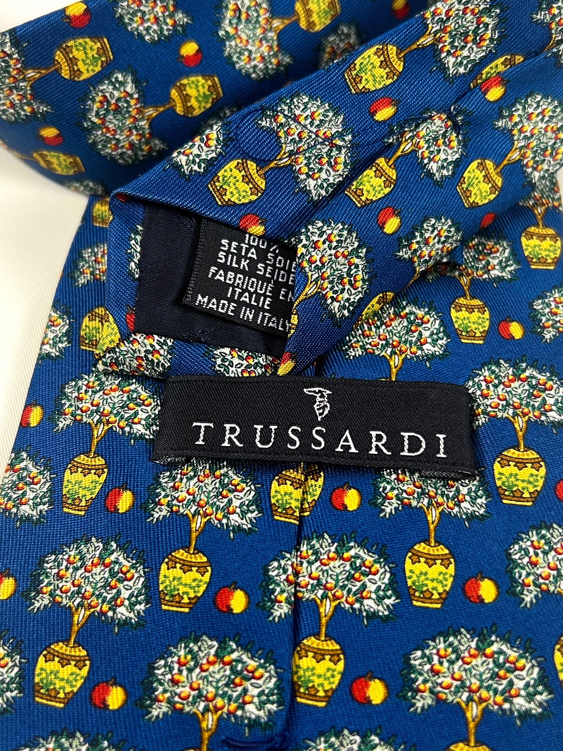 Raffinata cravatta Trussardi realizzata in 100% seta e prodotta in Italia. Il modello presenta una vivace fantasia decorativa con piccoli alberi in vaso e frutti su fondo blu intenso, un motivo originale e distintivo tipico dello stile del marchio negli anni ’80-’90. Il design elegante ma creativo riflette l’estetica italiana del periodo, con una lavorazione di qualità e una seta dalla mano morbida e luminosa.