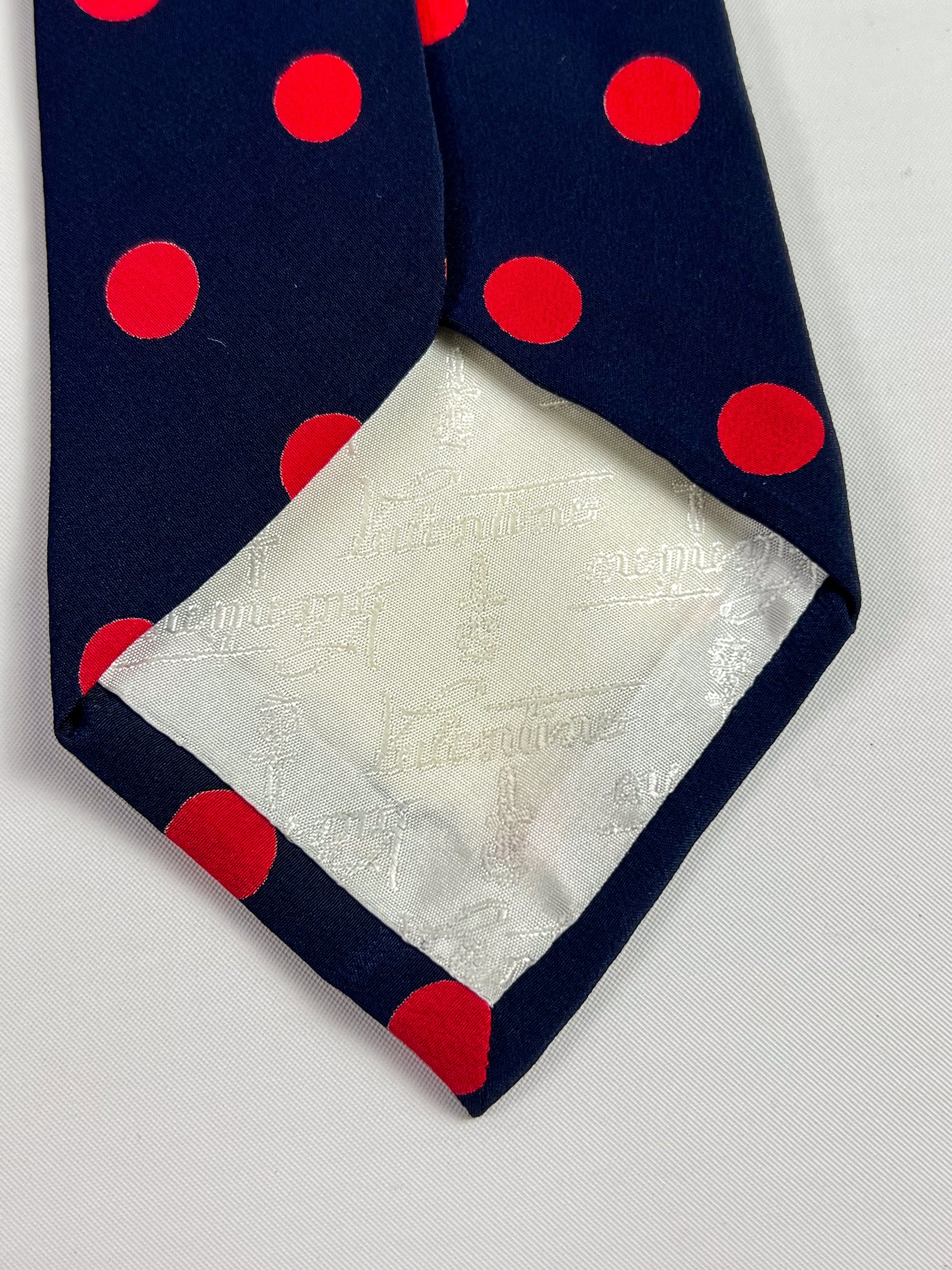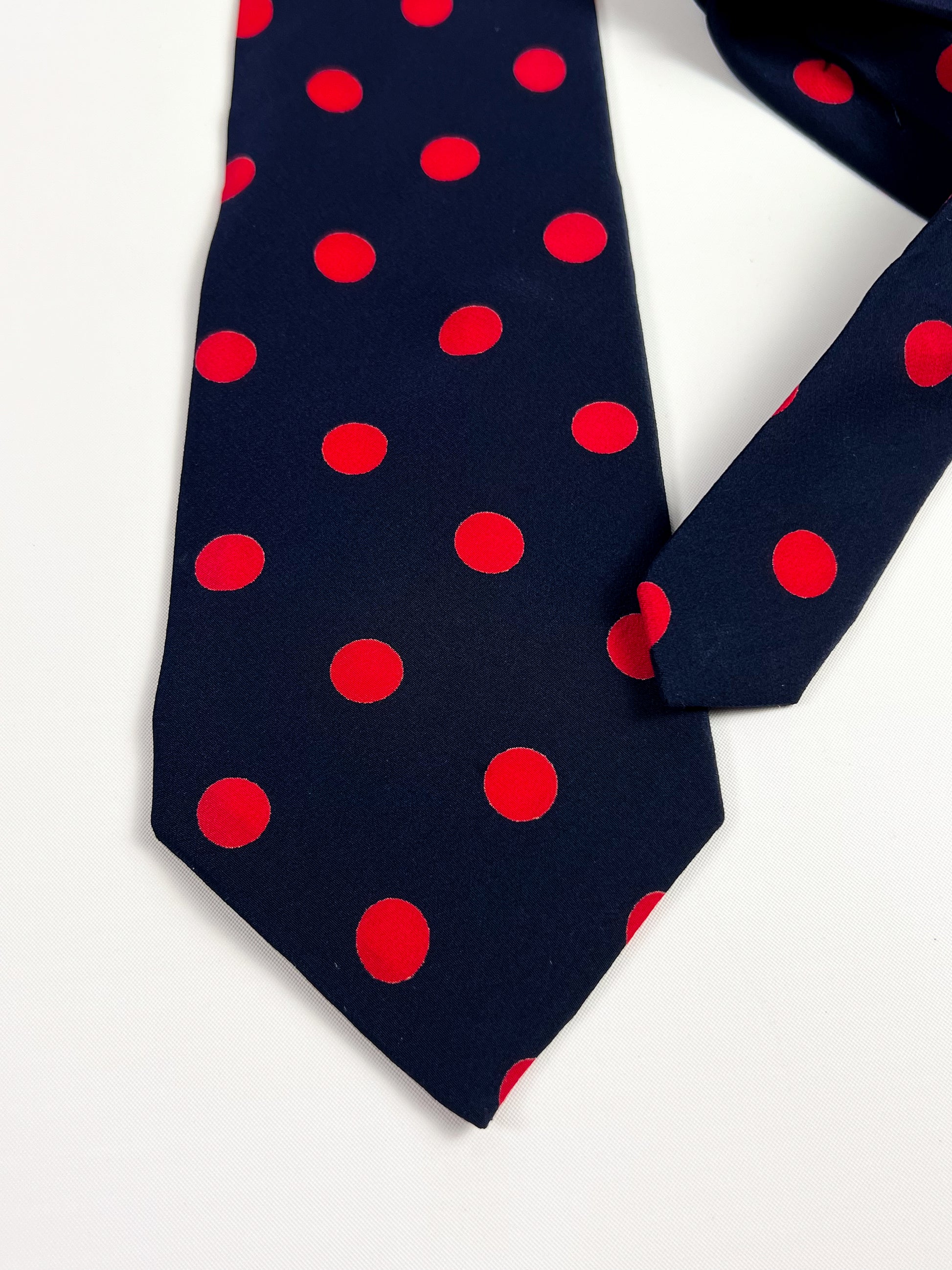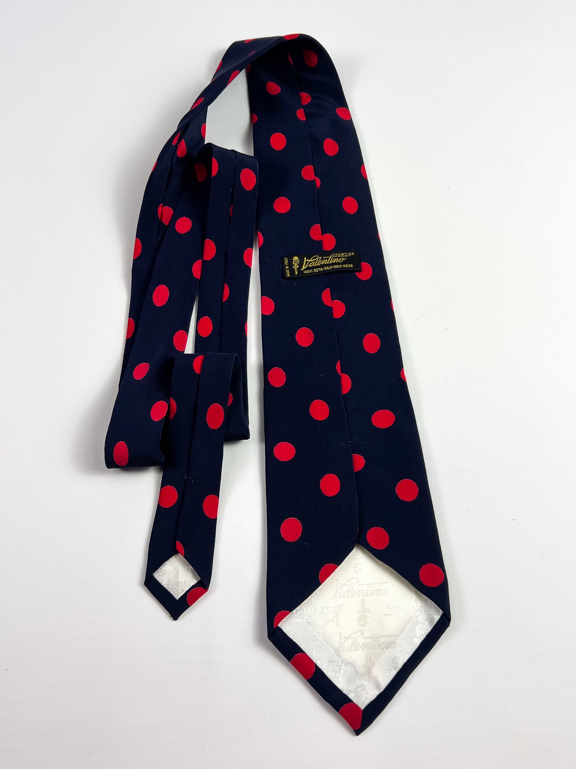 Elegante cravatta vintage Valentino in pura seta, caratterizzata da una classica fantasia a pois rossi su fondo blu navy, icona di eleganza senza tempo.
