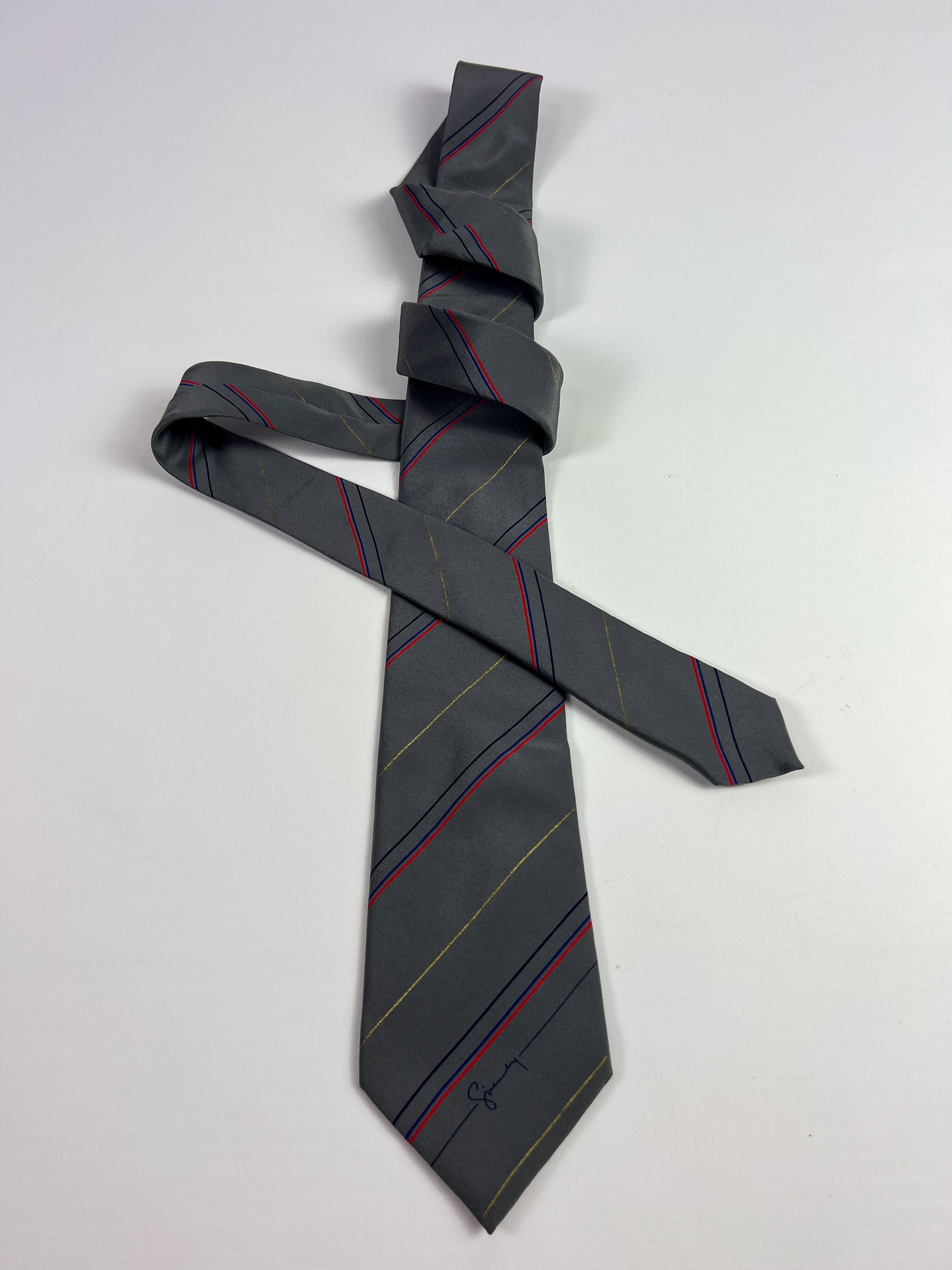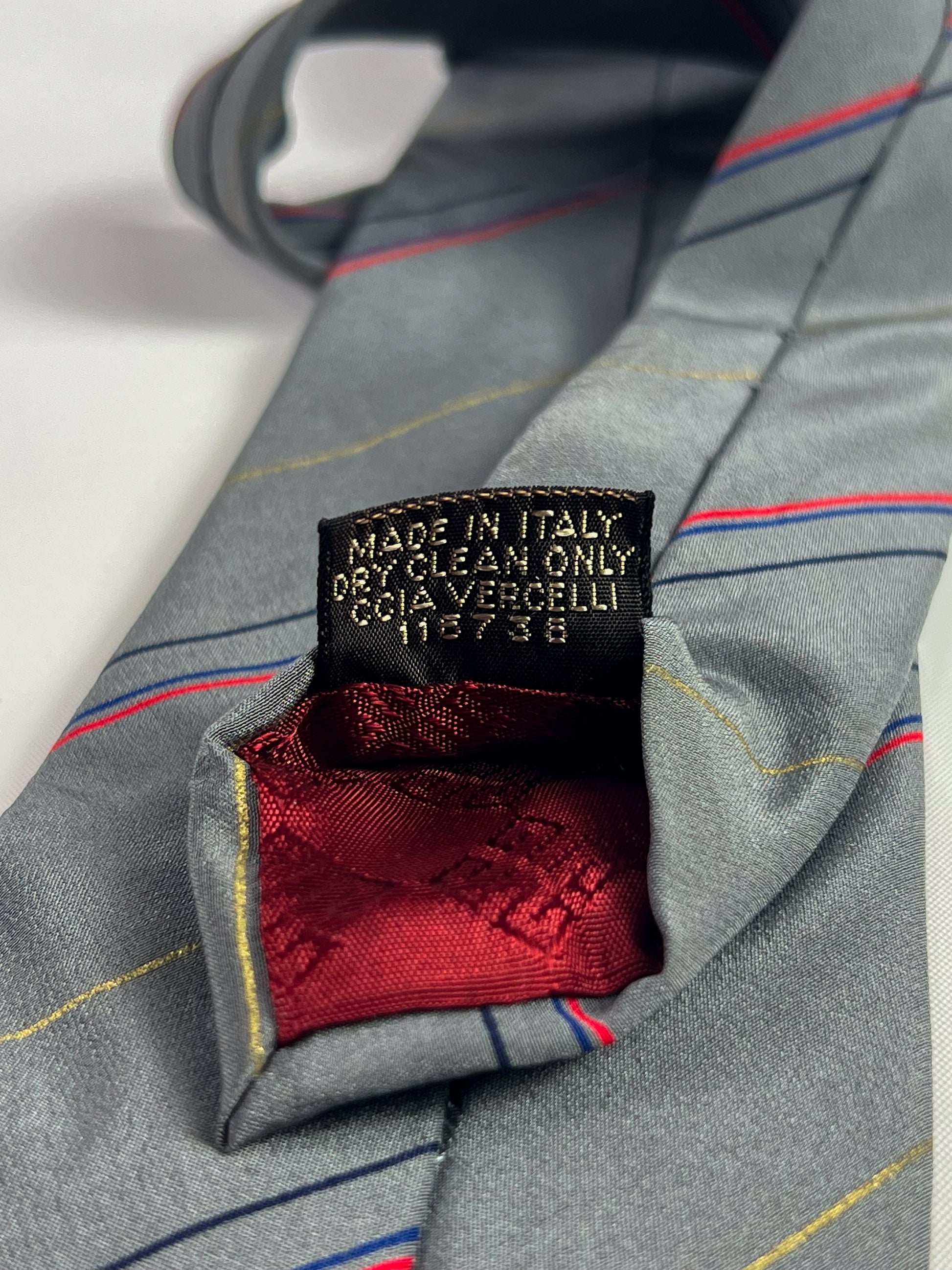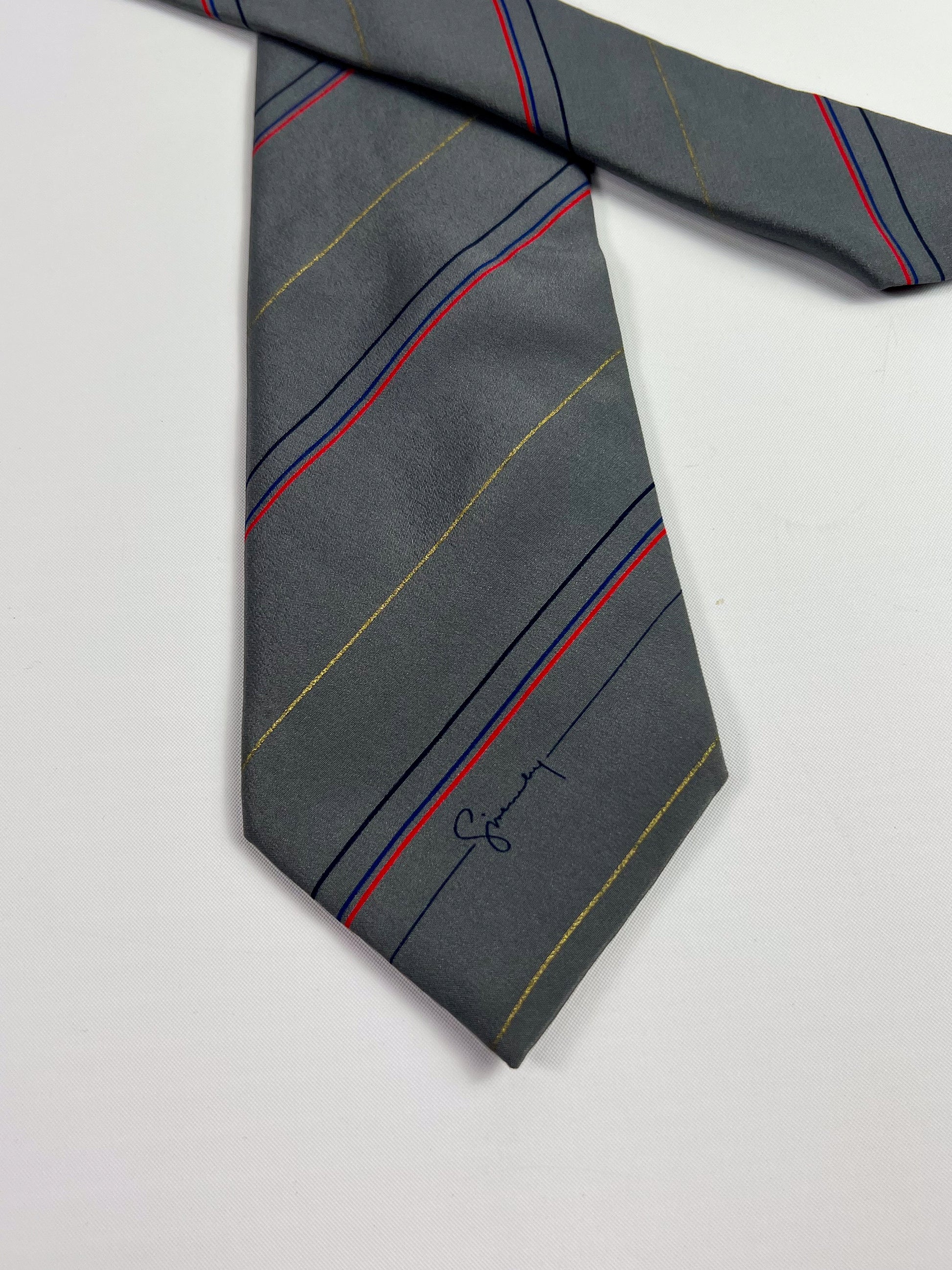 Elegante cravatta vintage Givenchy, realizzata in 100% seta, decorata con un raffinato motivo a righe oblique nei toni del grigio, rosso, blu e oro. Dettaglio dell’interno rosso con logo Givenchy jacquard.
