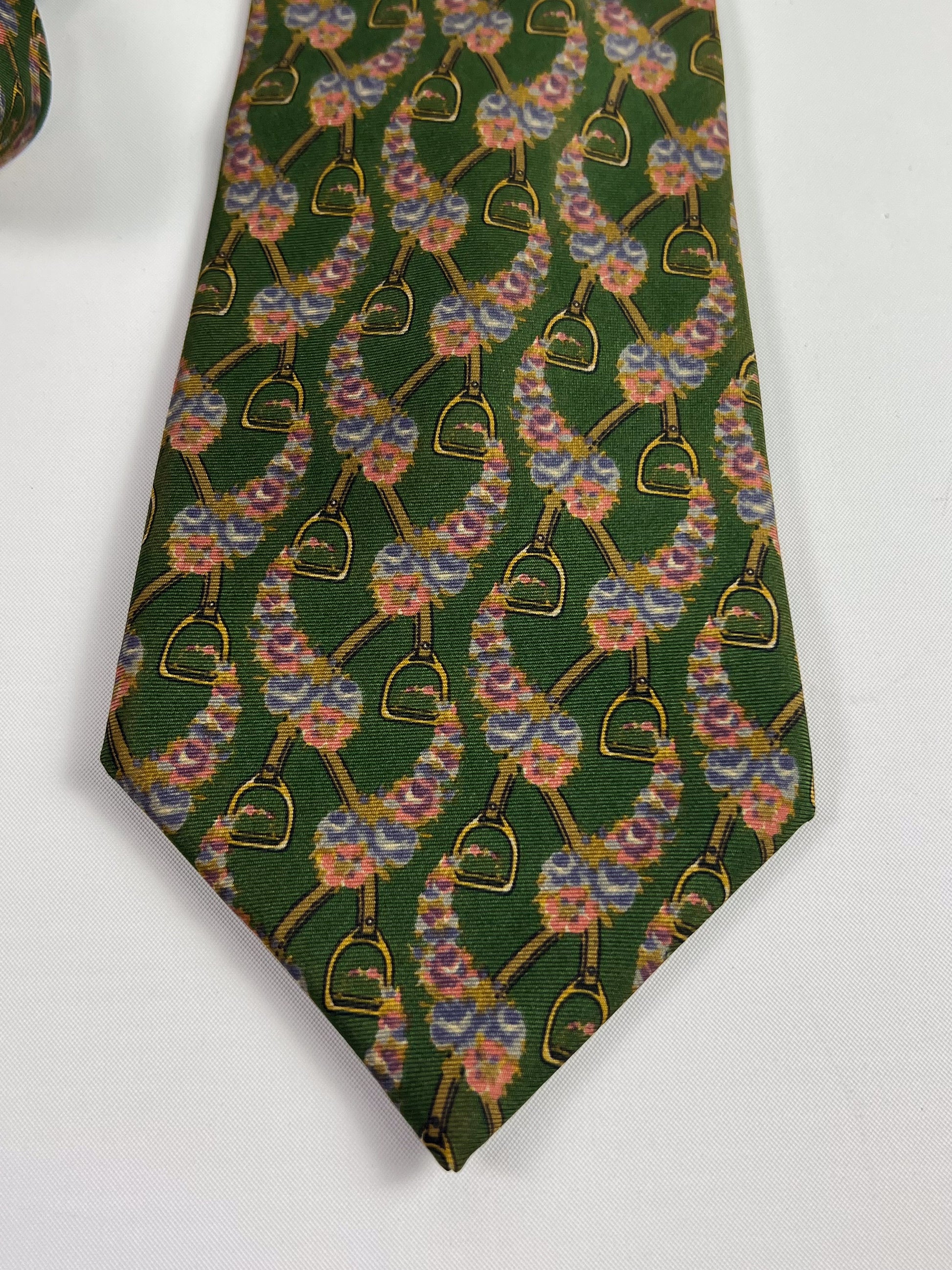 Cravatta vintage Lanvin in pura seta, caratterizzata da un elegante motivo equestre con staffe e dettagli floreali nei toni del verde, rosa e azzurro.