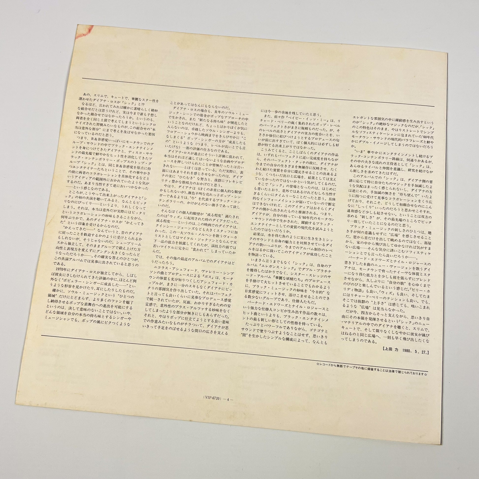 Album iconico prodotto da Bernard Edwards e Nile Rodgers (CHIC Organization), include i grandi classici “Upside Down” e “I’m Coming Out”. Questa prima stampa giapponese è particolarmente apprezzata per la qualità di pressaggio CBS/Sony, la nitidezza sonora superiore e il packaging curato tipico delle edizioni nipponiche dell’epoca, con copertina gatefold e inserto testi bilingue.