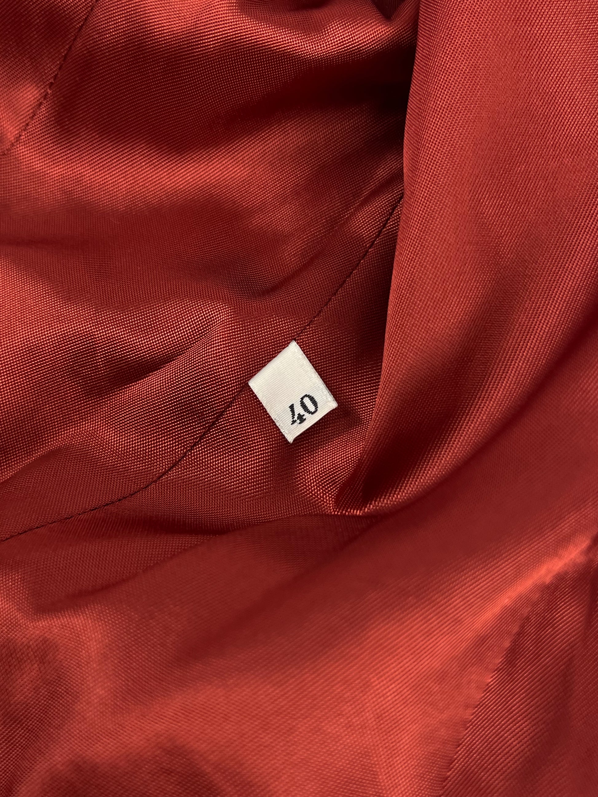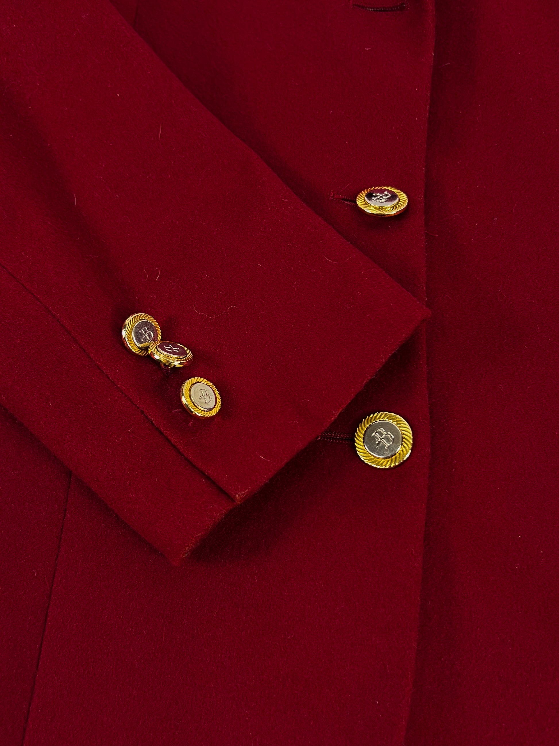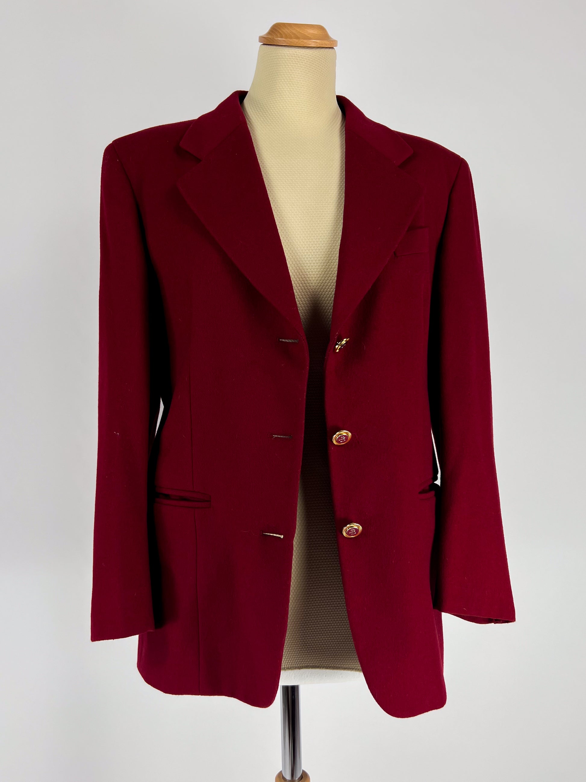 Elegante giacca vintage Ballantyne in pura lana nei toni del bordeaux intenso. Il modello monopetto presenta una linea dritta con spalle leggermente strutturate, revers classici e chiusura a tre bottoni dorati con dettaglio inciso.