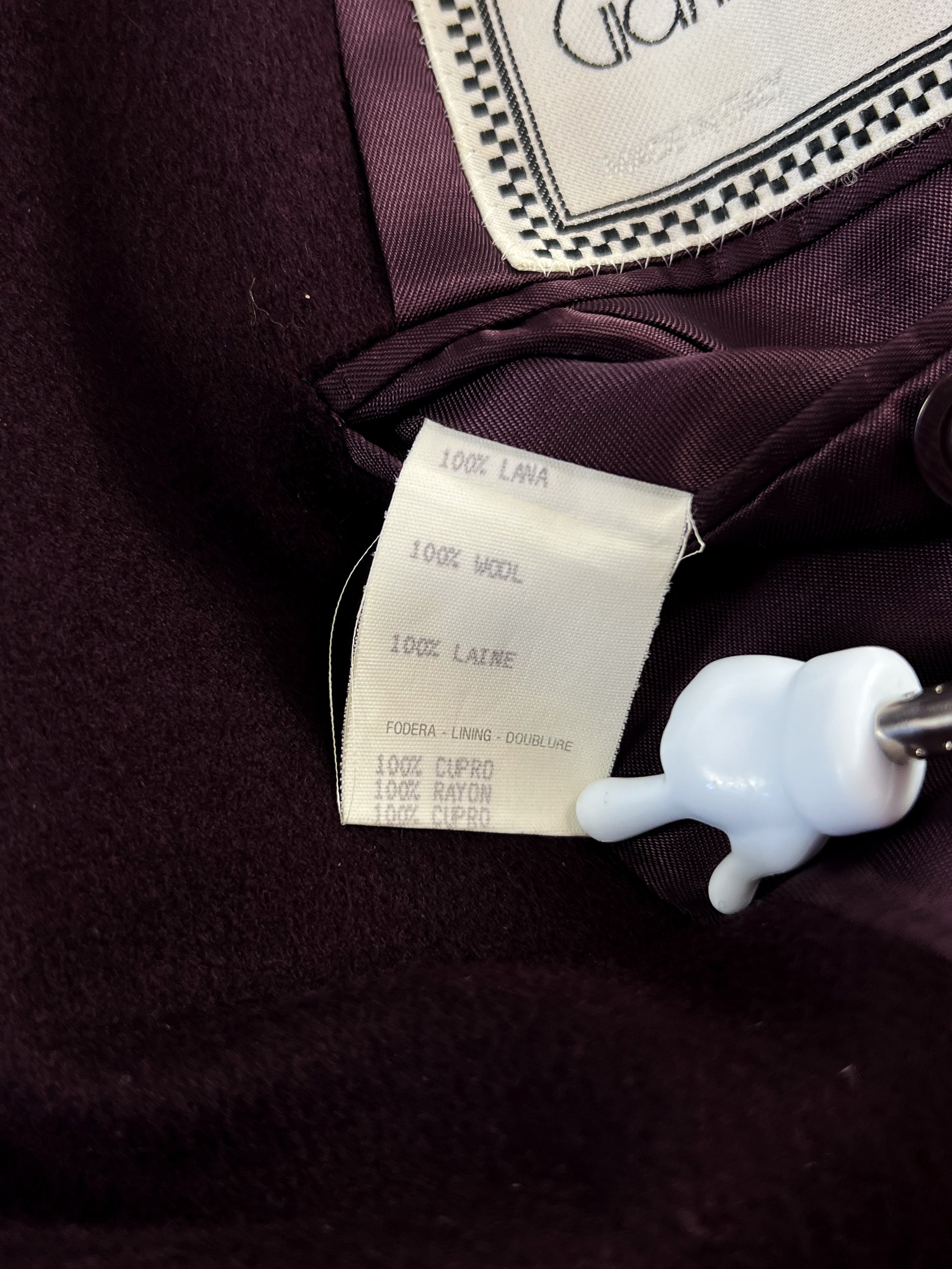 Giacca Gianni Versace anni '80 realizzata in pura lana, caratterizzata da un profondo bordeaux e doppia abbottonatura bassa. Vestibilità strutturata in linea con quegl'anni.