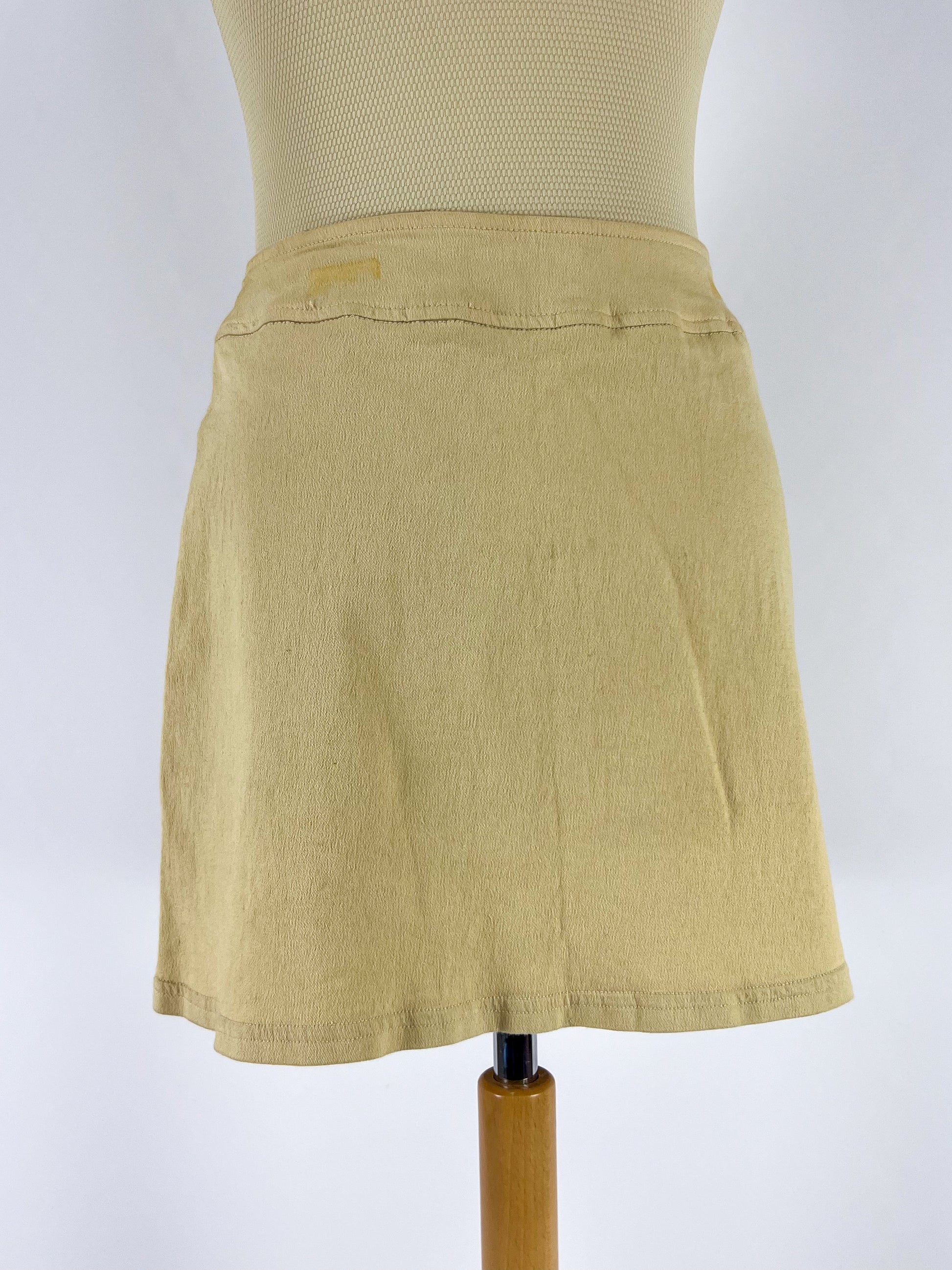 Gonna corta Armani Jeans anni ’80 in cotone beige, caratterizzata da una linea leggermente svasata e da un design essenziale con abbottonatura frontale completa. Realizzata in un twill di cotone corposo tipico delle produzioni Armani dell’epoca, presenta due ampie tasche applicate sul davanti e cintura sagomata con doppio bottone laterale.