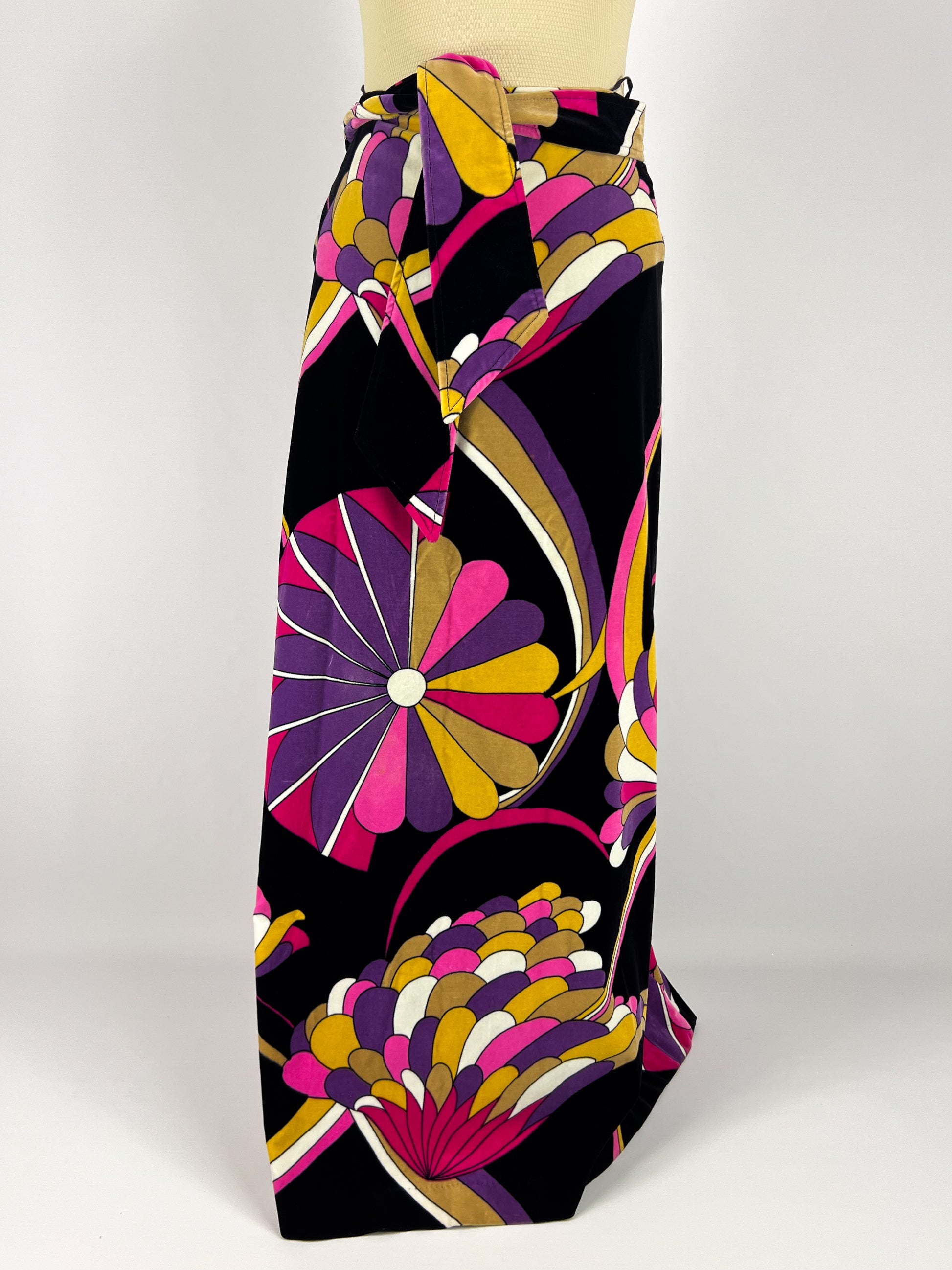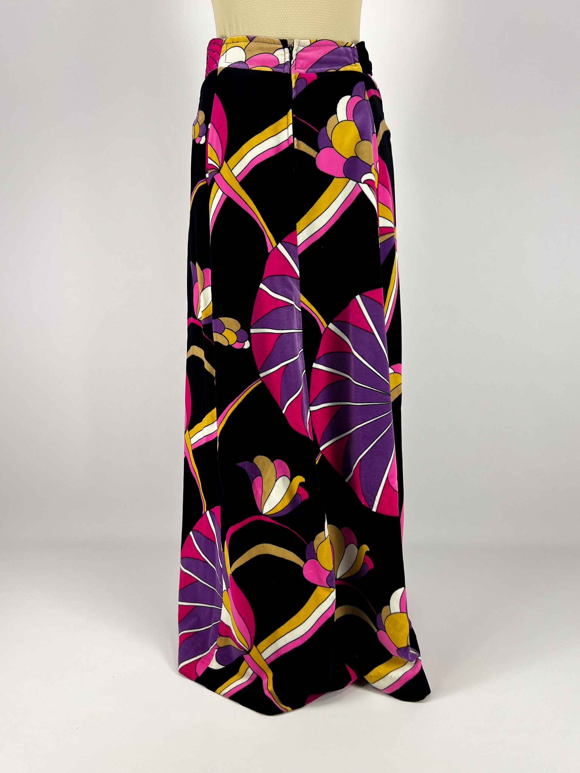 Particolare gonna lunga anni ’70 firmata Capucine (Paris), realizzata in un velluto morbido e corposo, impreziosito da un’eccezionale stampa psichedelica nei toni del fucsia, viola, giallo ocra e bianco su fondo nero.