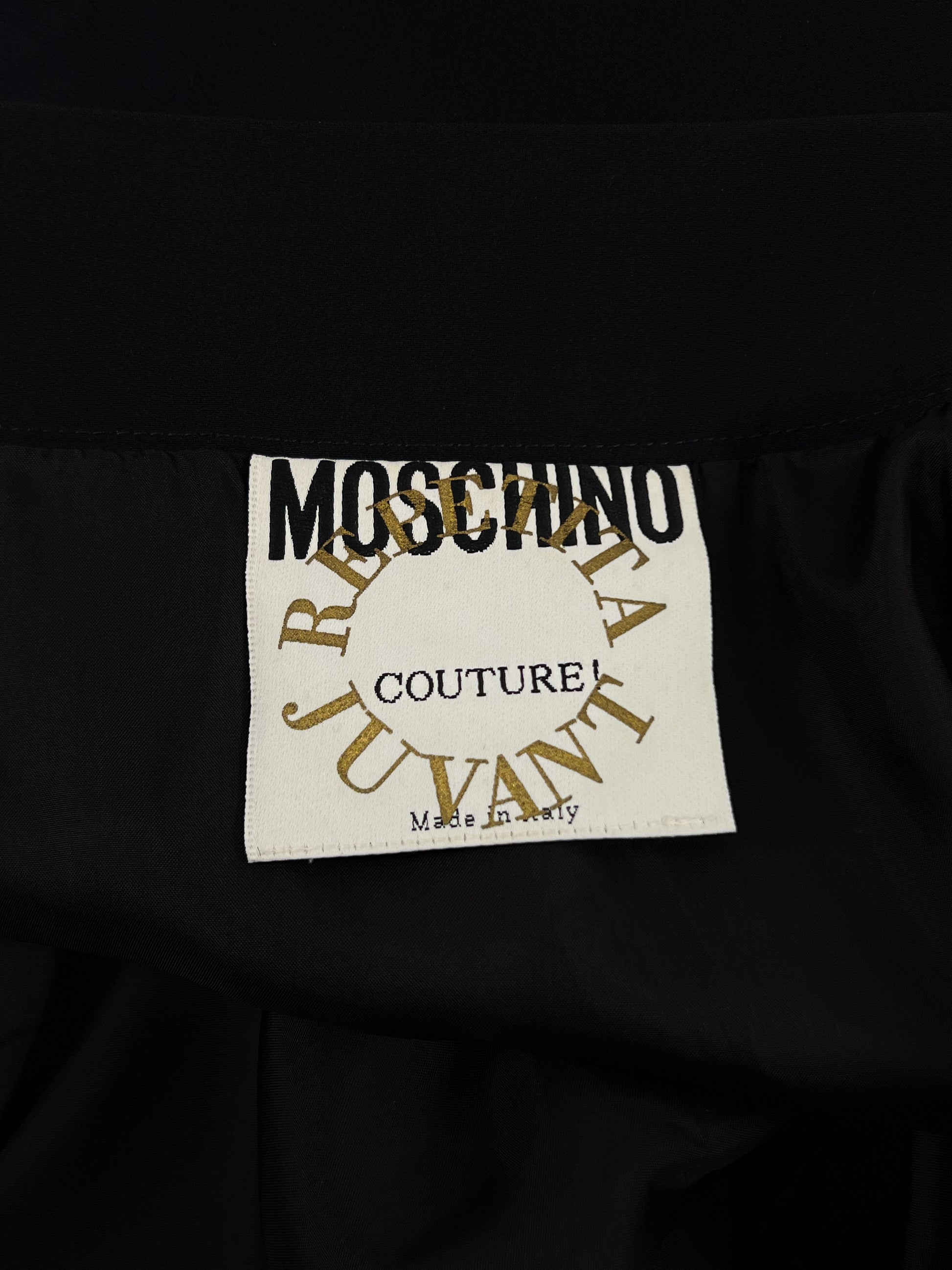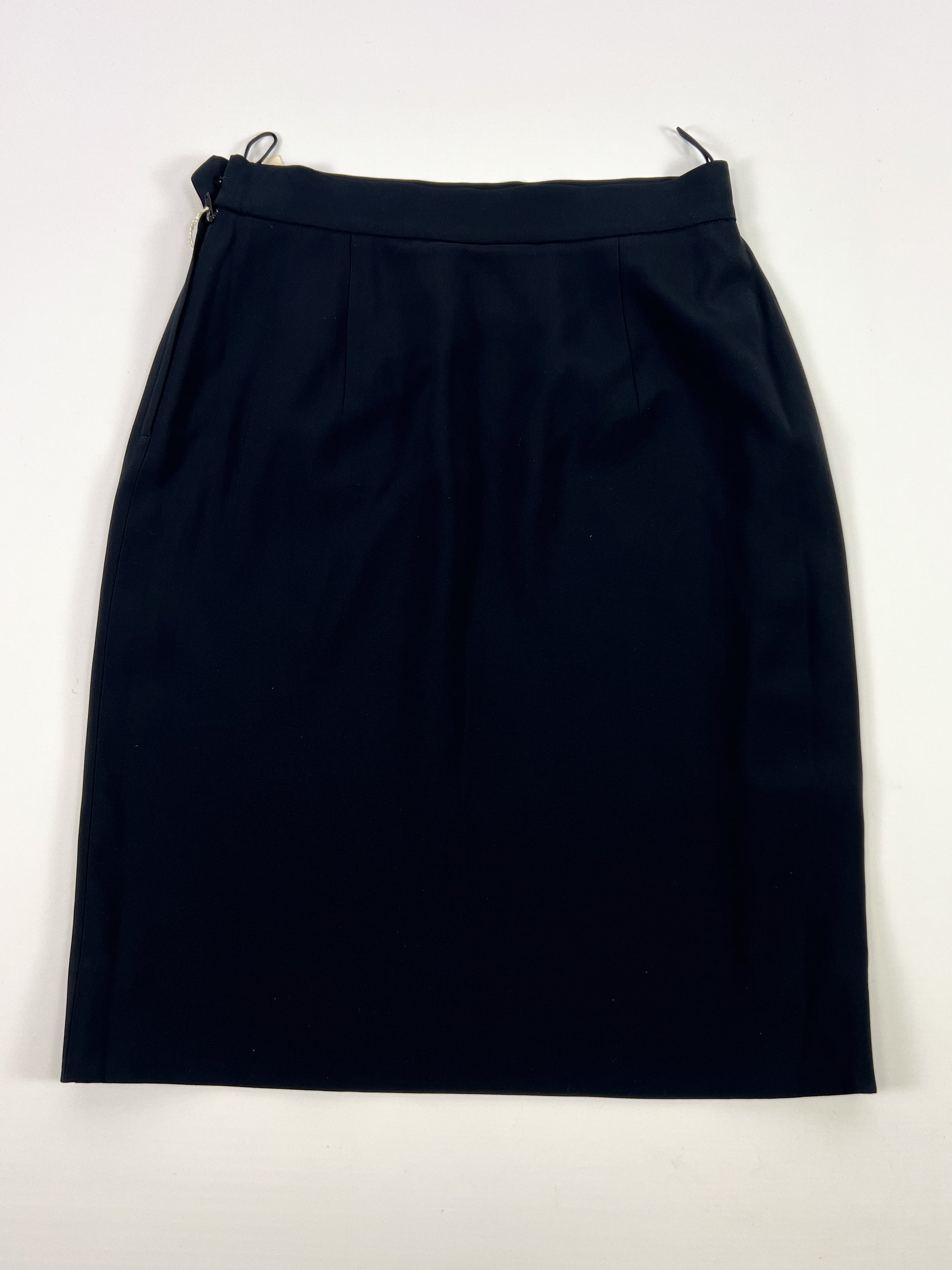 Elegante gonna dritta Moschino Couture!, realizzata in pura lana vergine con una linea essenziale e raffinata. Il modello, caratterizzato da una silhouette classica e versatile, presenta una chiusura laterale con bottone rivestito in tessuto e una costruzione sartoriale tipica della maison.