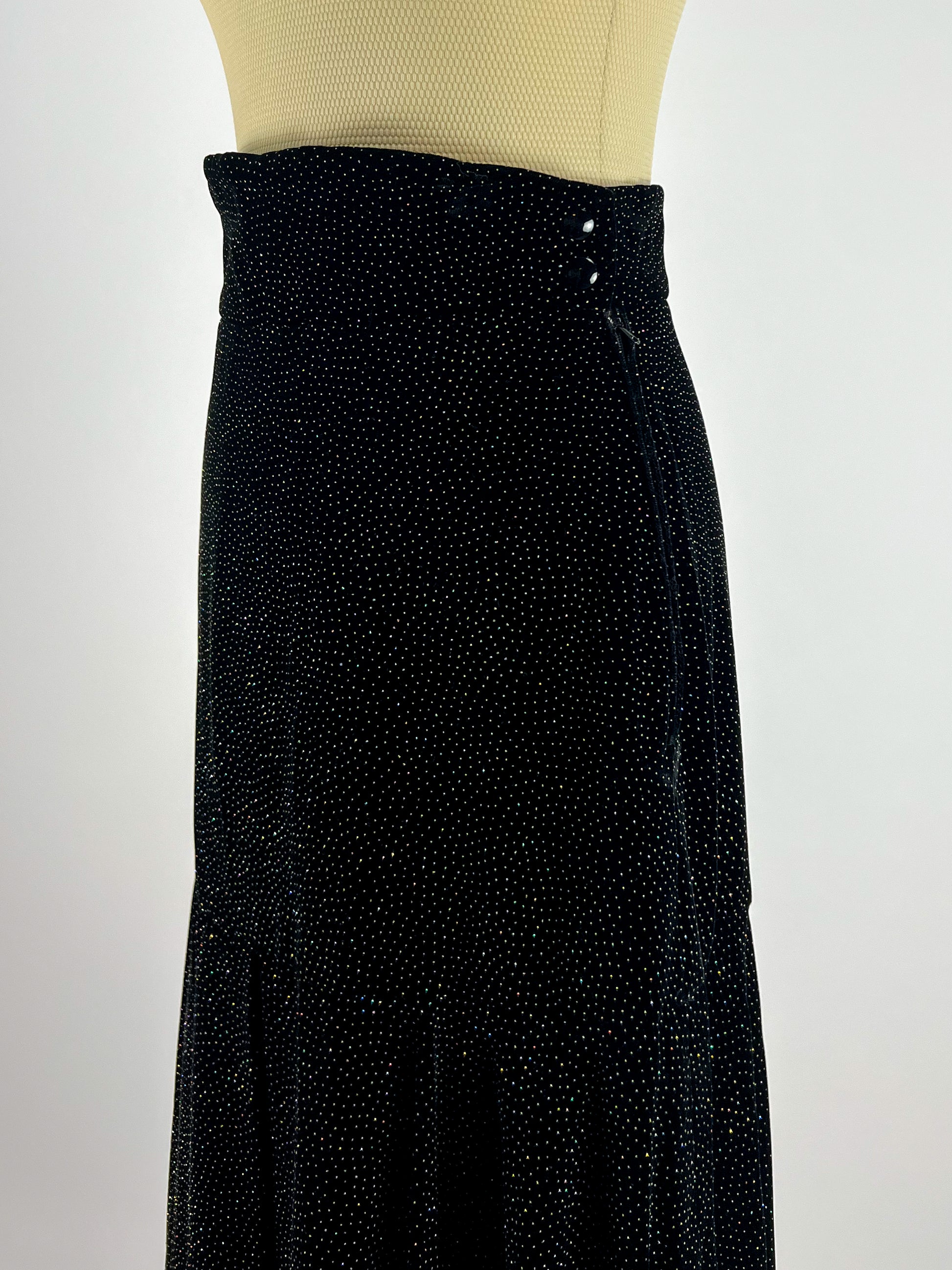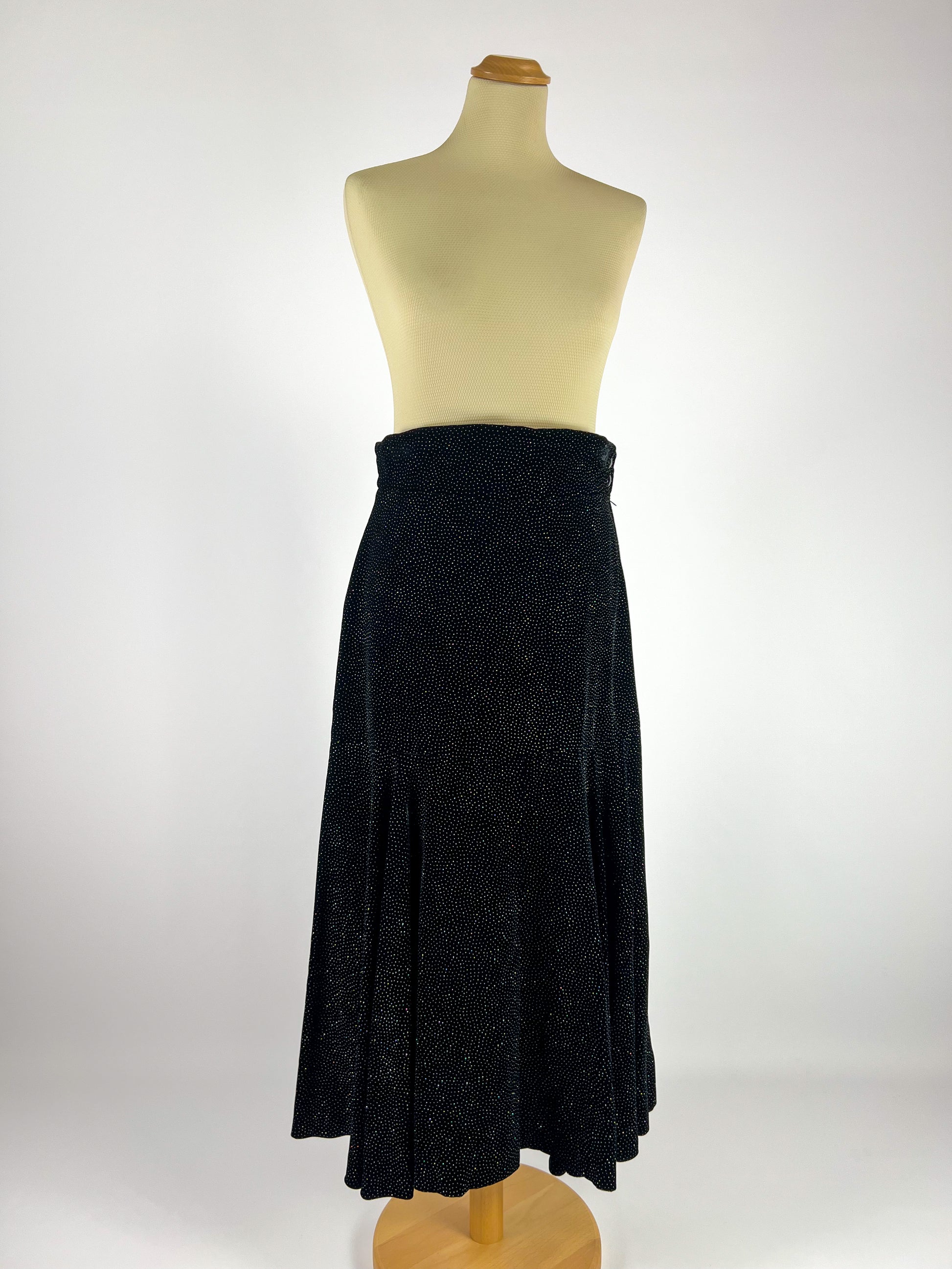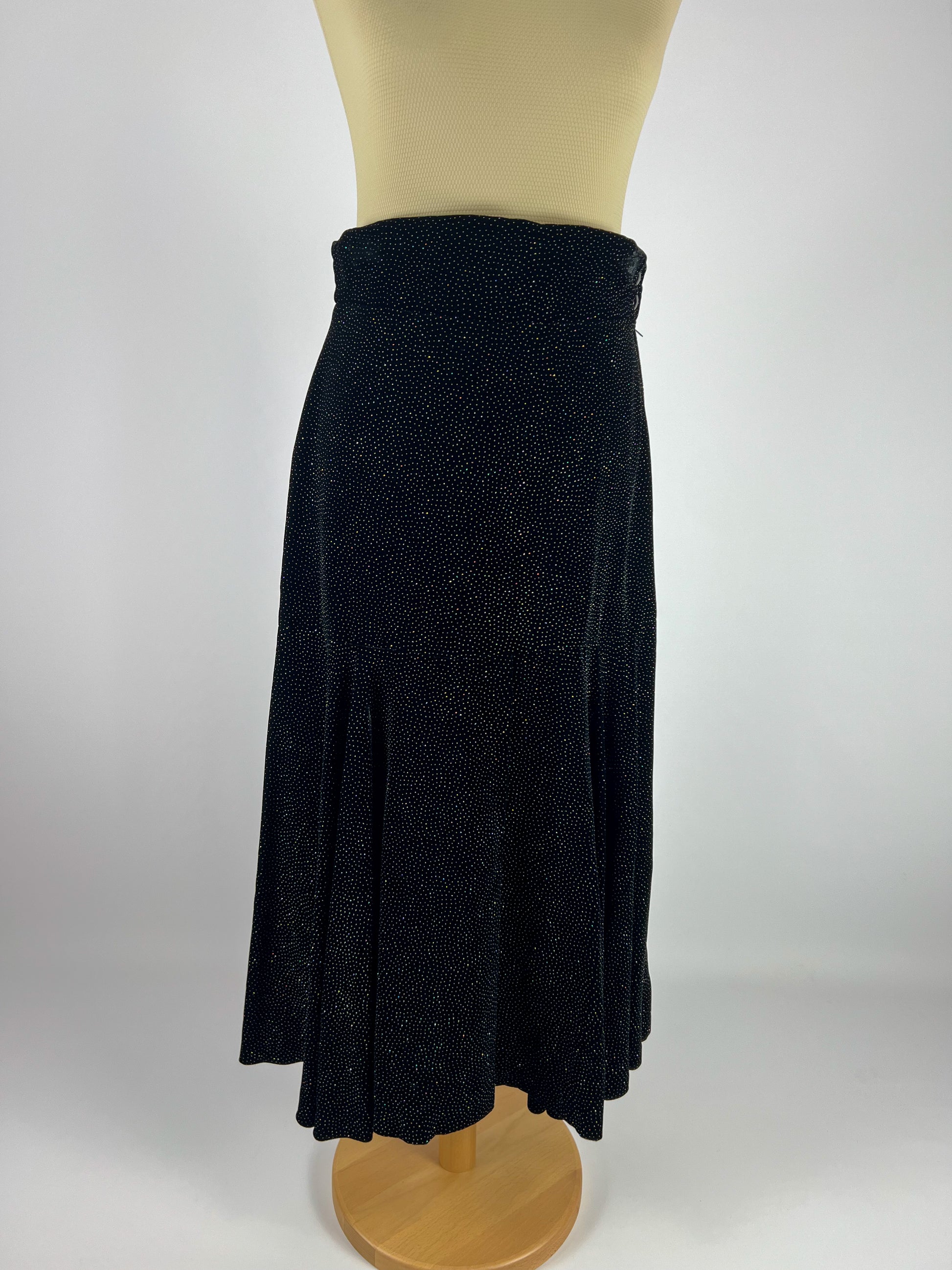 Bellissima gonna lunga firmata Regina Schrecker, nota modella e stilista degli anni ’70/’80. Realizzata in morbida viscosa, è impreziosita da una fitta pioggia di brillanti che donano luce e movimento al capo.