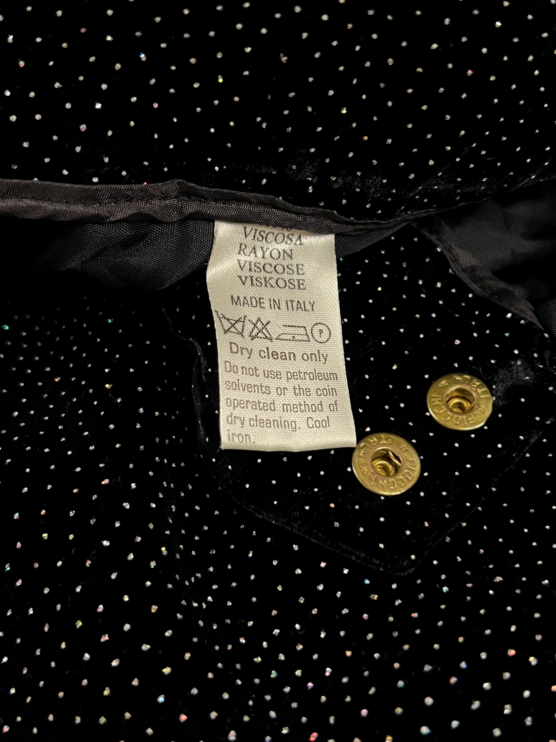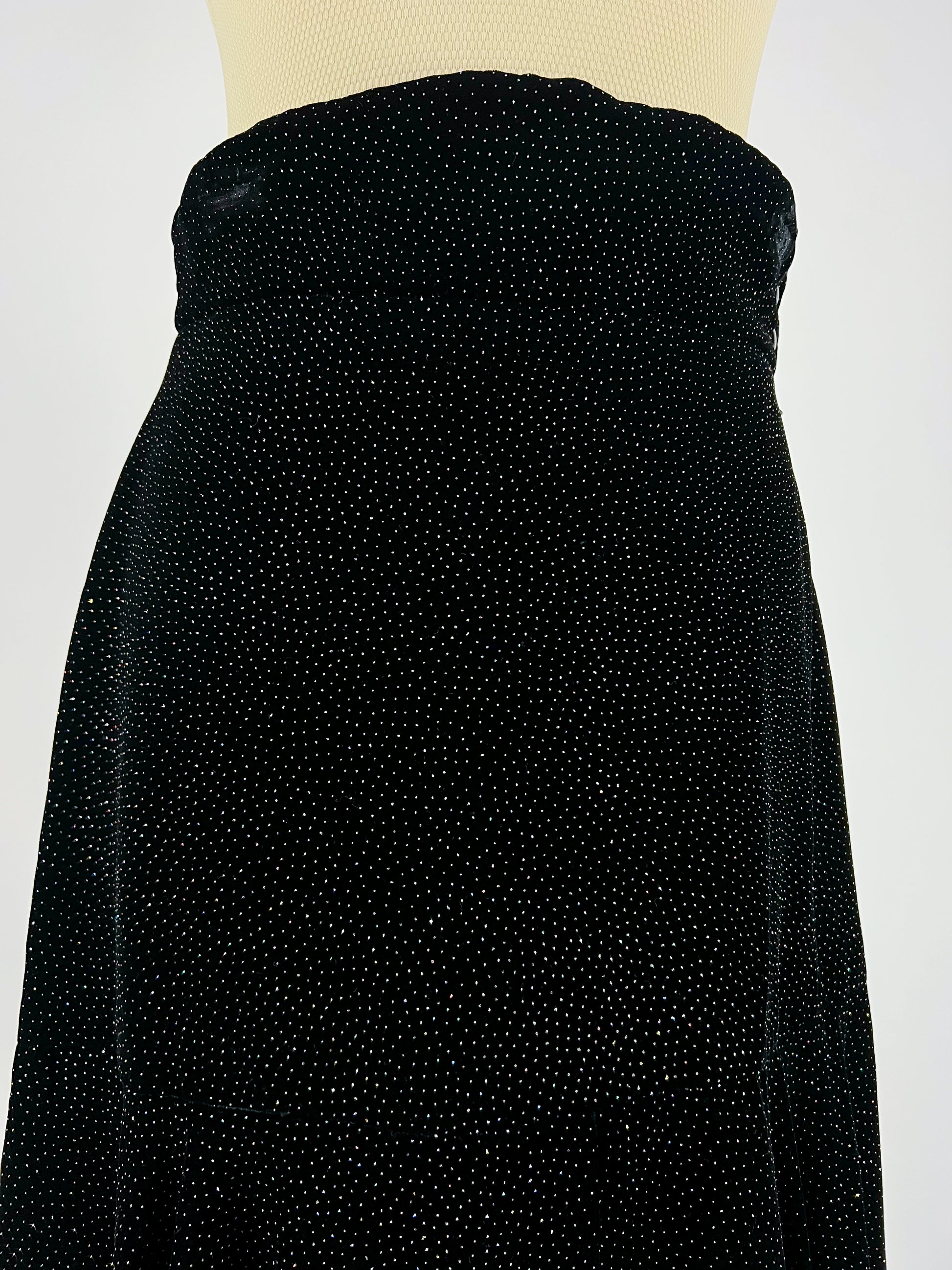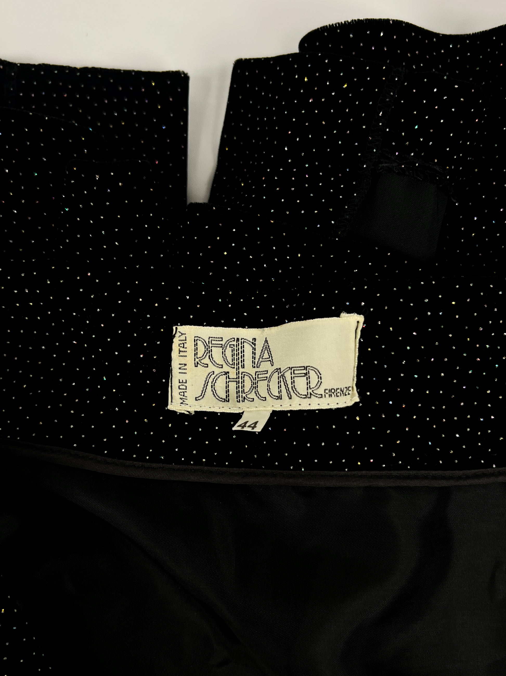 Bellissima gonna lunga firmata Regina Schrecker, nota modella e stilista degli anni ’70/’80. Realizzata in morbida viscosa, è impreziosita da una fitta pioggia di brillanti che donano luce e movimento al capo.