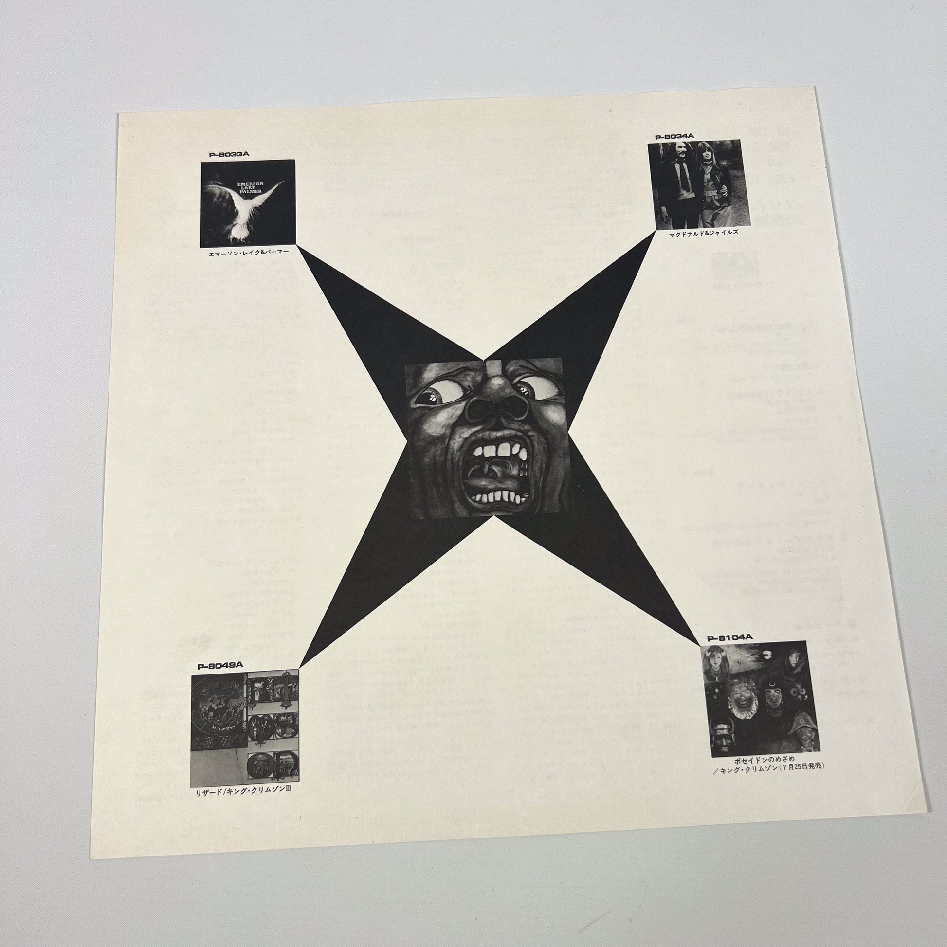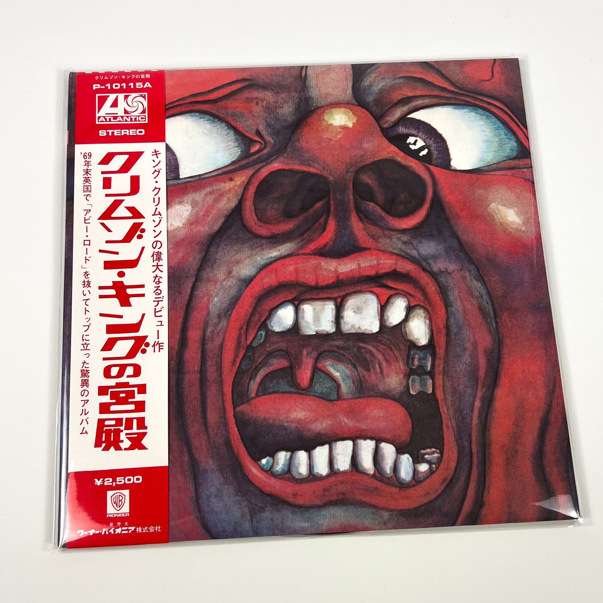 Stampa giapponese del 1971 del capolavoro “In The Court Of The Crimson King” dei King Crimson, pubblicata da Atlantic / Warner-Pioneer con codice catalogo P-10115A, completa di OBI originale da ¥2.500, copertina apribile (gatefold) e inserto con testi e note in giapponese.