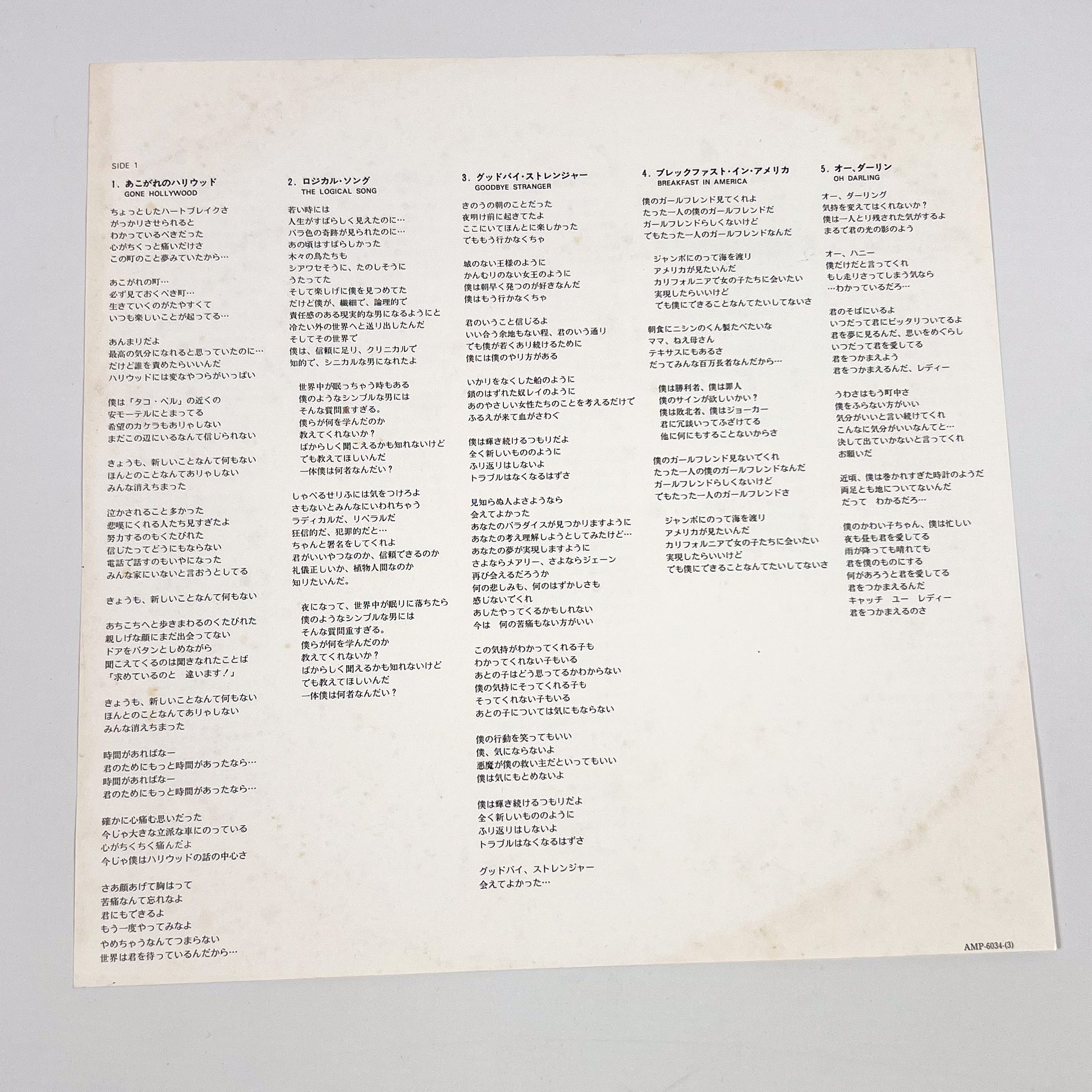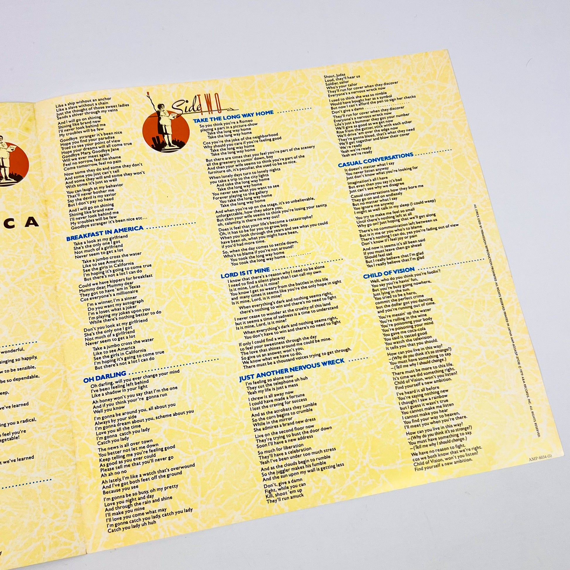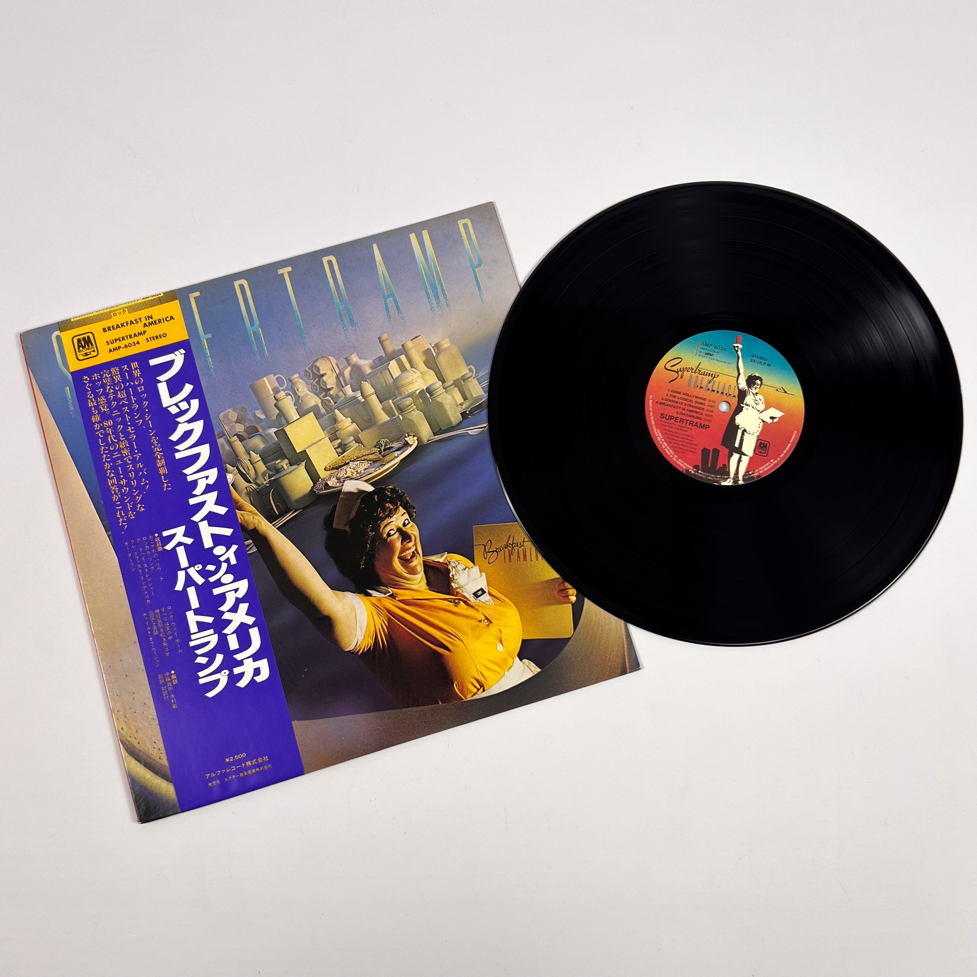 Stampa giapponese del 1979 dello storico album “Breakfast in America” dei Supertramp, pubblicata da A&M Records Japan con codice catalogo AMP-6034.