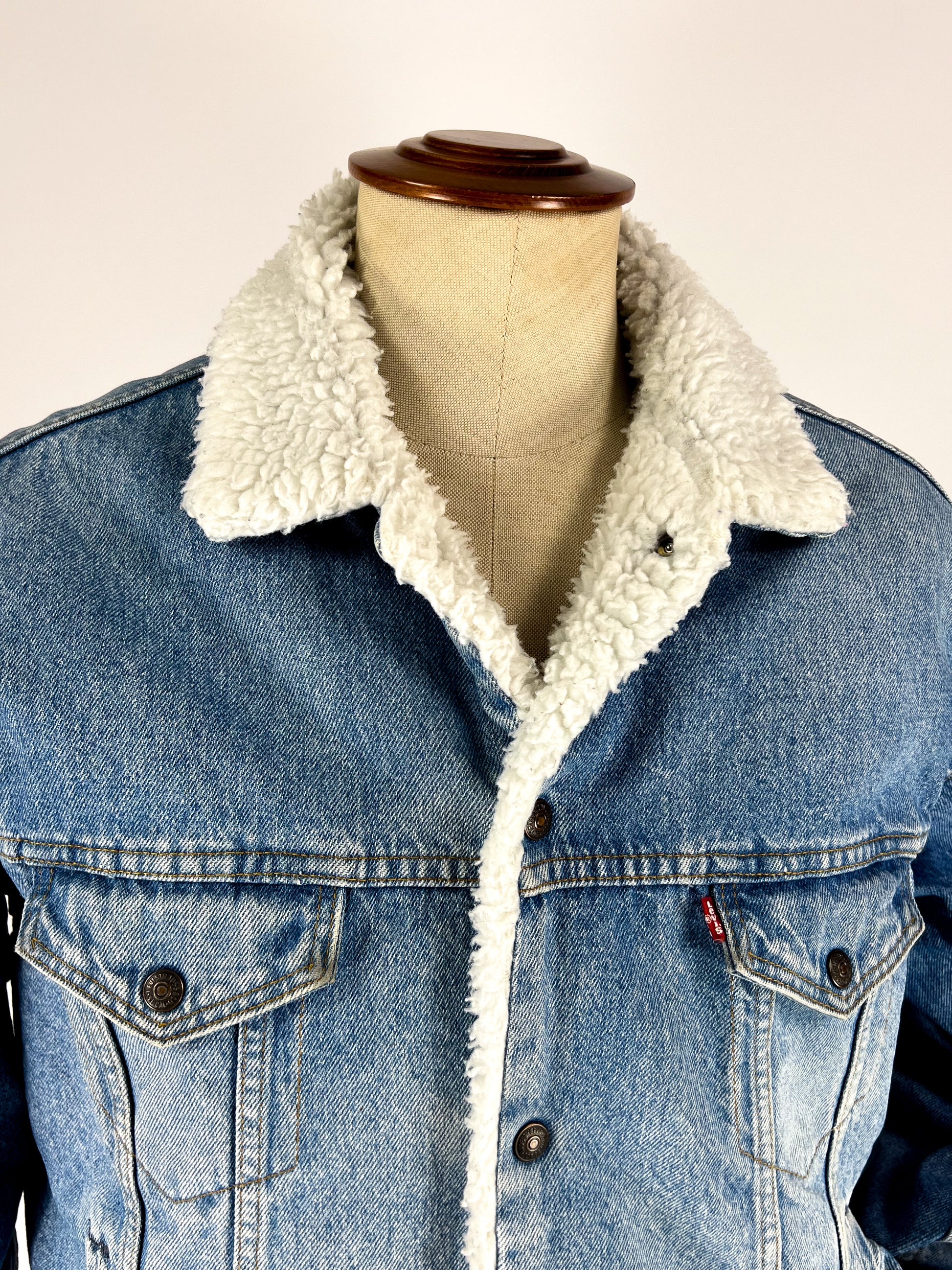 Giacca Sherpa vintage firmata Levi’s, risalente agli anni ’80 e Made in USA, realizzata in robusto denim blu con caratteristica fodera interna in sherpa color avorio. Il modello presenta colletto in sherpa, chiusura frontale con bottoni metallici, due tasche sul petto con patta e due tasche laterali a filo.