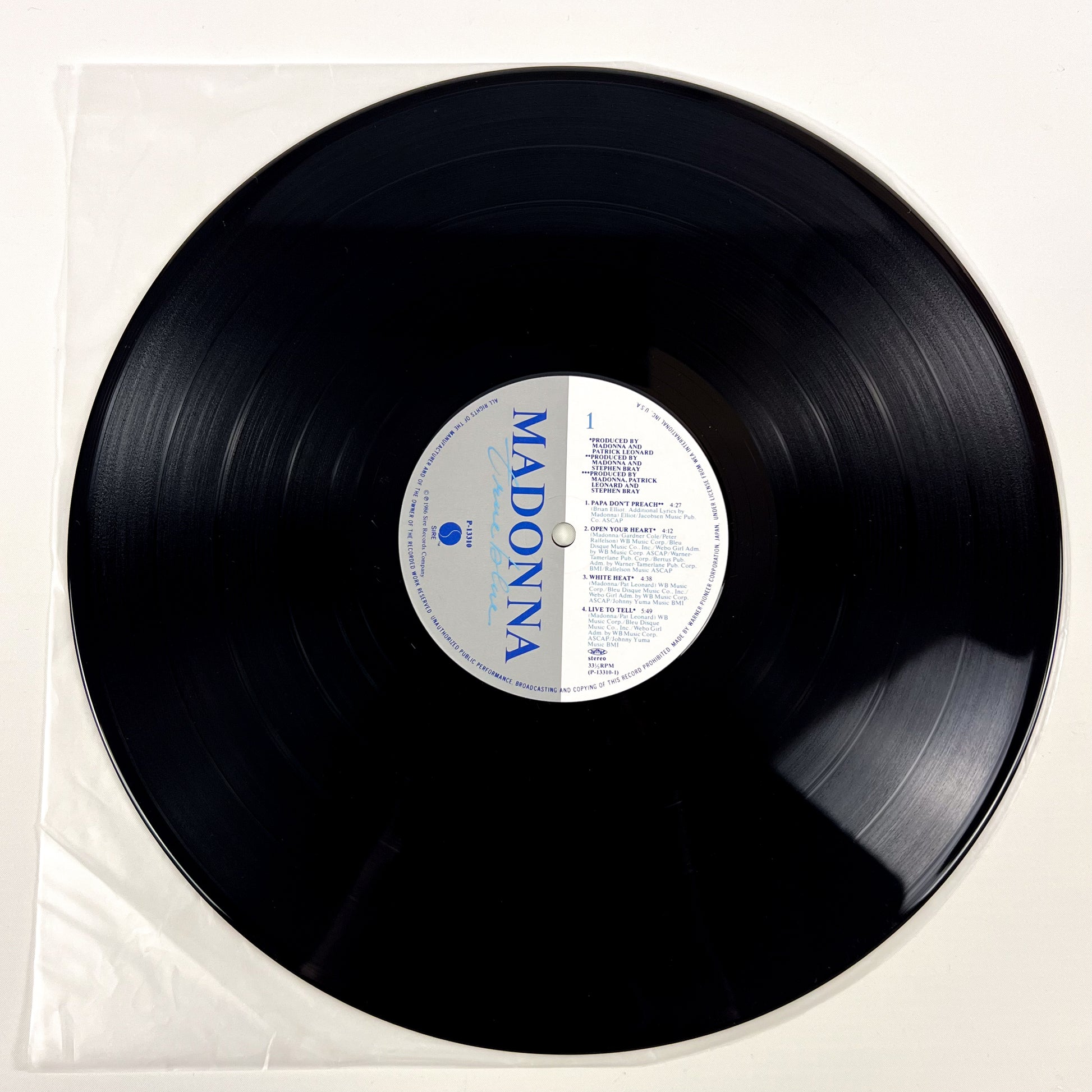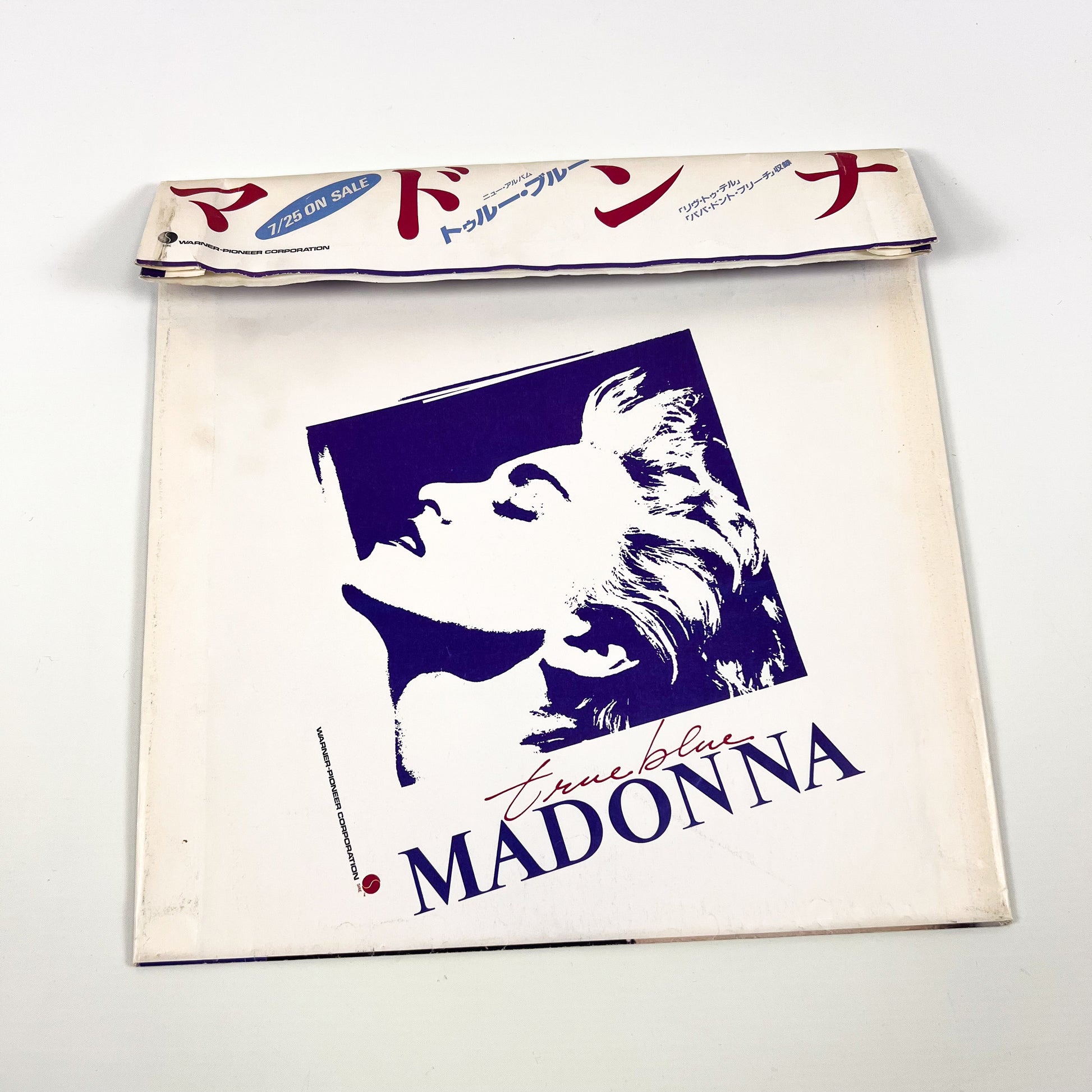 Prima stampa giapponese originale dell’album “True Blue” di Madonna, pubblicata nel 1986 da Warner-Pioneer Corporation con codice catalogo P-13310, completa di OBI originale e rara busta promozionale esterna in carta.