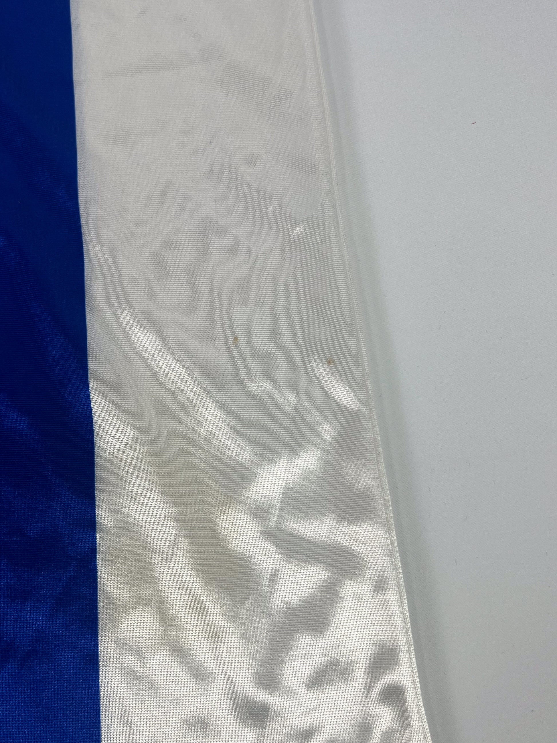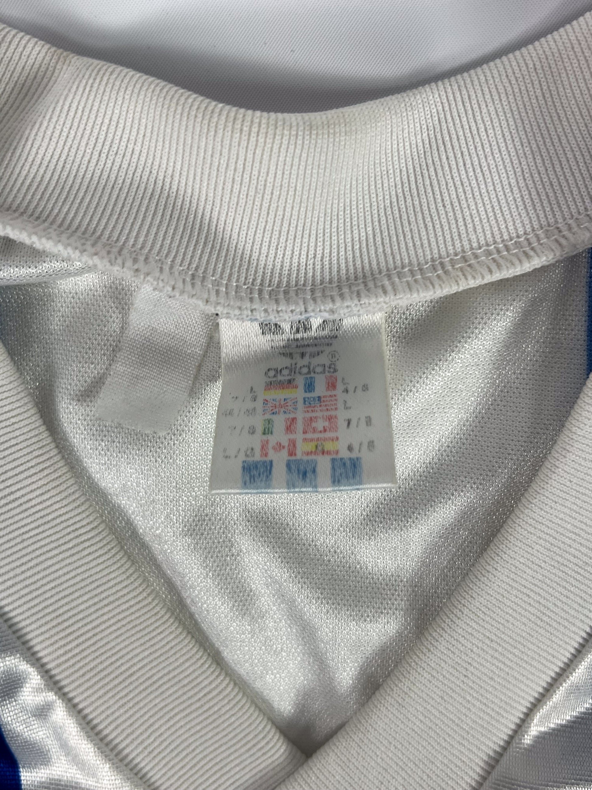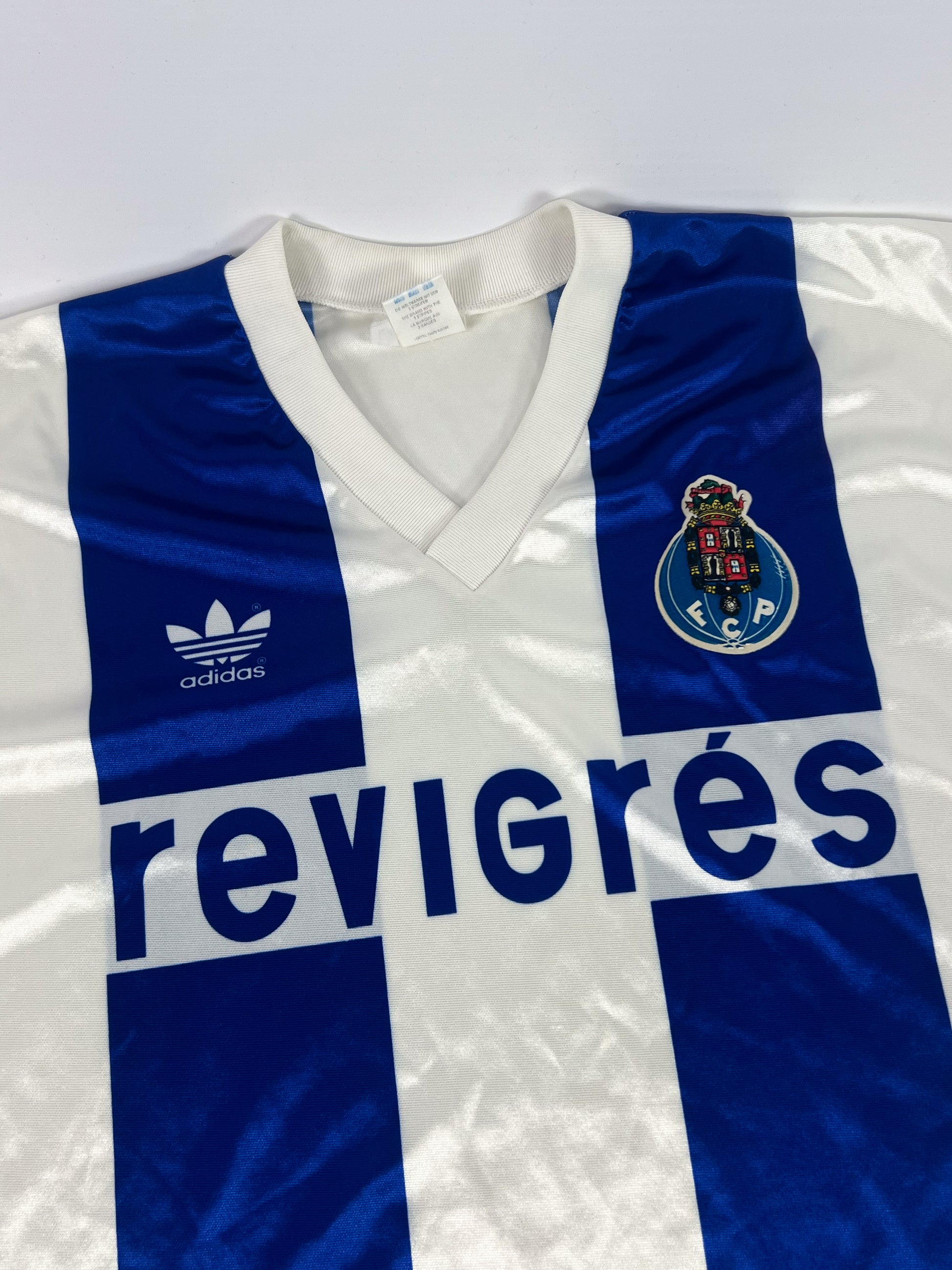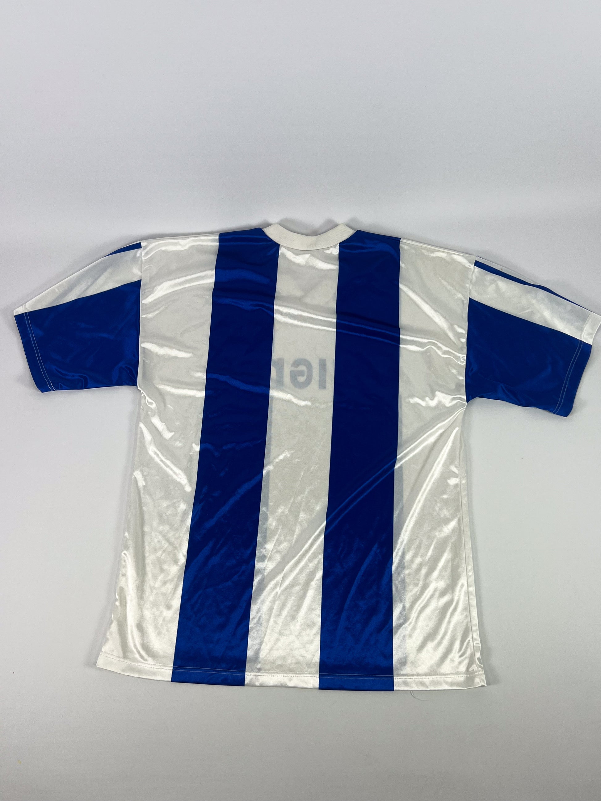 Maglia originale FC Porto prodotta da Adidas nei primi anni ’90, caratterizzata dal classico design a righe verticali blu e bianche in tessuto lucido tipico dell’epoca.