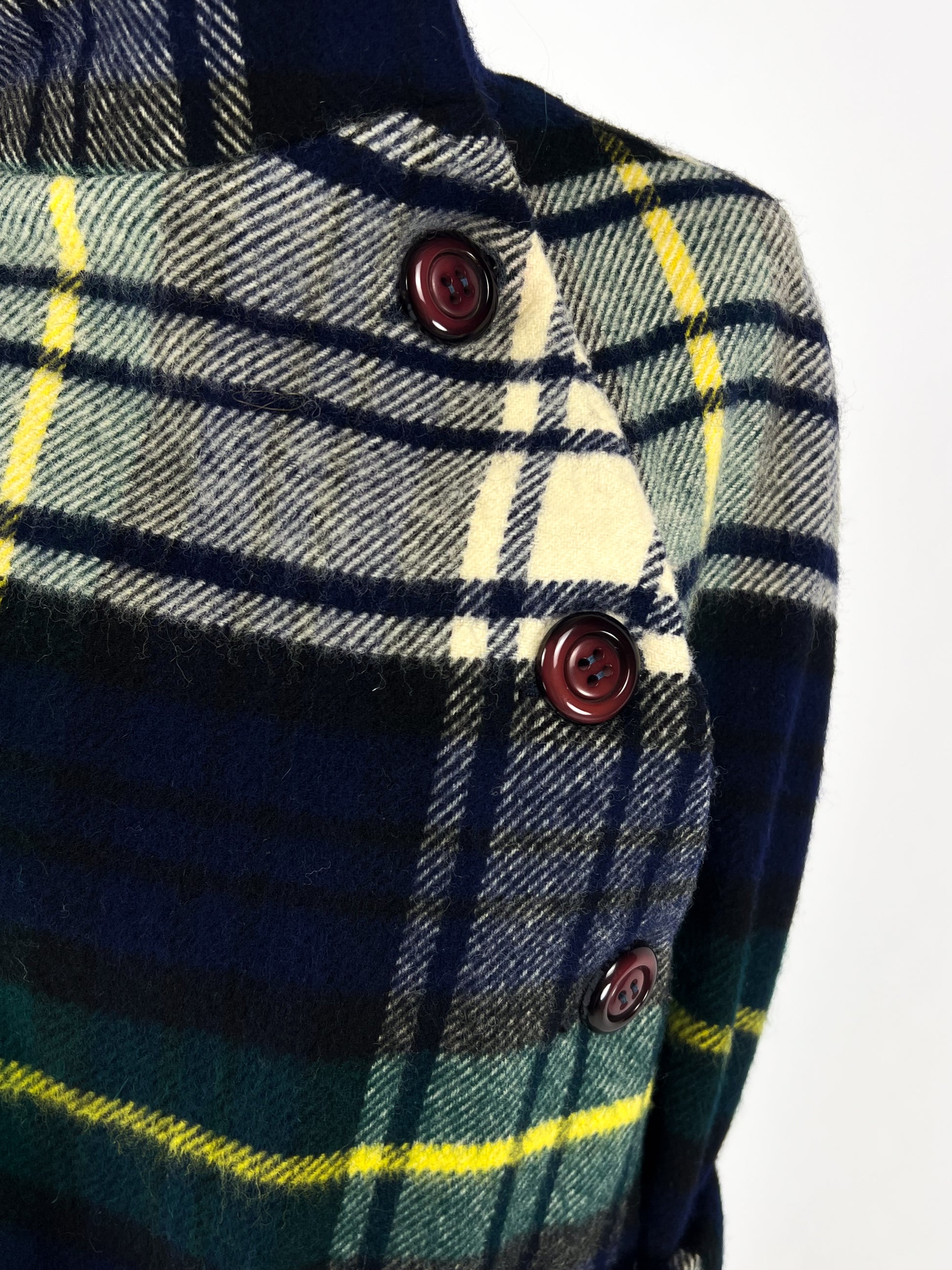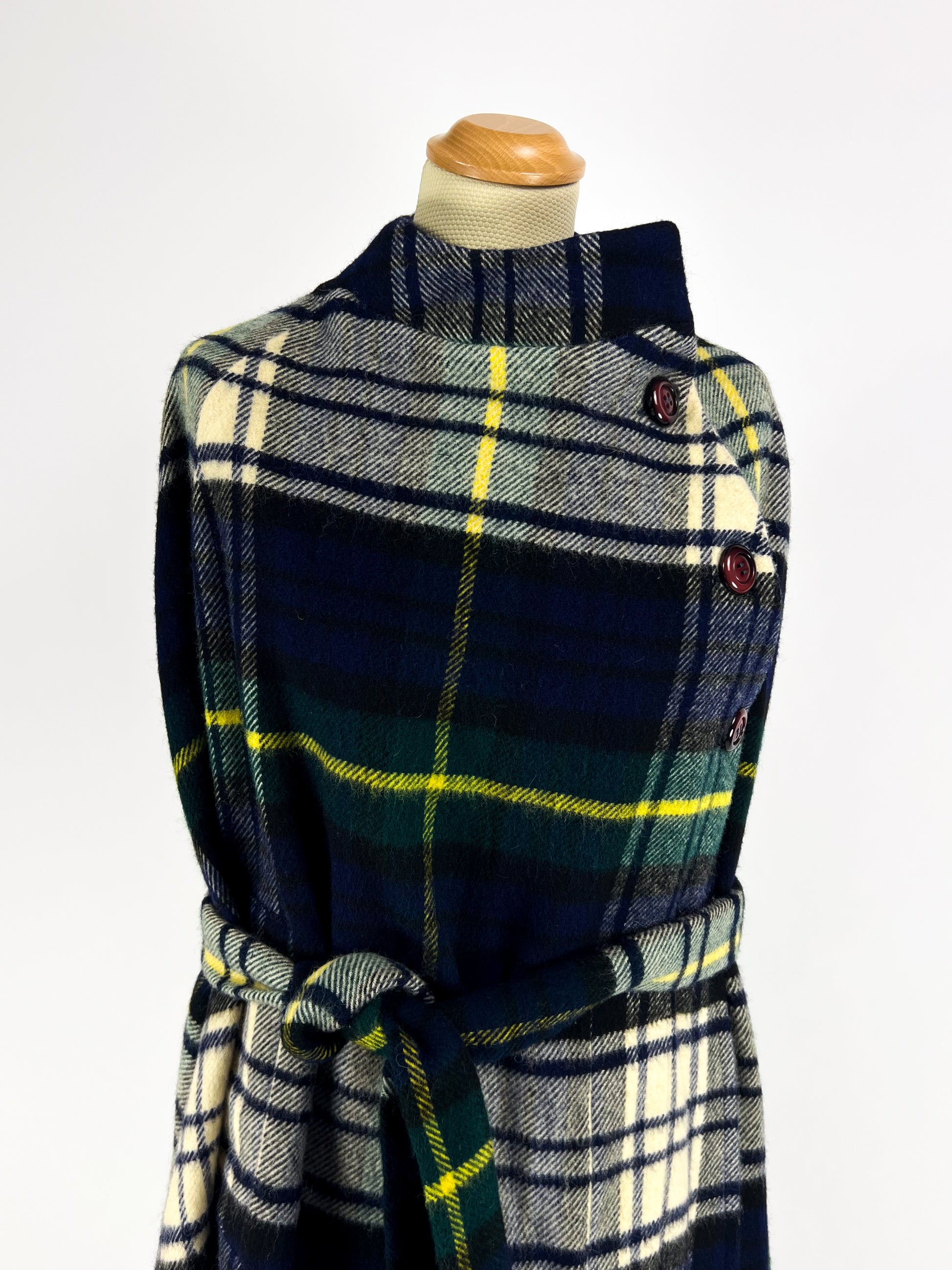 Modello mantella con taglio ampio e avvolgente, collo alto strutturato e chiusura frontale con bottoni originali. Linea elegante e femminile con cintura coordinata in vita per regolare la vestibilità. Fantasia tartan nei toni del blu, verde, panna e giallo. Interno foderato blu.