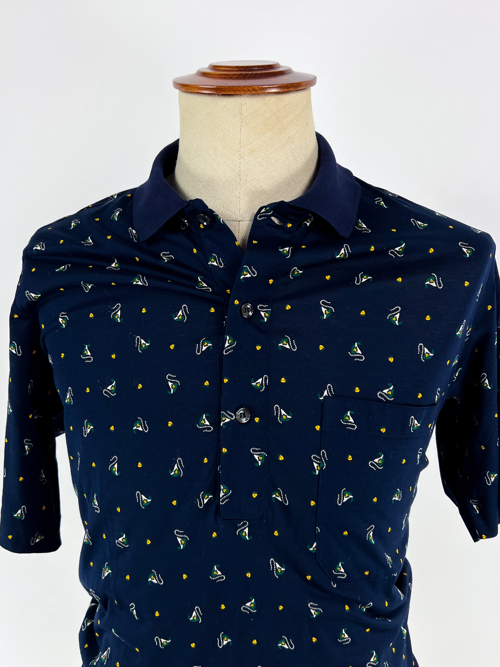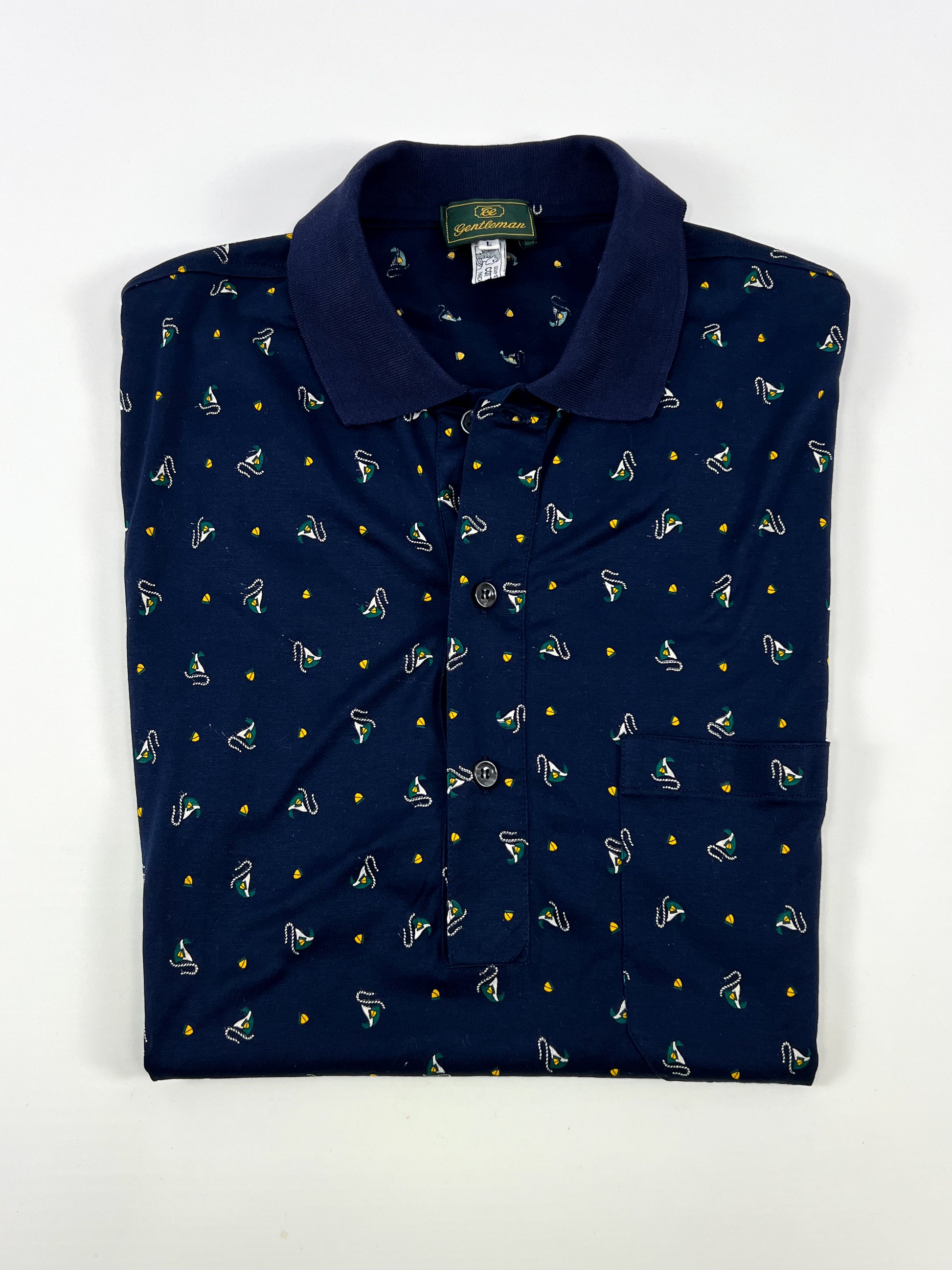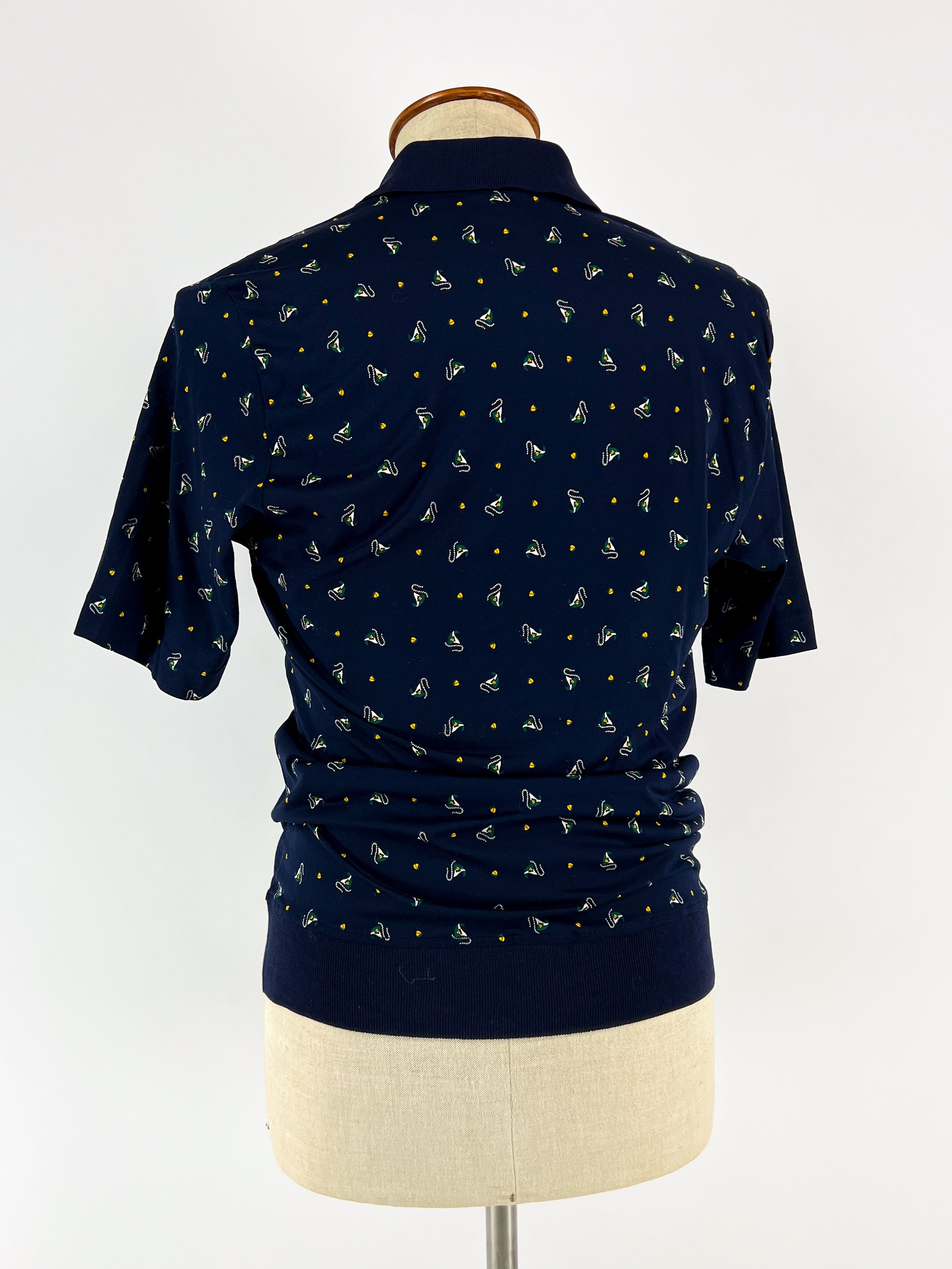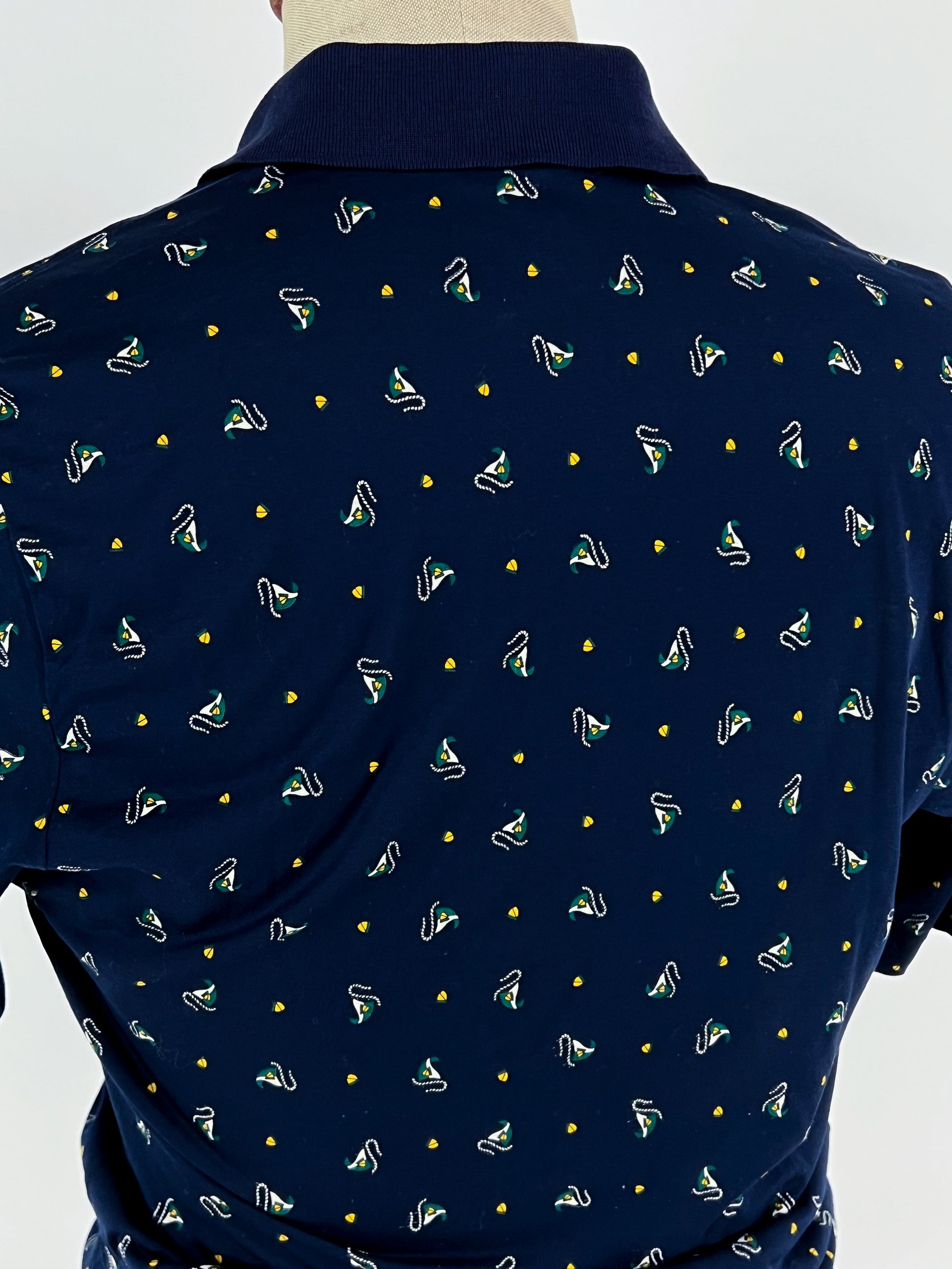 Polo anni'60 Schiatti x Gentleman in 100% cotone egizio. Il design presenta una raffinata base blu navy arricchita da un micro motivo geometrico con piccoli elementi decorativi a tema marinaresco. Modello con colletto classico e fondo con fascia elastica.