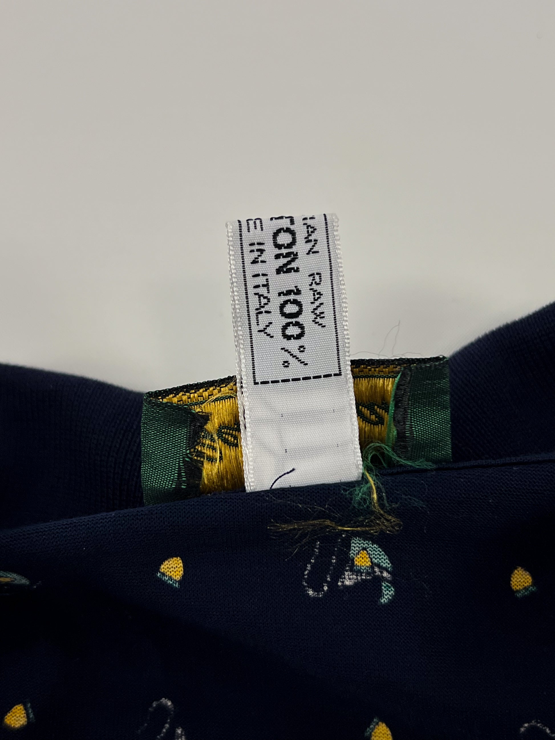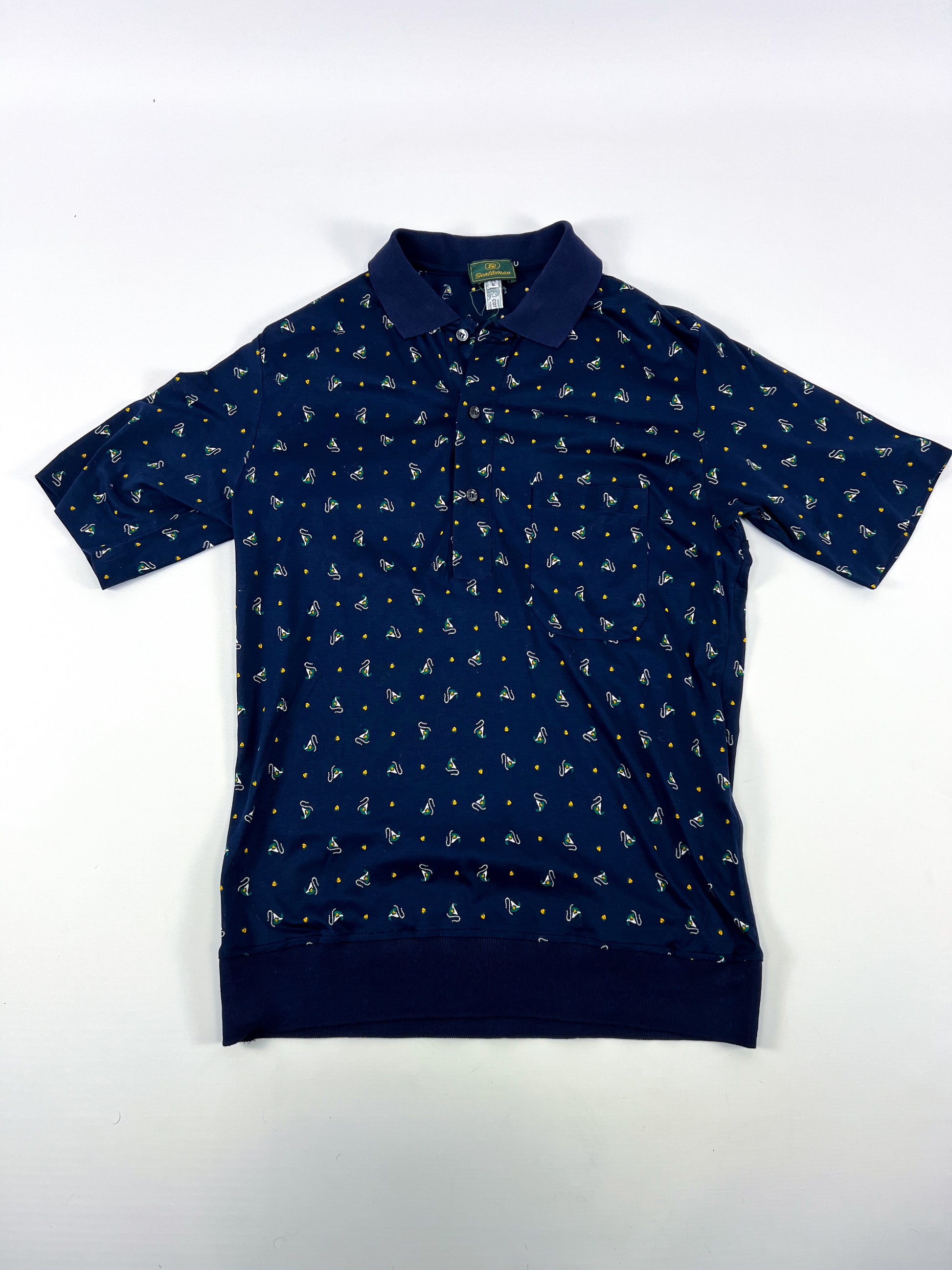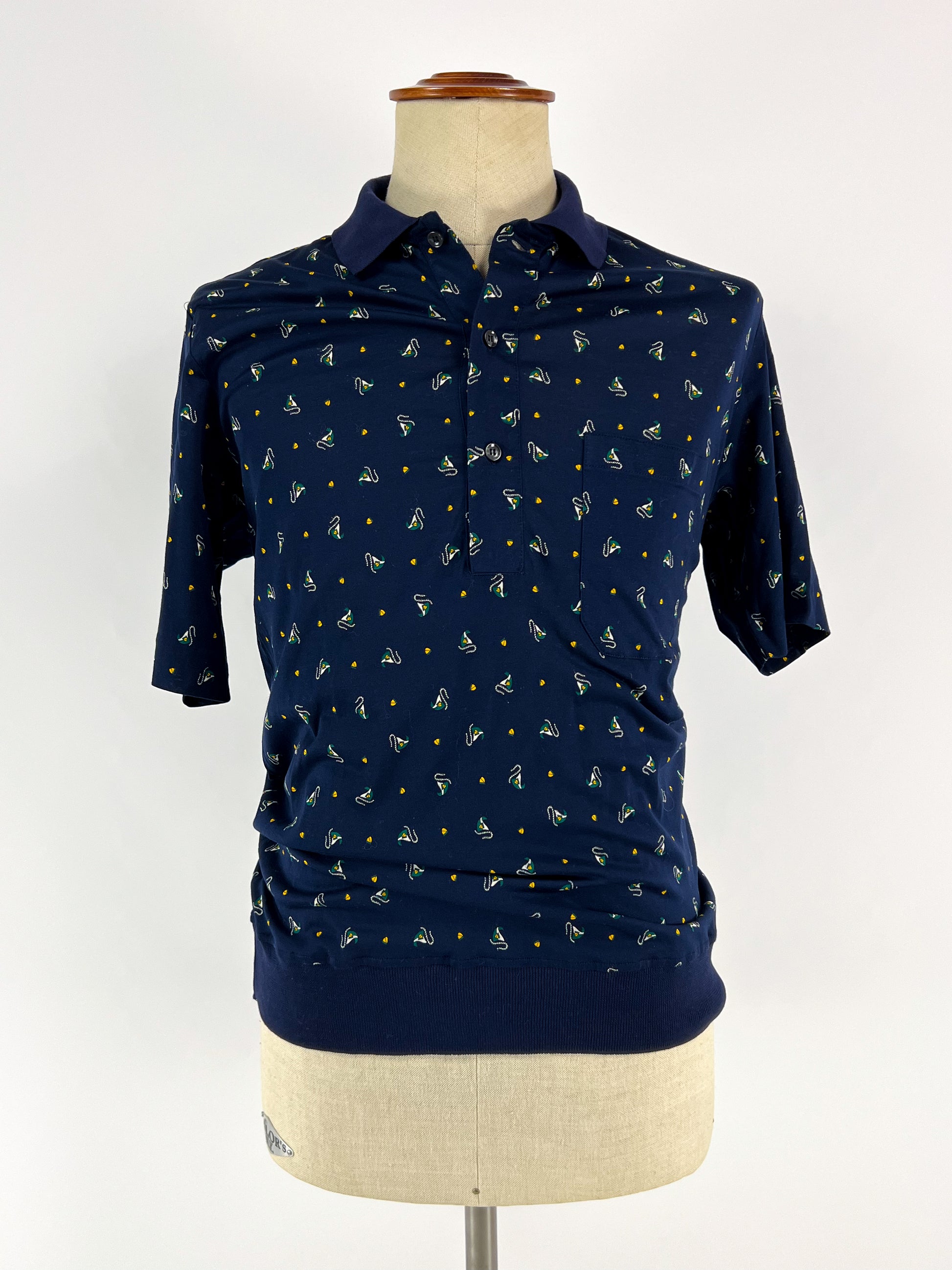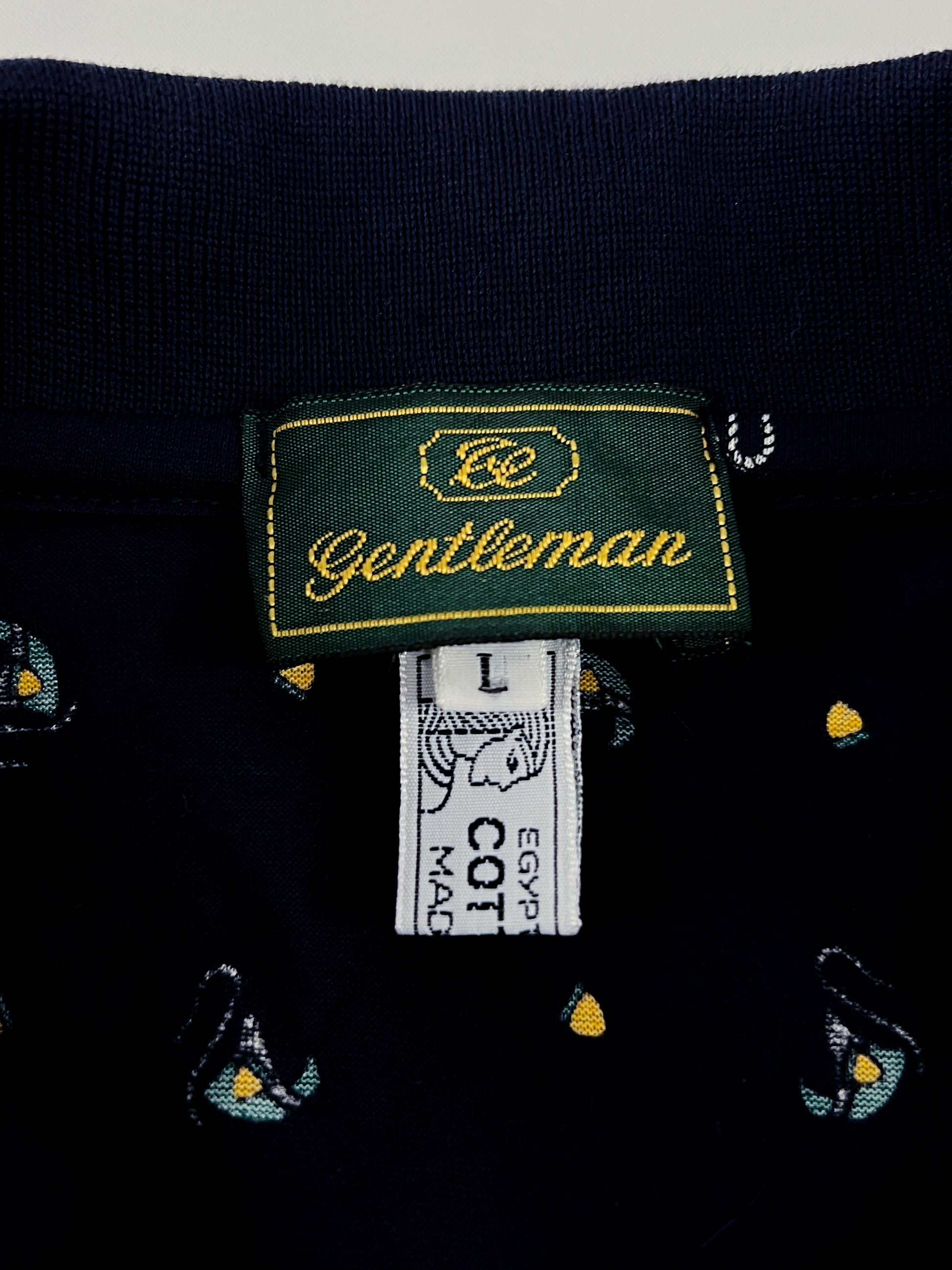 Polo anni'60 Schiatti x Gentleman in 100% cotone egizio. Il design presenta una raffinata base blu navy arricchita da un micro motivo geometrico con piccoli elementi decorativi a tema marinaresco. Modello con colletto classico e fondo con fascia elastica.