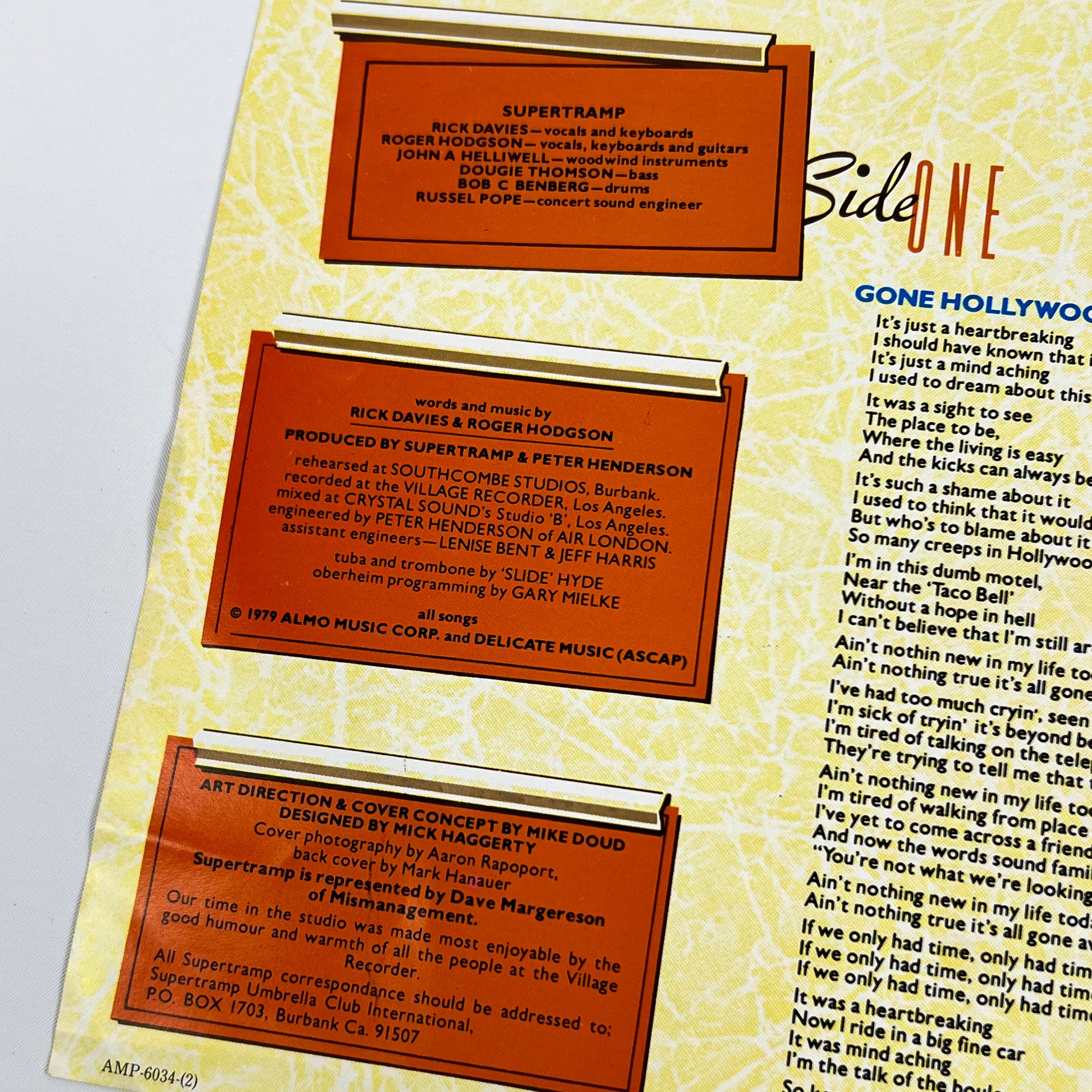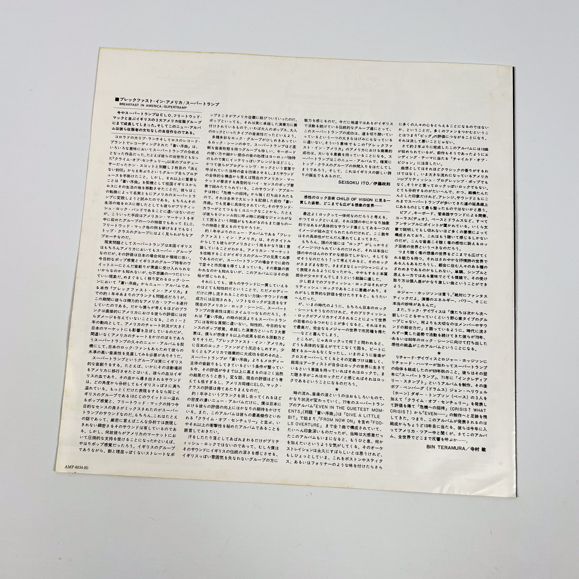 Rara prima edizione giapponese del celebre album “Breakfast in America”, pubblicata da A&M Records Japan nel 1979 con codice catalogo AMP-6034.