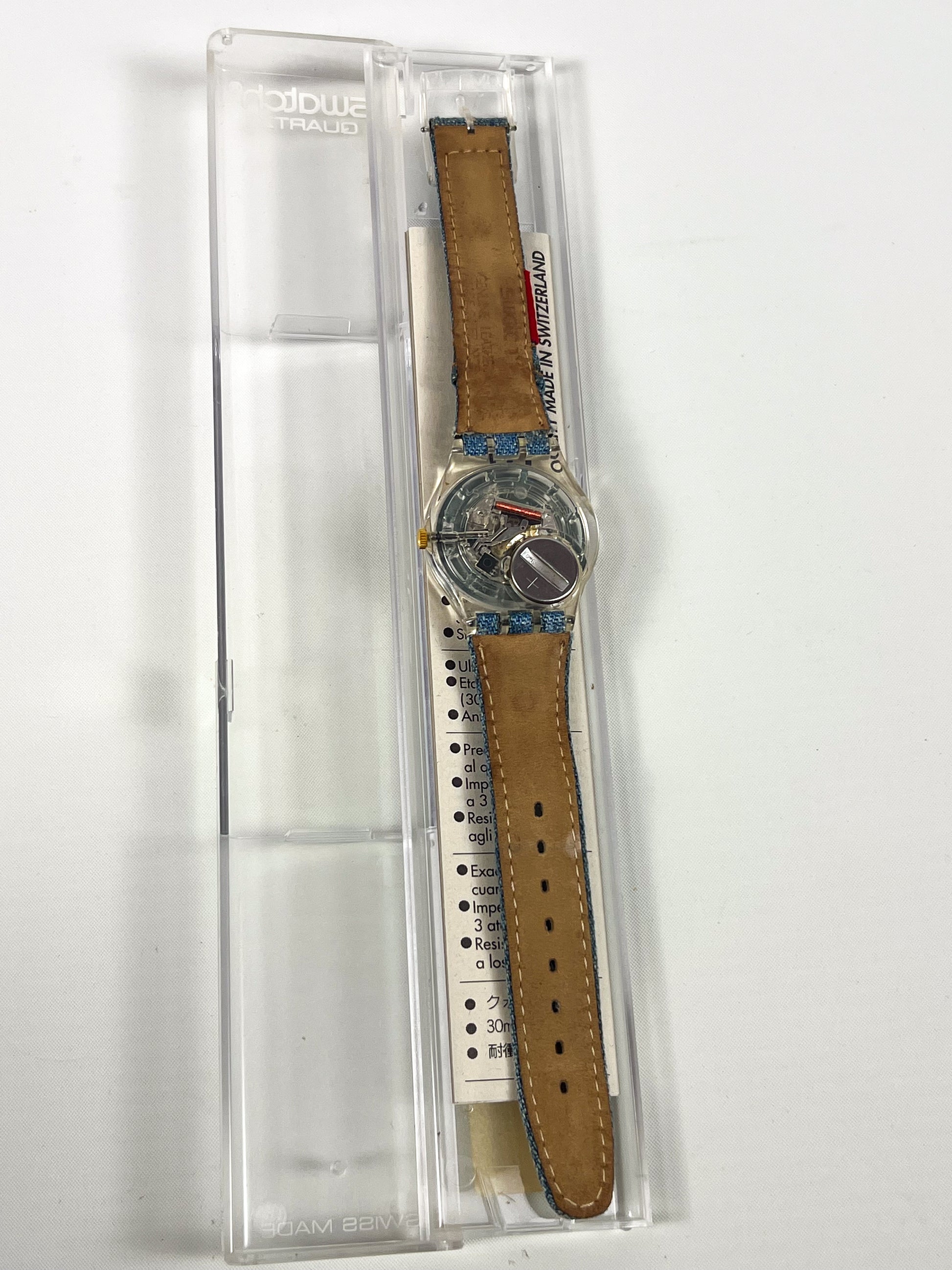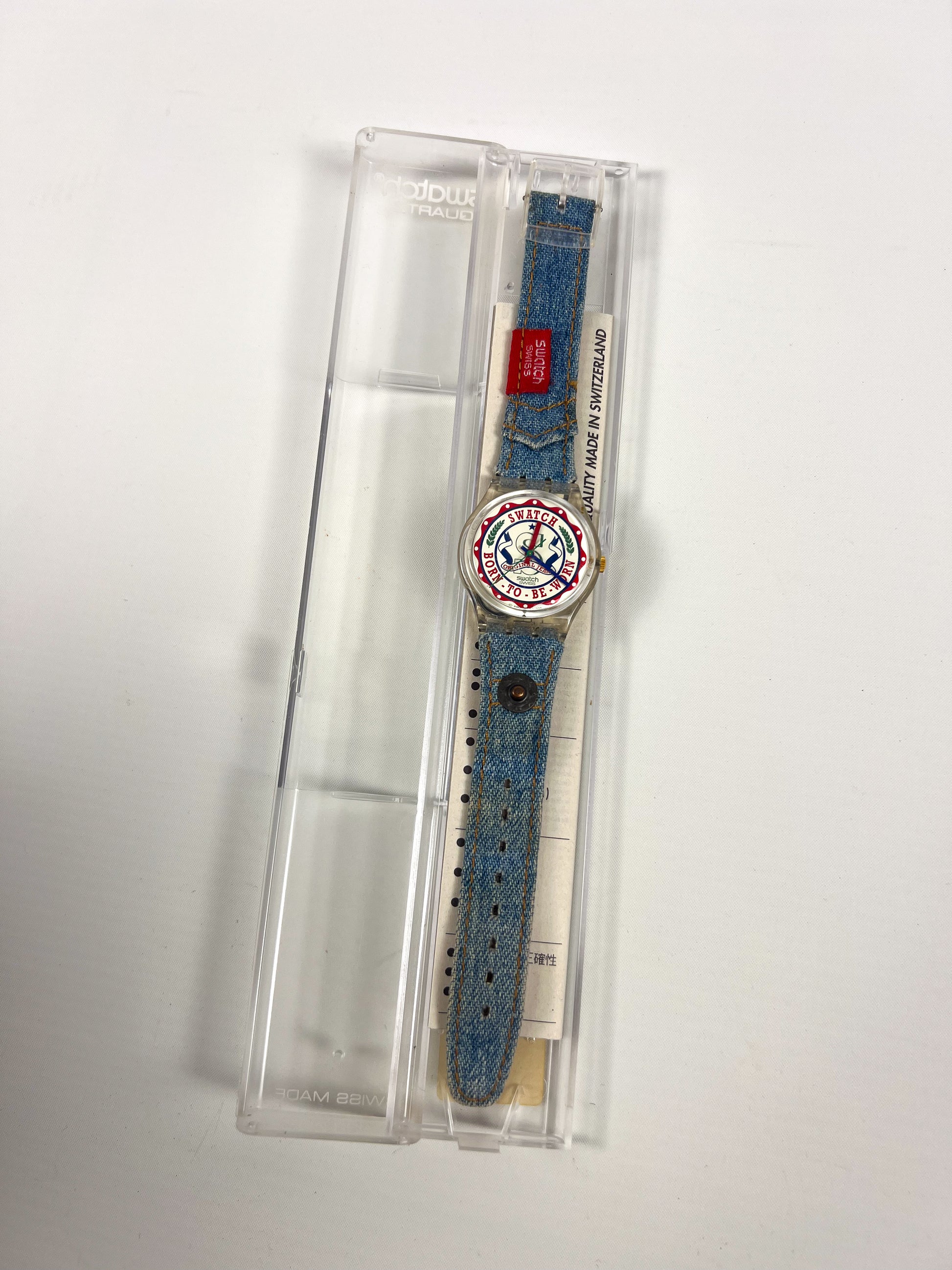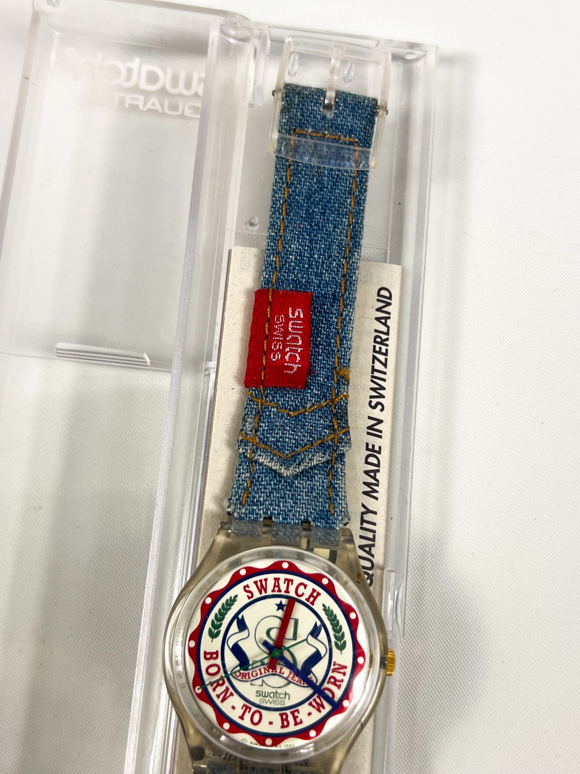Orologio Swatch Original Jeans Collection del 1994, ref. GK190, caratterizzato da cassa trasparente con movimento a vista sul fondello e quadrante bianco con grafica celebrativa “Born To Be Worn”, logo Swatch e dettagli nei colori rosso, verde e blu. Cinturino originale in tessuto denim con cuciture a contrasto e applicazione stile taschino jeans, fondello in pelle.