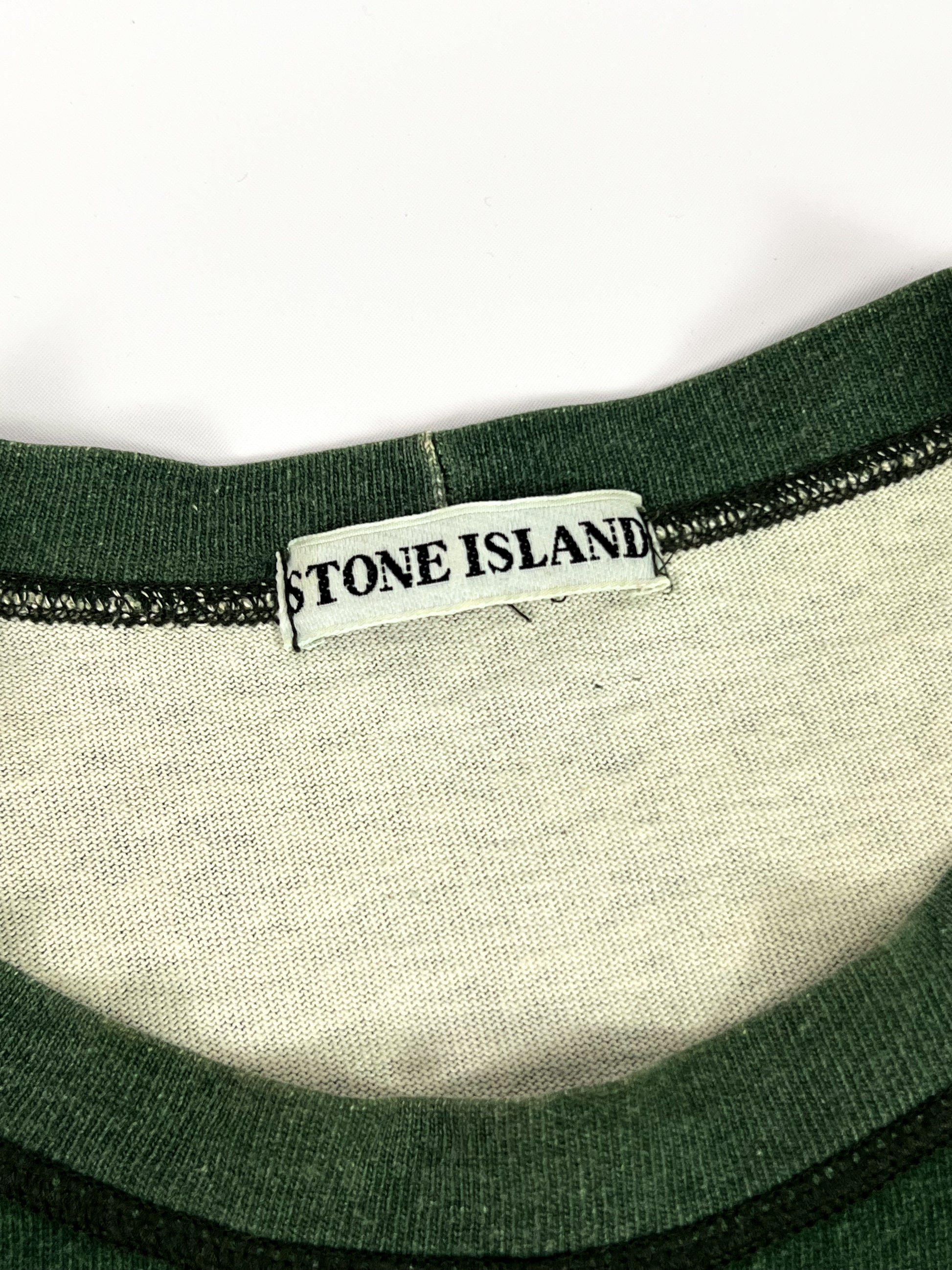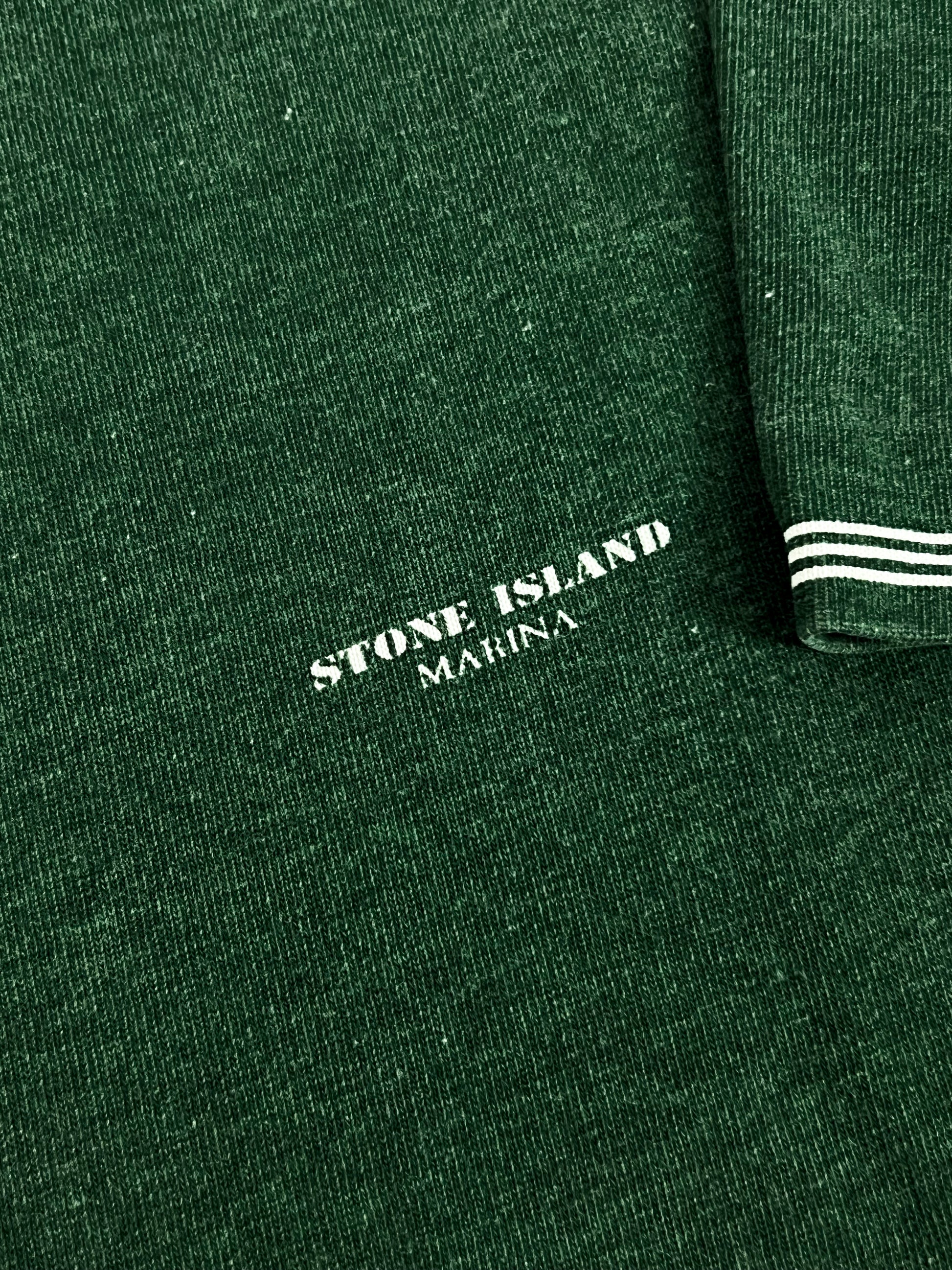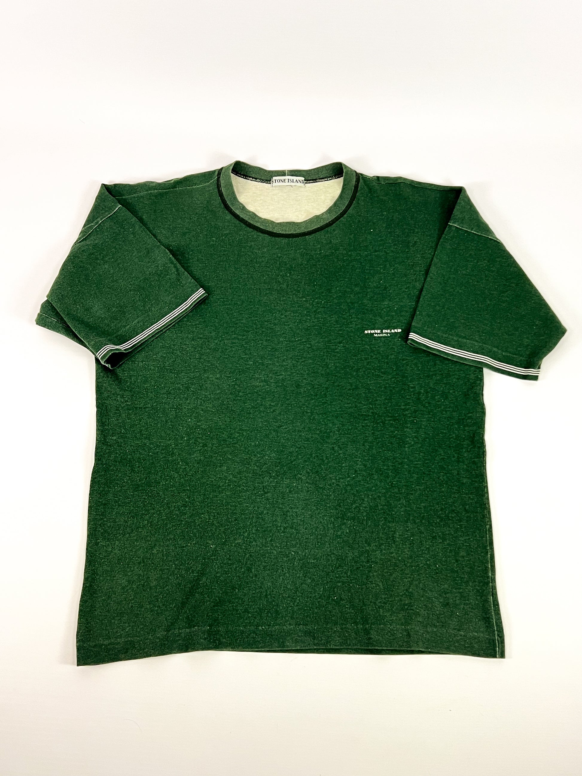 Realizzata in 100% cotone, presenta una tonalità verde bosco con leggera patina naturale dovuta all’età e ai lavaggi, che ne valorizza il carattere autentico vintage. Sul petto è presente la scritta “Stone Island Marina” stampata, dettaglio iconico delle prime linee del marchio. Girocollo classico, maniche corte con profilo a righe a contrasto.