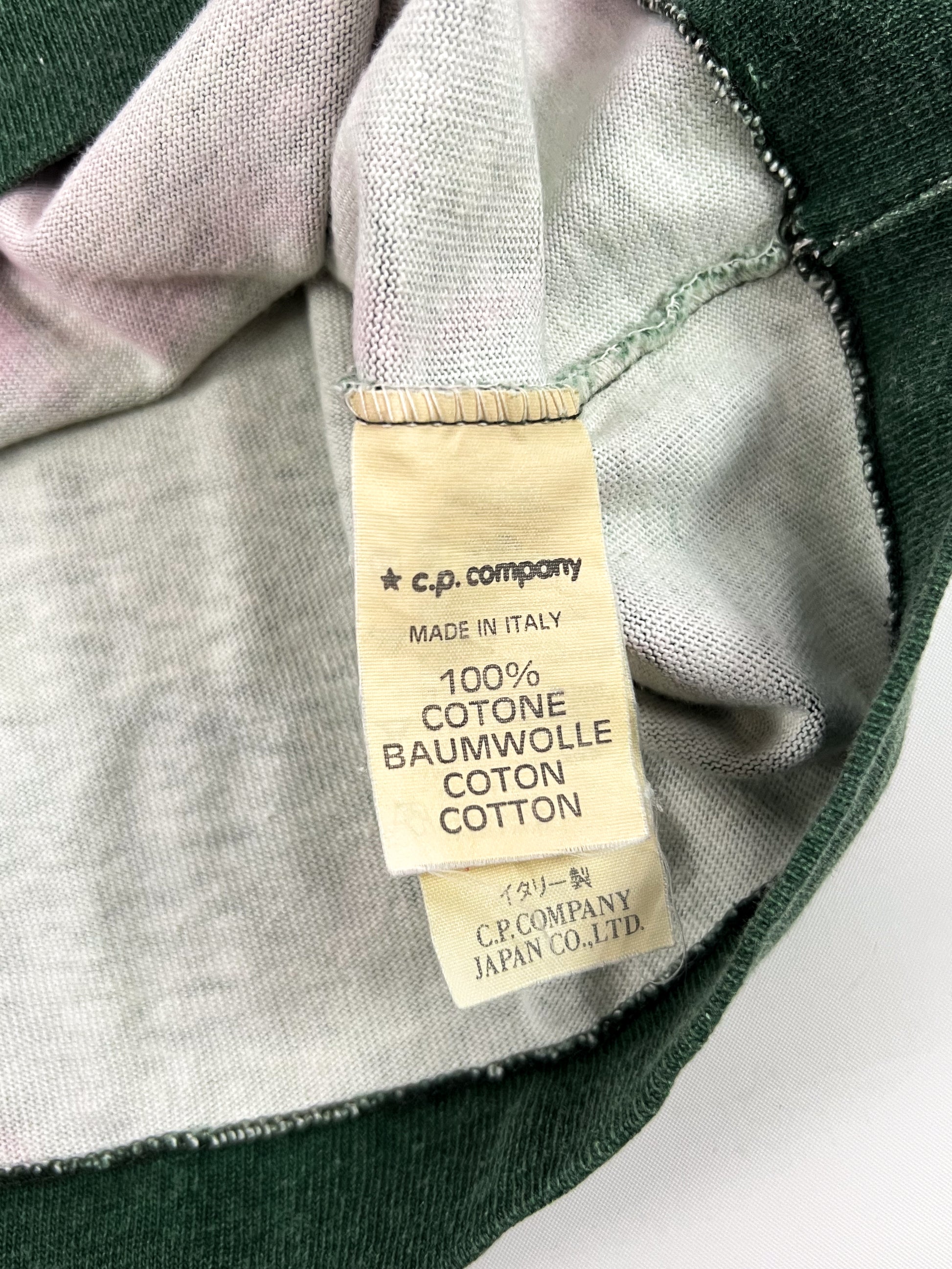 T-shirt vintage Stone Island risalente agli anni ’80, periodo produzione C.P. Company, come indicato dalle etichette originali interne. Un capo raro e da collezione, rappresentativo delle prime sperimentazioni del brand sotto la direzione di Massimo Osti.