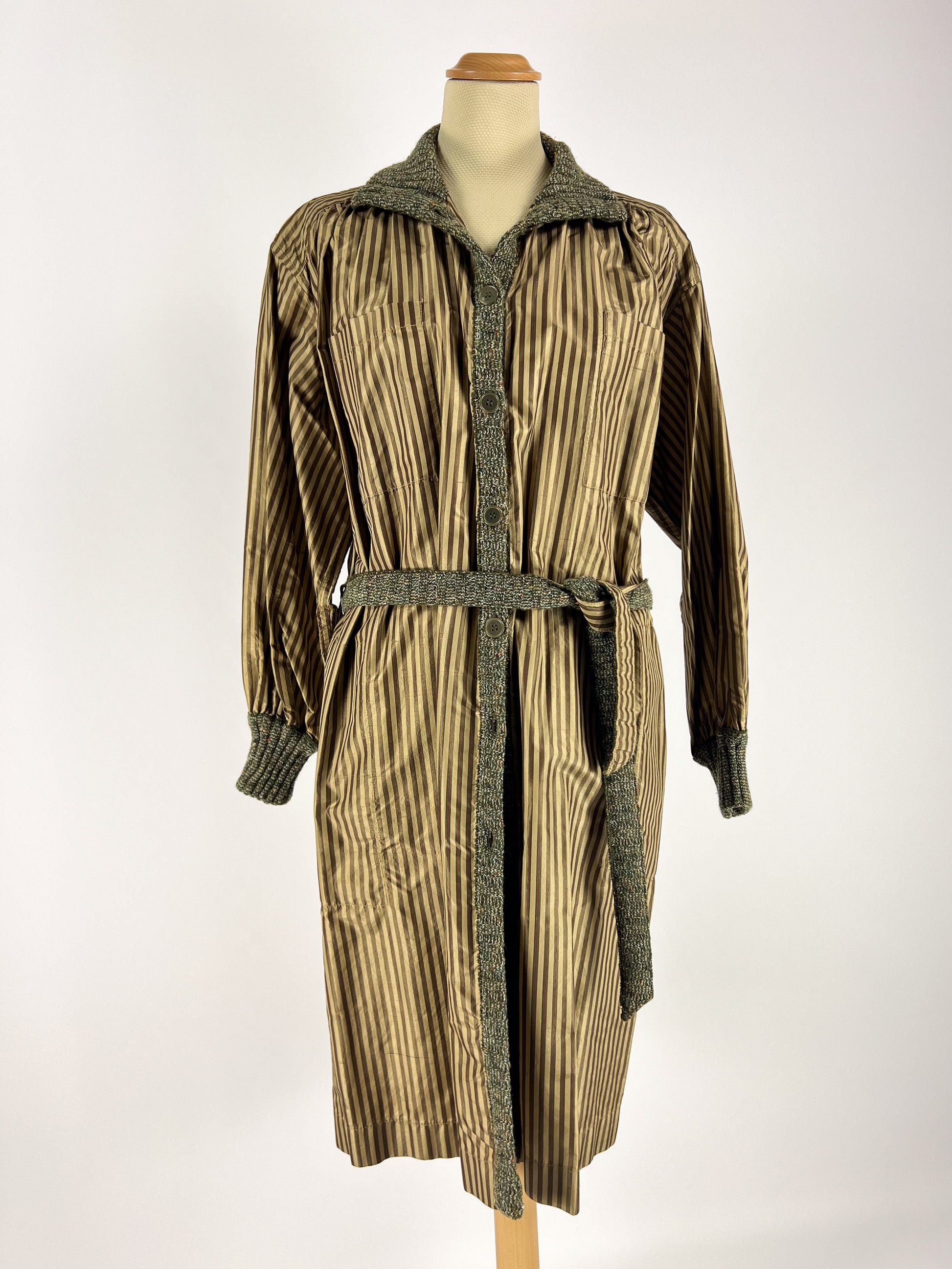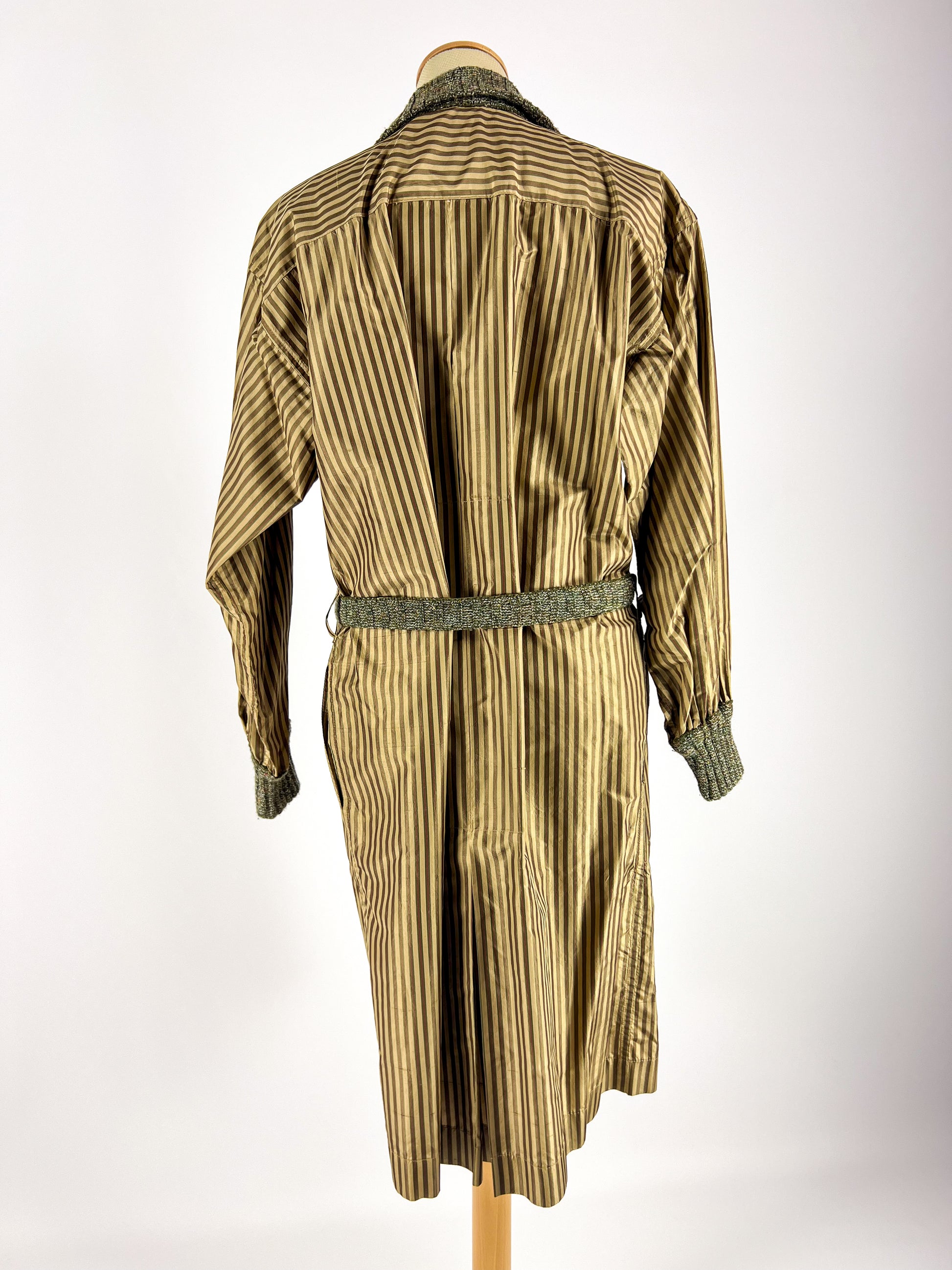Raro trench vintage Missoni anni ’70, realizzato in 100% seta con un’elegante fantasia a righe verticali nei toni del kaki, verde oliva e rosso bruciato. Il capo è arricchito da inserti in maglia bouclé tono su tono su colletto, paramontura, polsini e cintura, che creano un gioco di texture tipico della lavorazione Missoni dell’epoca.