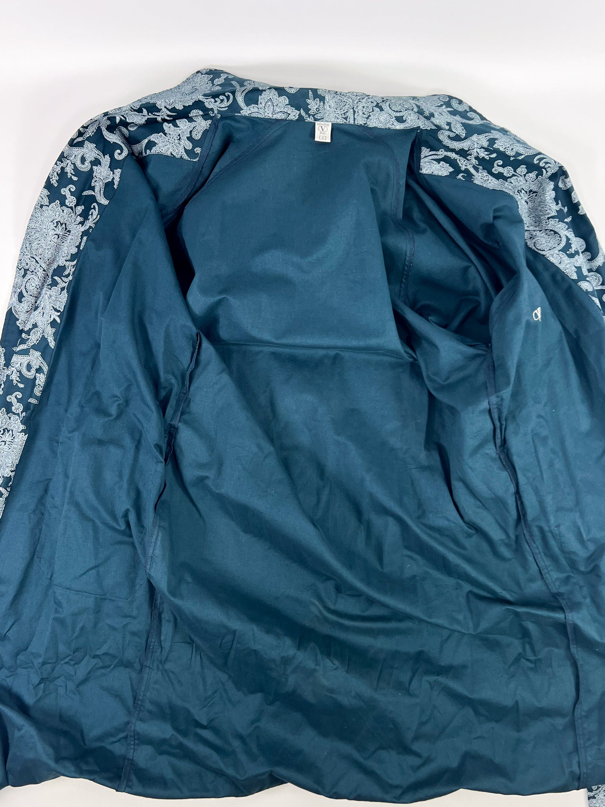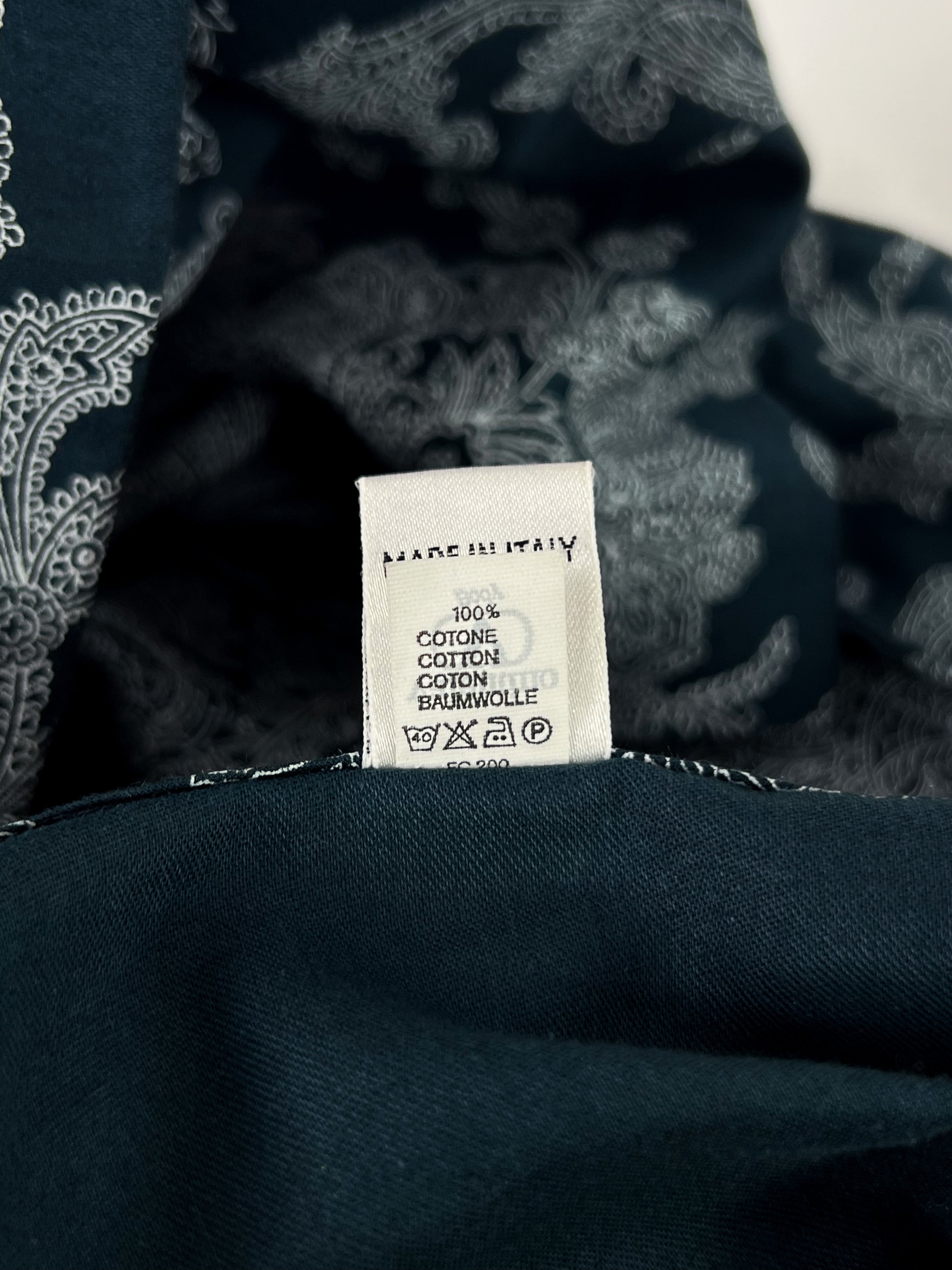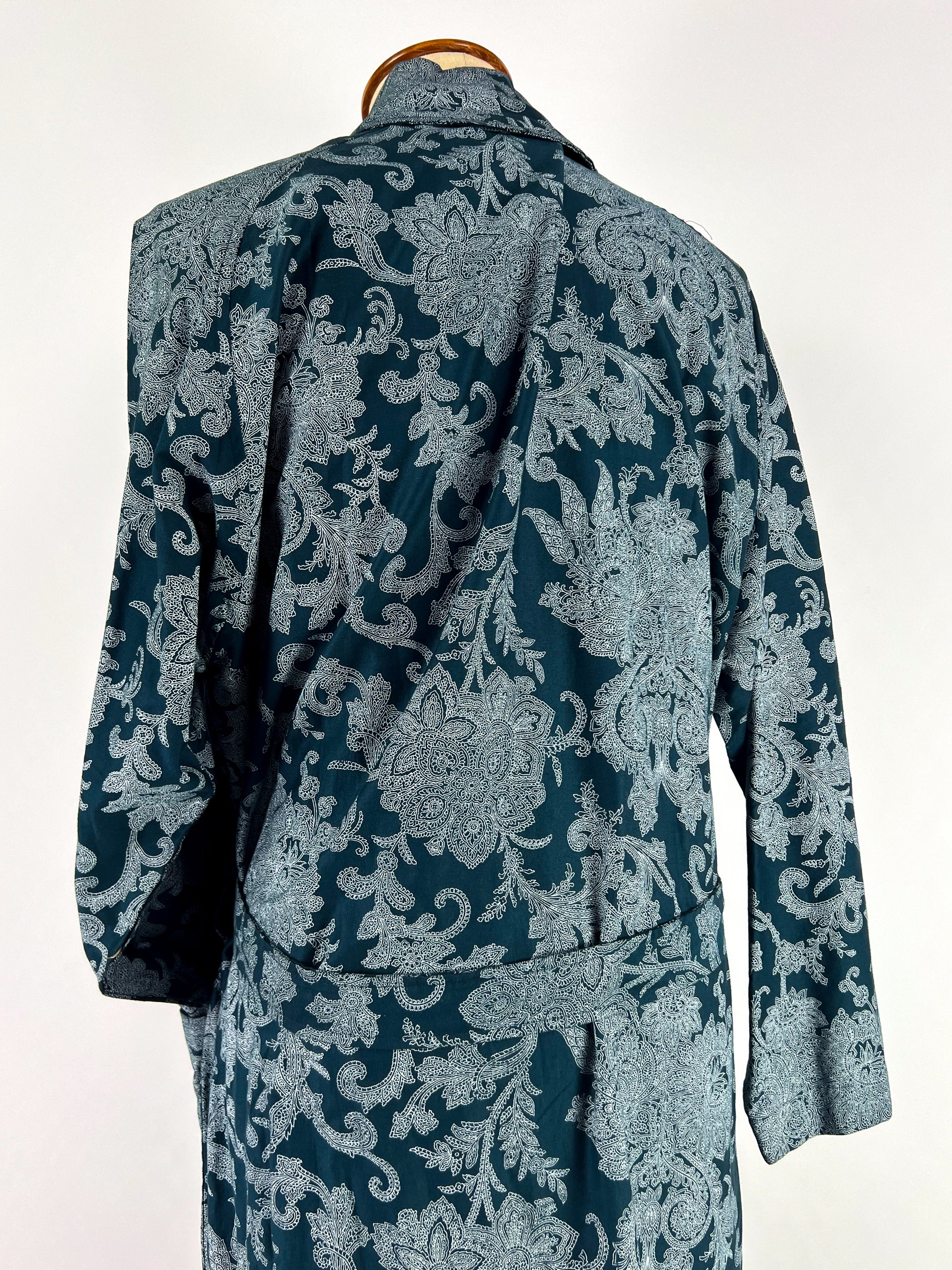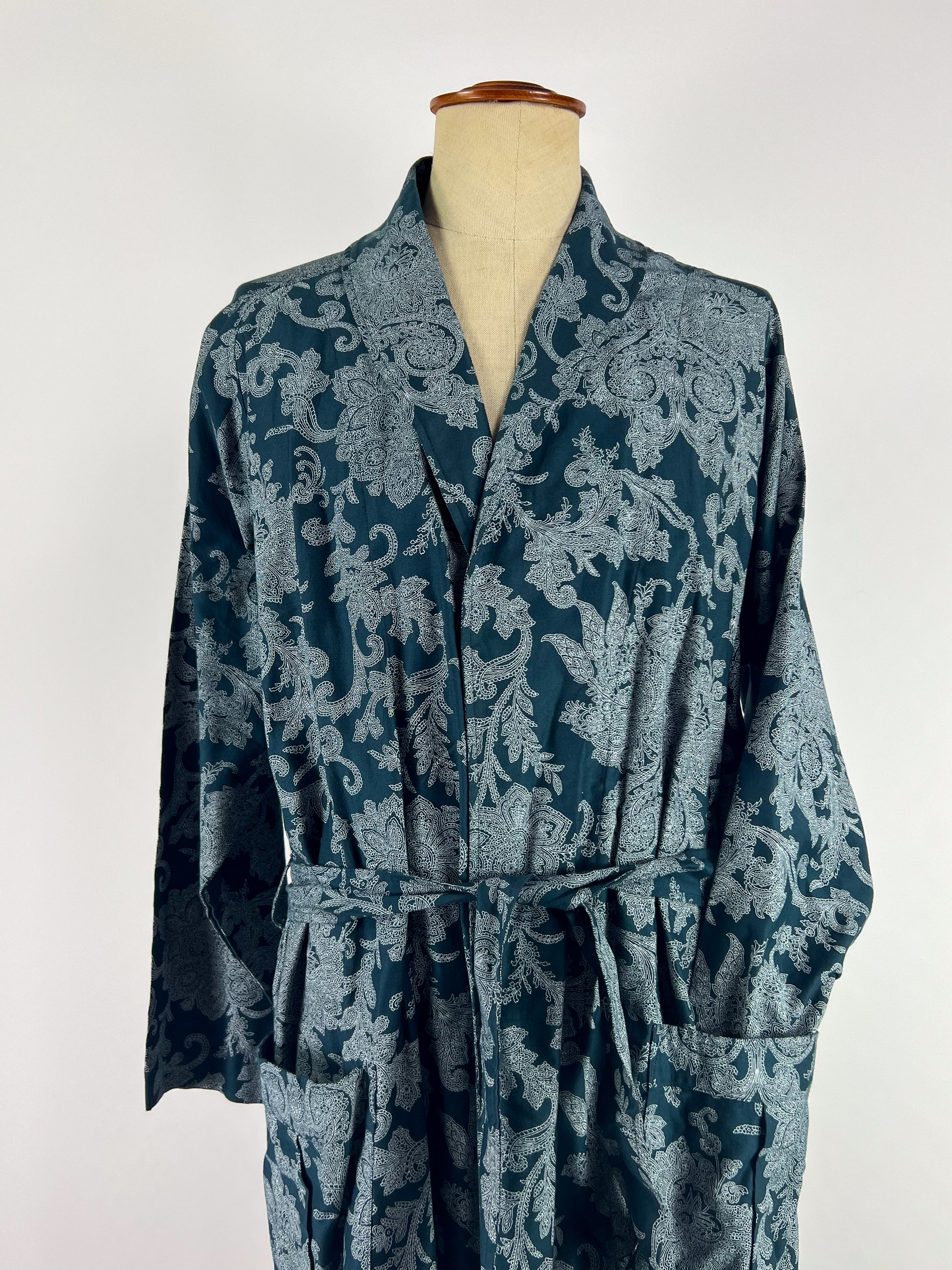 Elegante vestaglia vintage Valentino realizzata in 100% cotone e caratterizzata da un raffinato motivo paisley sui toni del verde petrolio e del bianco. Modello con cintura in vita, tasche applicate e linea morbida, tipica dell’abbigliamento homewear di alta gamma.