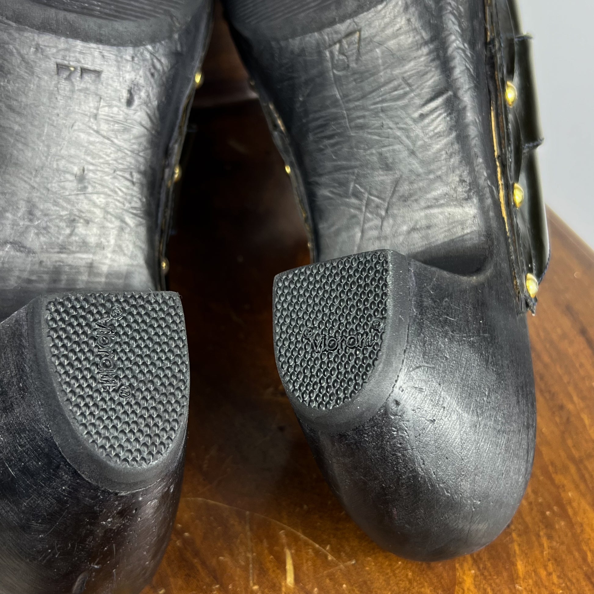 Sabot Gucci primi '00 in legno e pelle nera lucida con dettagli dorati, le suole sono state professionalmente rinnovate e la pelle lucidata.